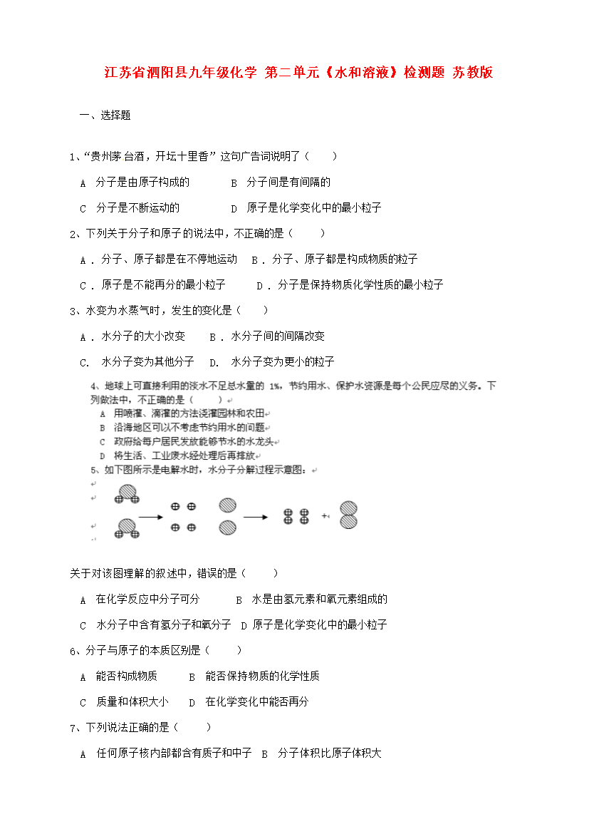 江苏省泗阳县九年级化学第二单元《水和溶液》检测题苏教版一、选择题1、“贵州茅台酒,开坛十里香”这句广告词说明了()A分子是由原子构成的B分子间是有间隔的C分子是不断运动的D原子是化学变化中的最小粒子2、下列关于分子和原子的说法中,不正确的是()A.分子、原子都是在不停地运动B.分子、原子都是构成物质的粒子C.原子是不能再分的最小粒子D.分子是保持物质化学性质的最小粒子3、水变为水蒸气时,发生的变化是()A.水分子的大小改变B.水分子间的间隔改变C.水分子变为其他分子D.水分子变为更小的粒子关于对该图理解的
