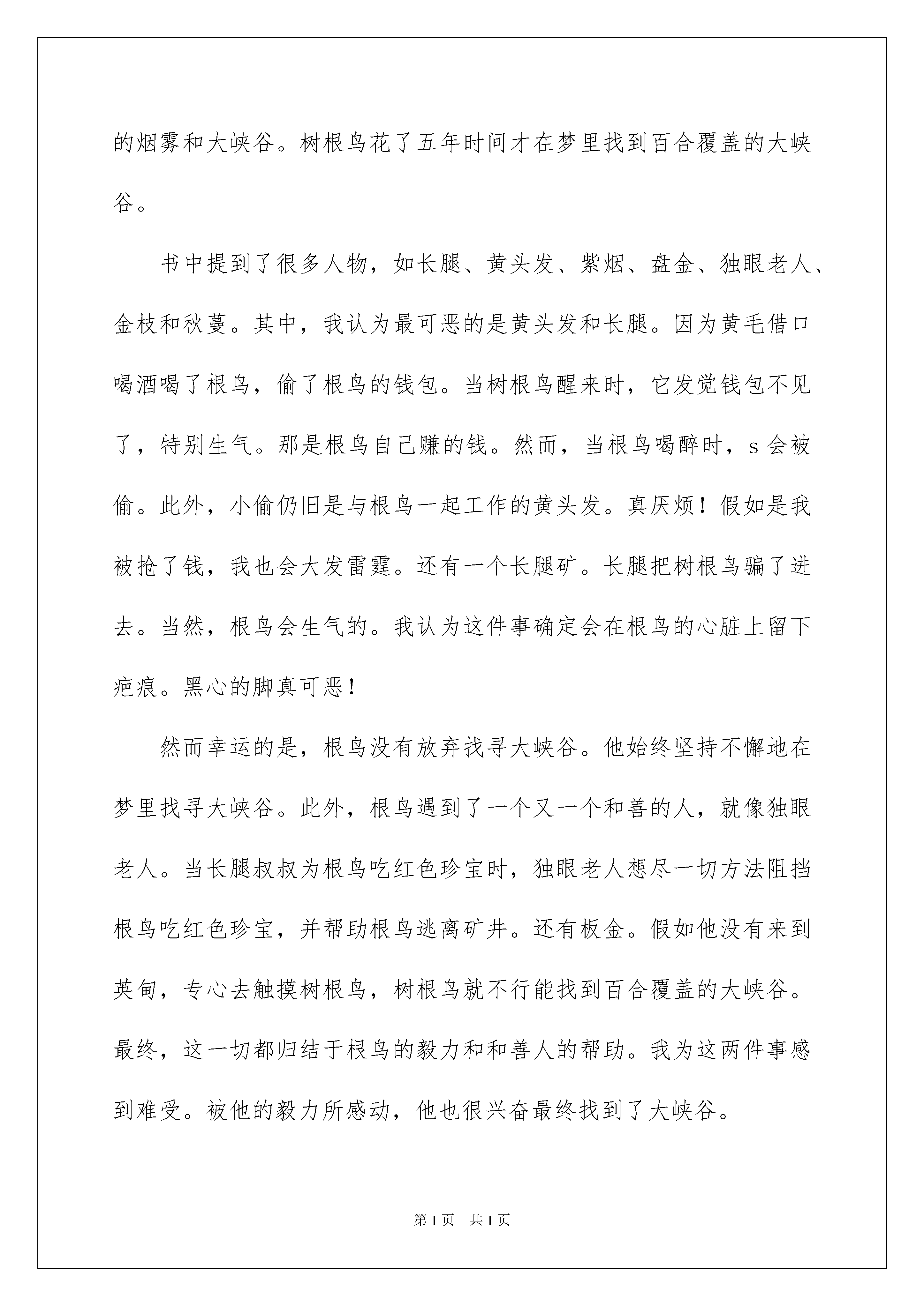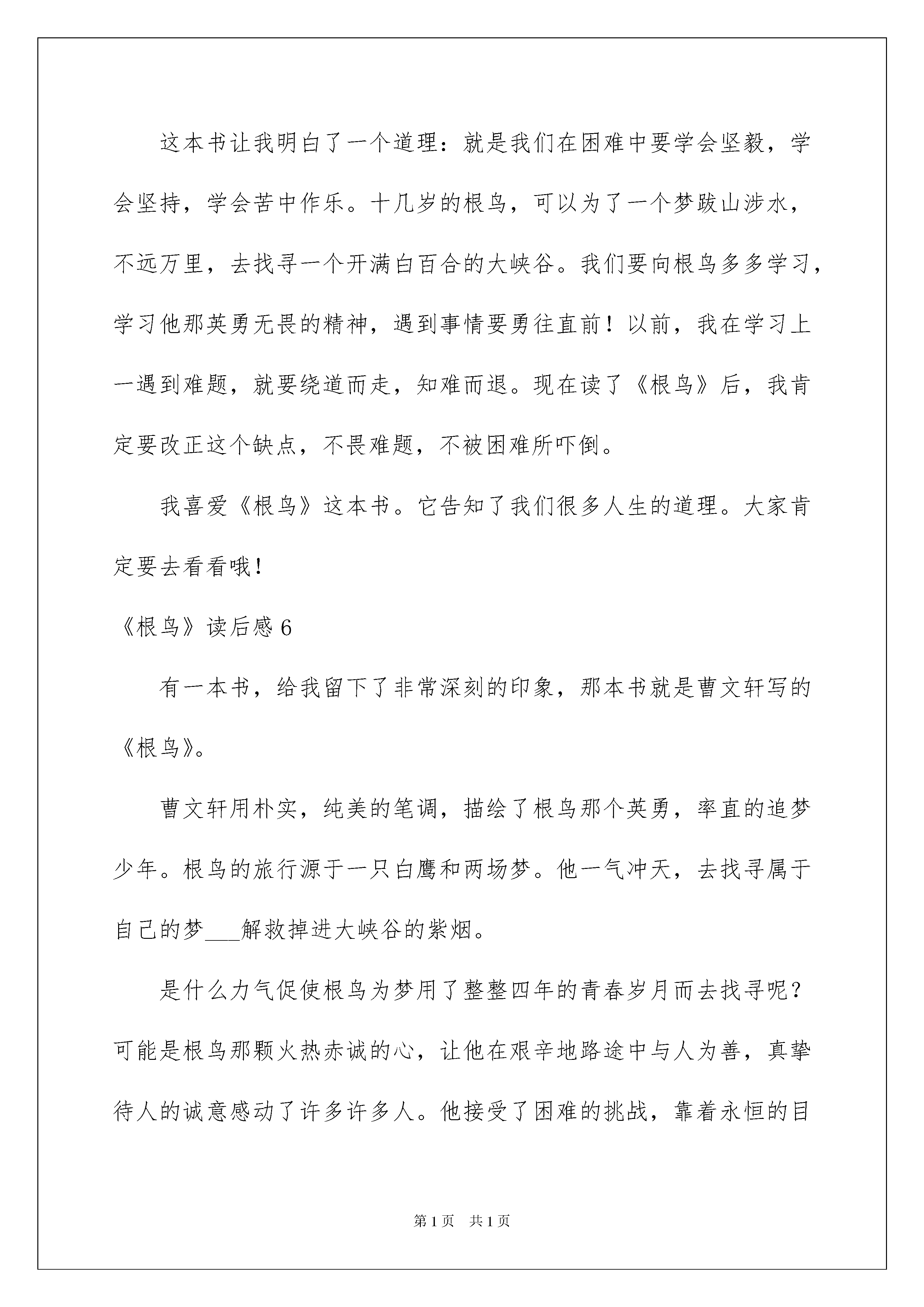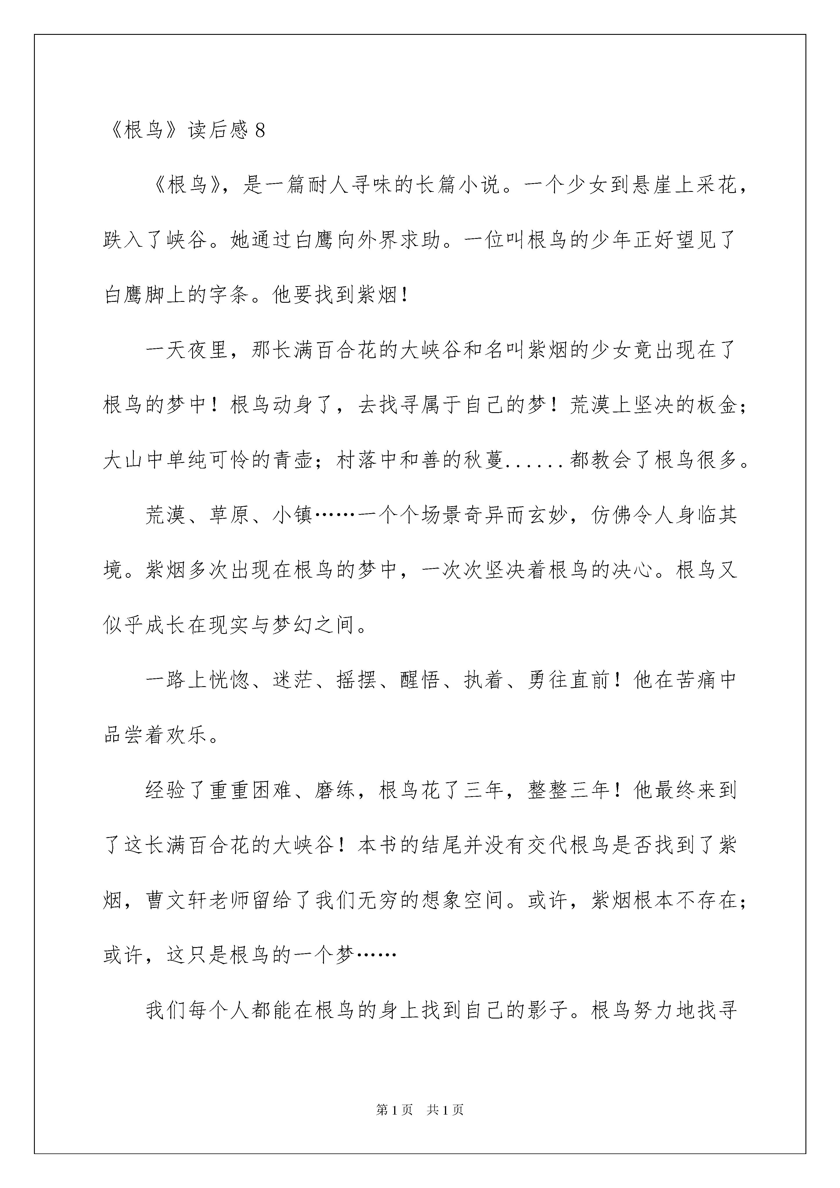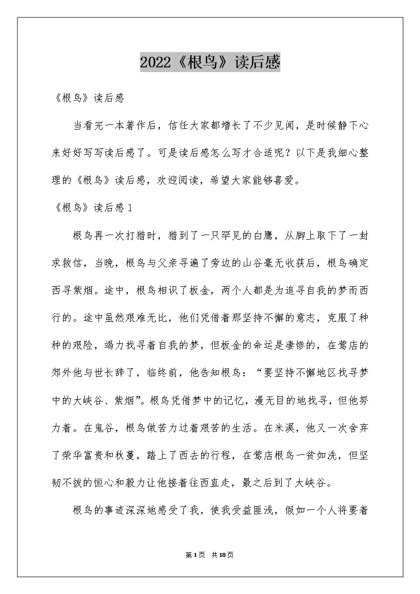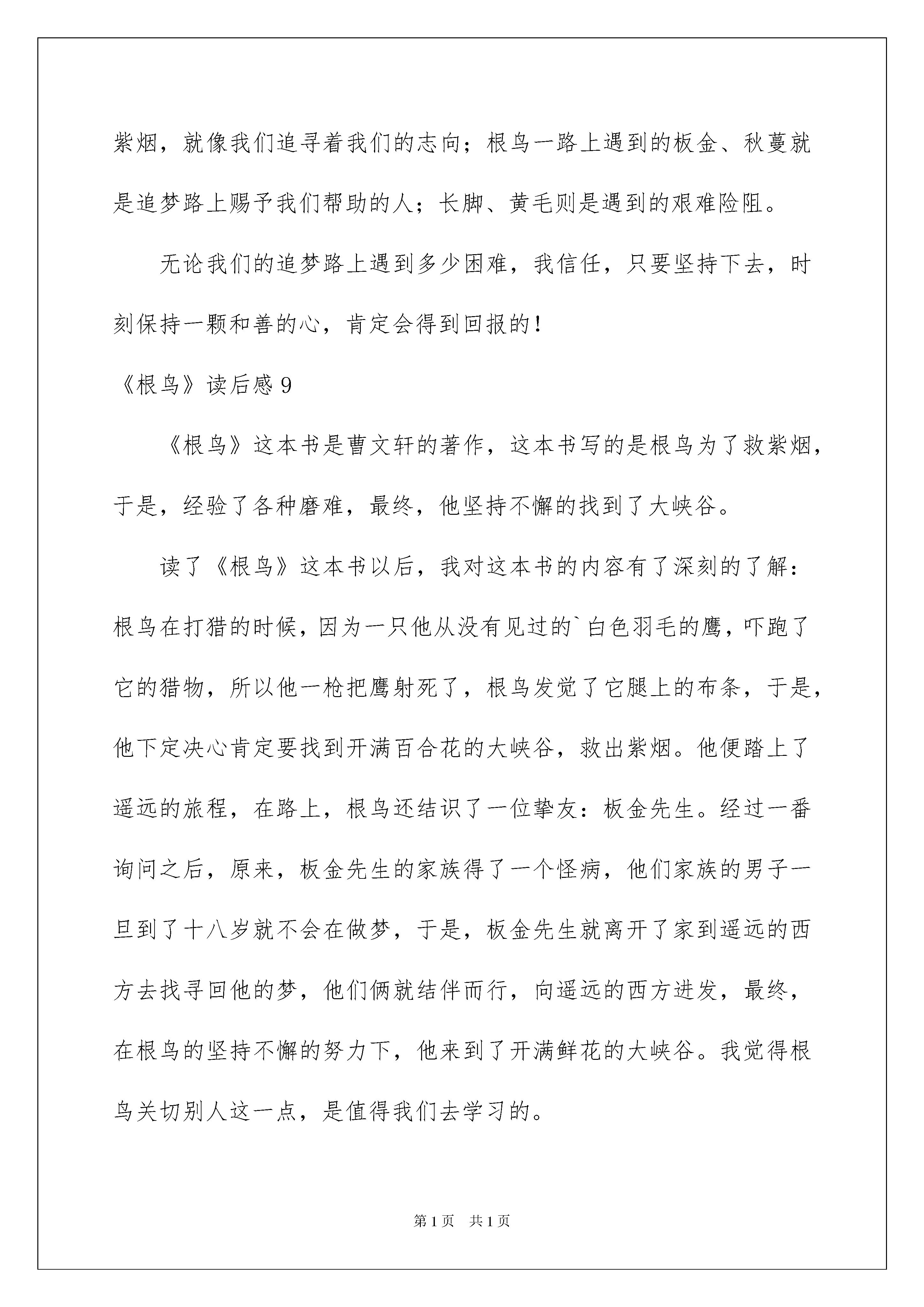 2022《根鸟》读后感《根鸟》读后感当看完一本著作后,信任大家都增长了不少见闻,是时候静下心来好好写写读后感了。可是读后感怎么写才合适呢?以下是我细心整理的《根鸟》读后感,欢迎阅读,希望大家能够喜爱。《根鸟》读后感1根鸟再一次打猎时,猎到了一只罕见的白鹰,从脚上取下了一封求救信,当晚,根鸟与父亲寻遍了旁边的山谷毫无收获后,根鸟确定西寻紫烟。途中,根鸟