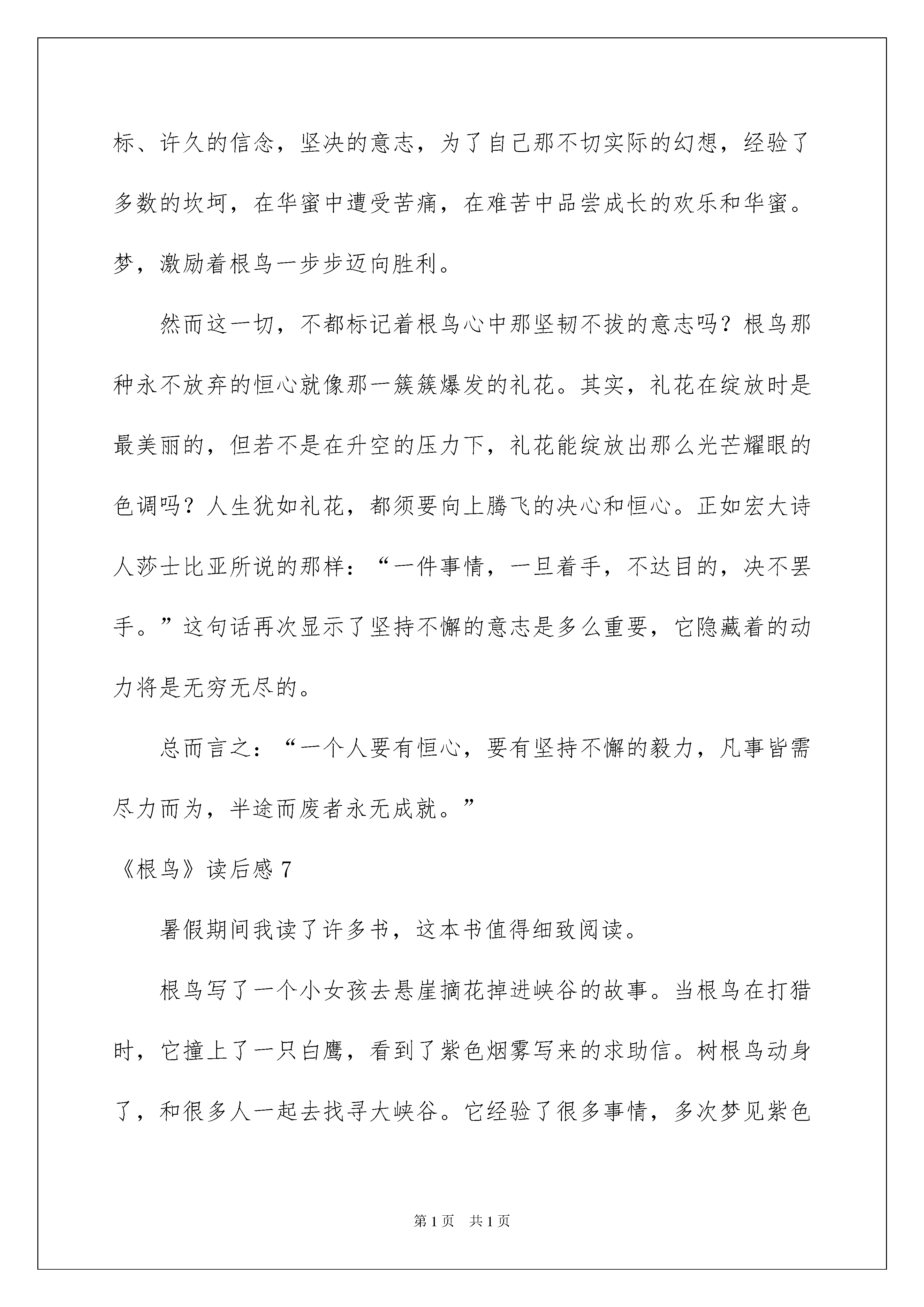 2022《根鸟》读后感《根鸟》读后感当看完一本著作后,信任大家都增长了不少见闻,是时候静下心来好好写写读后感了。可是读后感怎么写才合适呢?以下是我细心整理的《根鸟》读后感,欢迎阅读,希望大家能够喜爱。《根鸟》读后感1根鸟再一次打猎时,猎到了一只罕见的白鹰,从脚上取下了一封求救信,当晚,根鸟与父亲寻遍了旁边的山谷毫无收获后,根鸟确定西寻紫烟。途中,根
