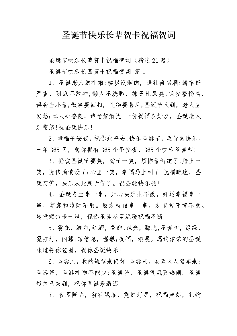 圣诞节快乐长辈贺卡祝福贺词圣诞节快乐长辈贺卡祝福贺词(精选21篇)圣诞节快乐长辈贺卡祝福贺词篇11、圣诞老人送礼难:楼房没烟囱,送礼得凿洞;堵车好严重,驯鹿不敢冲;懒人不洗脚,袜子比屎臭;保安警惕高,误会当小偷;做事要回扣,礼物要售后;圣诞节又到,老人直发愁;本人心善良,帮忙解解忧;一份祝福发好友,圣诞老人乐悠悠!祝圣诞快乐!2、幸福平安夜,祝你永平安;快乐圣诞节,愿你常快乐。一年365天,愿你拥有365个平安夜、365个快乐圣诞节!3、据说圣诞节要笑,嘴角一笑,烦恼偷偷跑了;脸上一笑,忧伤悄悄没了;心里