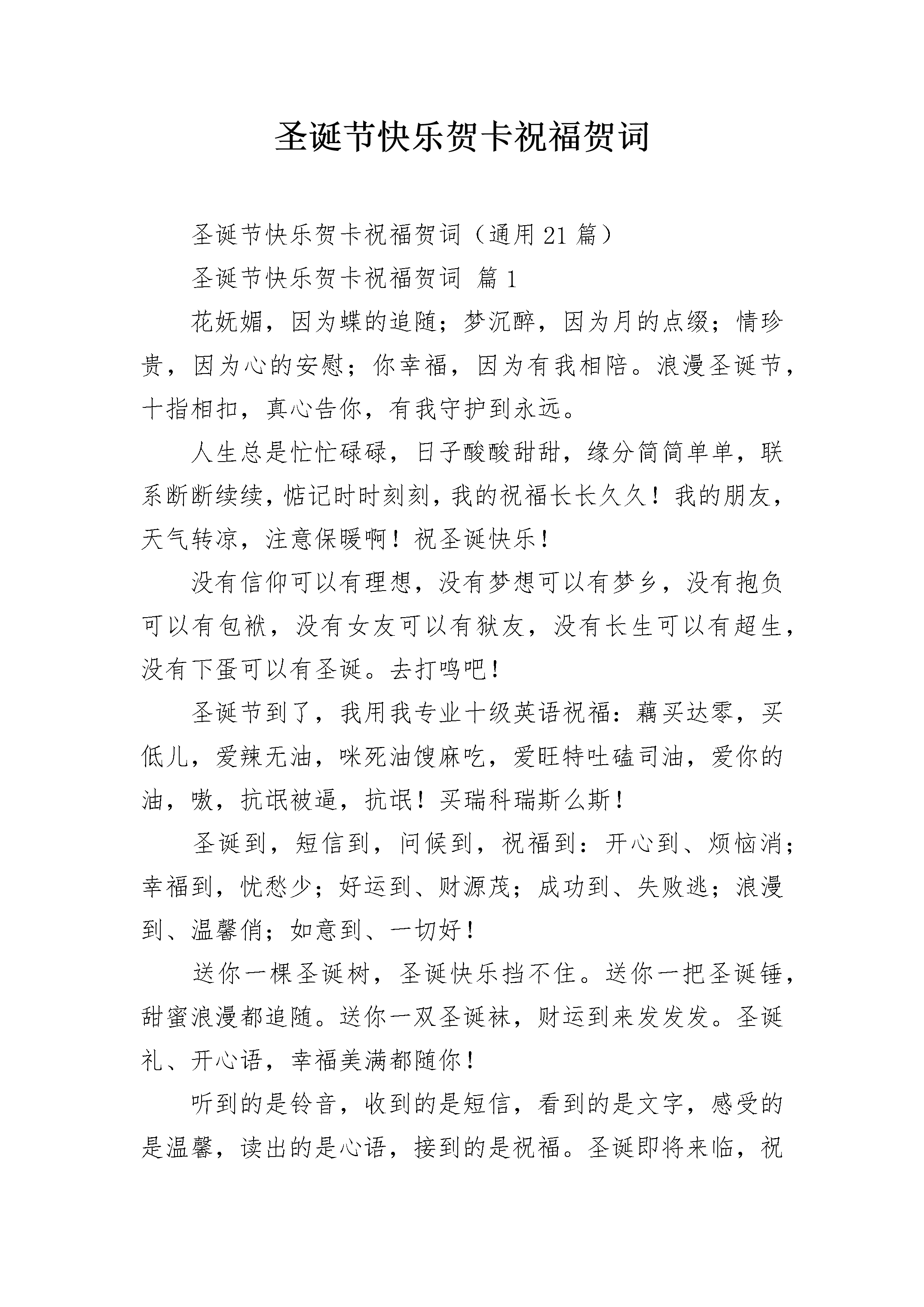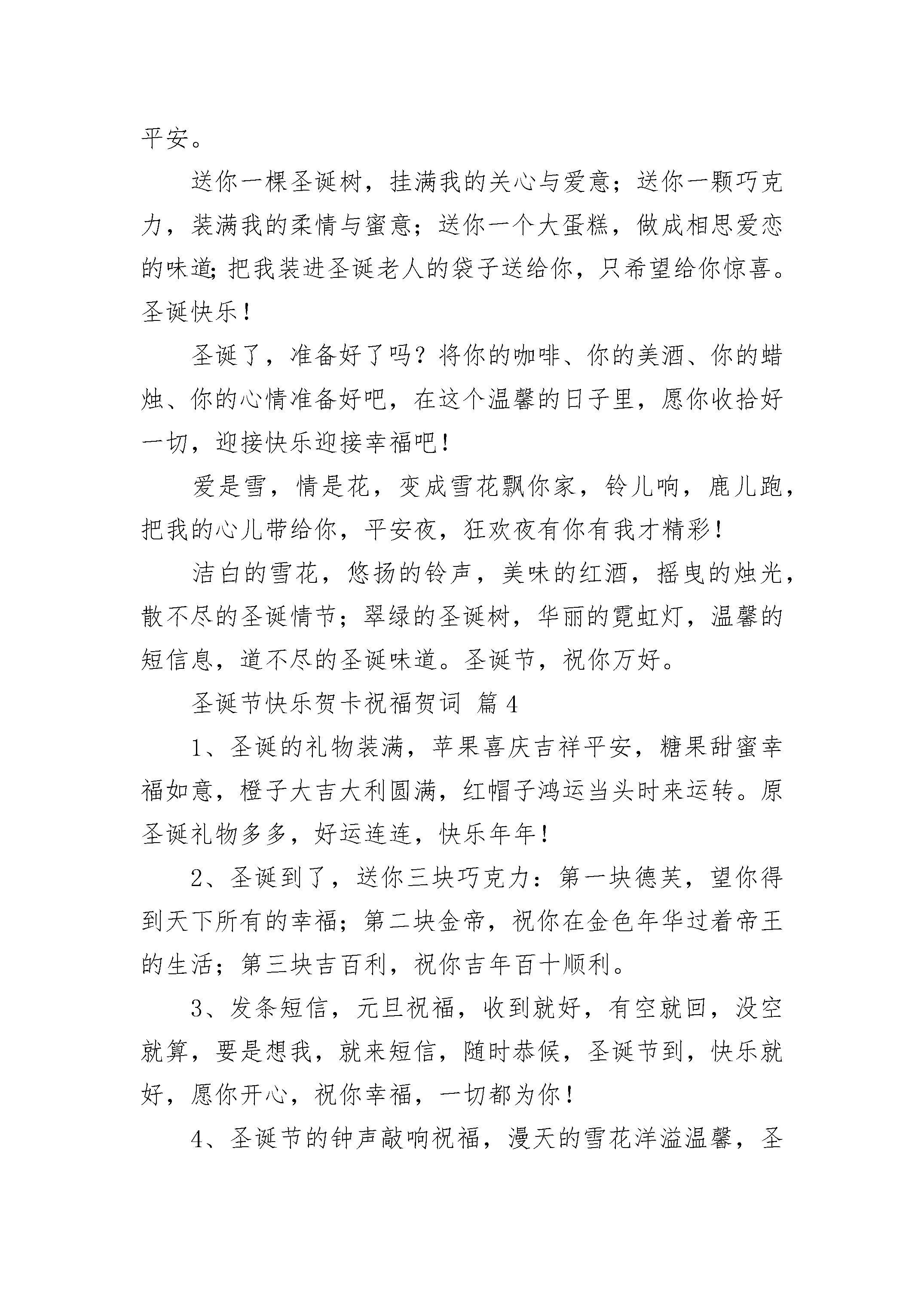 圣诞节快乐贺卡祝福贺词圣诞节快乐贺卡祝福贺词(通用21篇)圣诞节快乐贺卡祝福贺词篇1花妩媚,因为蝶的追随;梦沉醉,因为月的点缀;情珍贵,因为心的安慰;你幸福,因为有我相陪。浪漫圣诞节,十指相扣,真心告你,有我守护到永远。人生总是忙忙碌碌,日子酸酸甜甜,缘分简简单单,联系断断续续,惦记时时刻刻,我的祝福长长久久!我的朋友,天气转凉,注意保暖啊!祝圣诞快乐!没有信仰可以有理想,没有梦想可以有梦乡,没有抱负可以有包袱,没有女友可以有狱友,没有长生可以有超生,没有下蛋可以有圣诞。去打鸣吧!圣诞节到了,我用我专业十