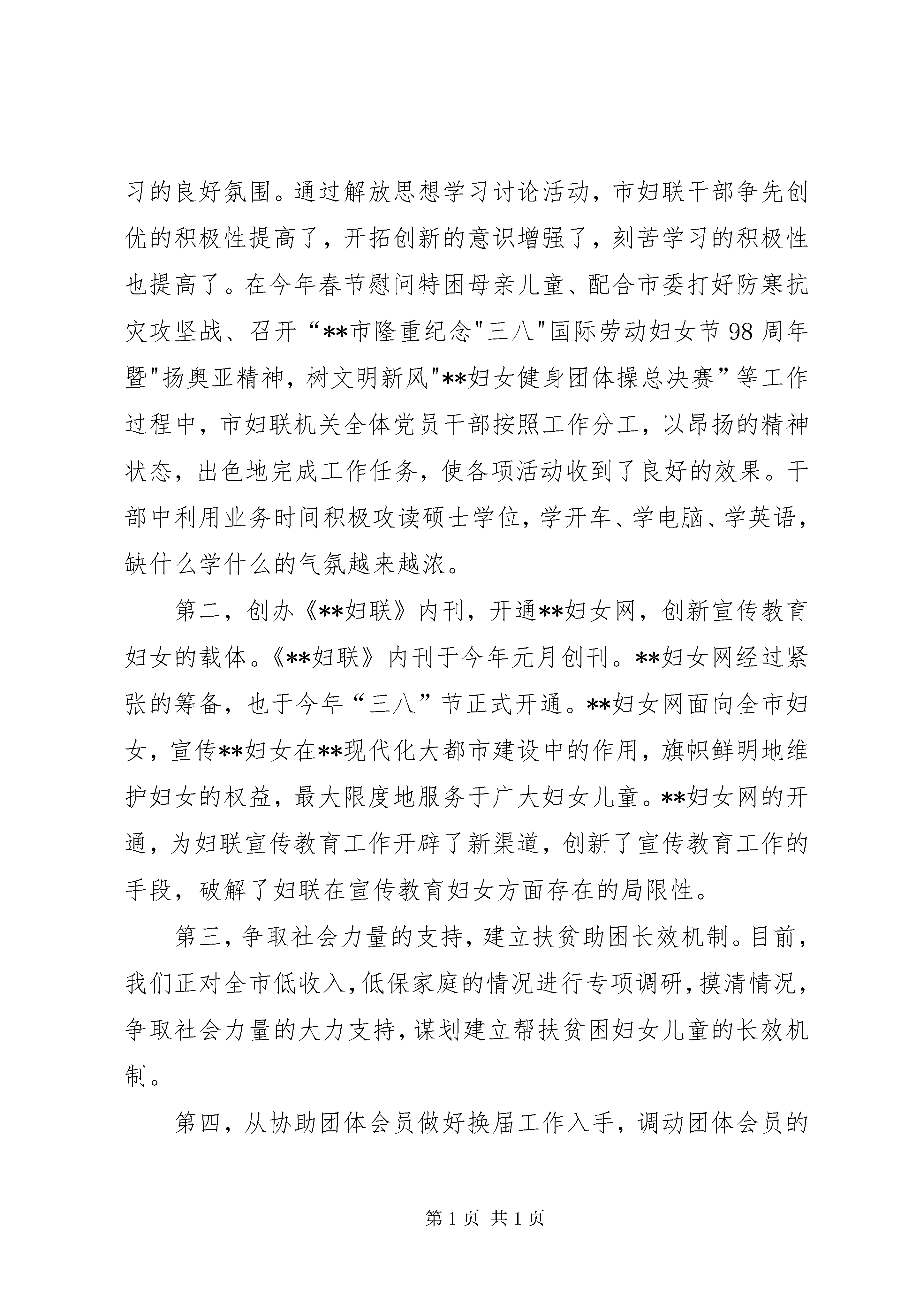 学习落实活动情况汇报省委十届二次、市委九届四次全会以来市妇联按照盛市委关于“继续解放思想坚持改革开放努力争当实践科学发展观的排头兵”的部署在机关和下属事业单位中扎实开展了解放思想学习讨论活动。一、精心组织统一思想开创解放思想学习讨论活动新局面《中共**市委关于开展“继续解放思想坚持改革开放努力争当实践科学发展观的排头兵”学习讨论活动的实施意见》发出后市妇联党组把解放思想学习讨论活动作为当前一项重要的政治任务摆上议事日程。迅速成立了以市妇联党组书记、主席李建兰为组长