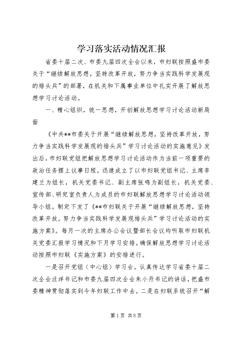 学习落实活动情况汇报学习落实活动情况汇报十届二次、九届四次全会以来,市妇联按照盛关于“继续解放思想,坚持改革开放,努力争当实践科学发展观的排头兵”的部署,在机关和下属事业单位中扎实开展了解放思想学习讨论活动。一、精心组织,统一思想,开创解放思想学习讨论活动新局面《中共**关于开展“继续解放思想,坚持改革开放,努力争当实践科学发展观的排头兵”学习讨论活动的实施意见》发出后,市妇联党组把解放思想学习讨论活动作为当前一项重要的政治任务摆上议事日程。迅速成立了以市妇联党组书记、主席李建兰为组长,机关党委书记、副主