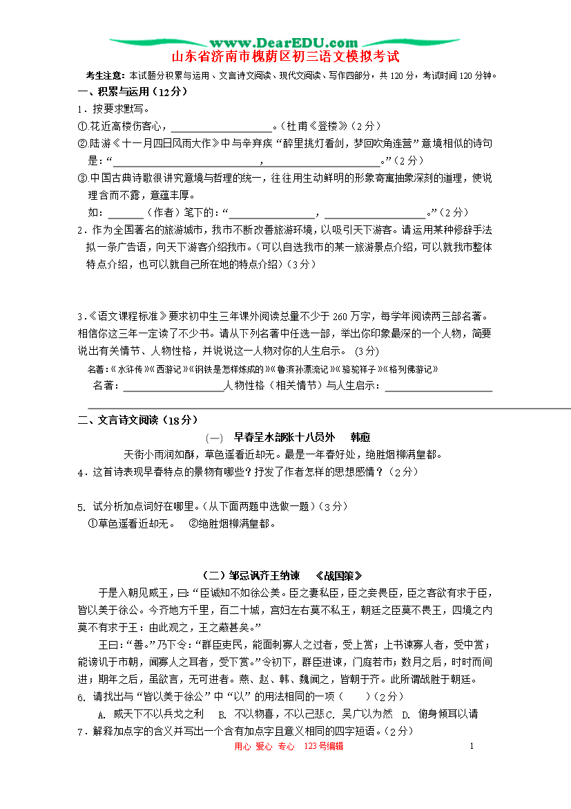 用心爱心专心123号编辑1山东省济南市槐荫区初三语文模拟考试考生注意:本试题分积累与运用、文言诗文阅读、现代文阅读、写作四部分,共120分,考试时间120分钟。一、积累与运用(12分)1.按要求默写。①.花近高楼伤客心,。(杜甫《登楼》)(2分)②.陆游《十一月四日风雨大作》中与辛弃疾“醉里挑灯看剑,梦回吹角连营”意境相似的诗句是:“,。”(2分)③.中国古典诗歌很讲究意境与哲理的统一,往往用生动鲜明的形象寄寓抽象深刻的道理,使说理含而不露,意蕴丰厚。如:(作者)笔下的:“,。”(2分)2.作为全国著名的