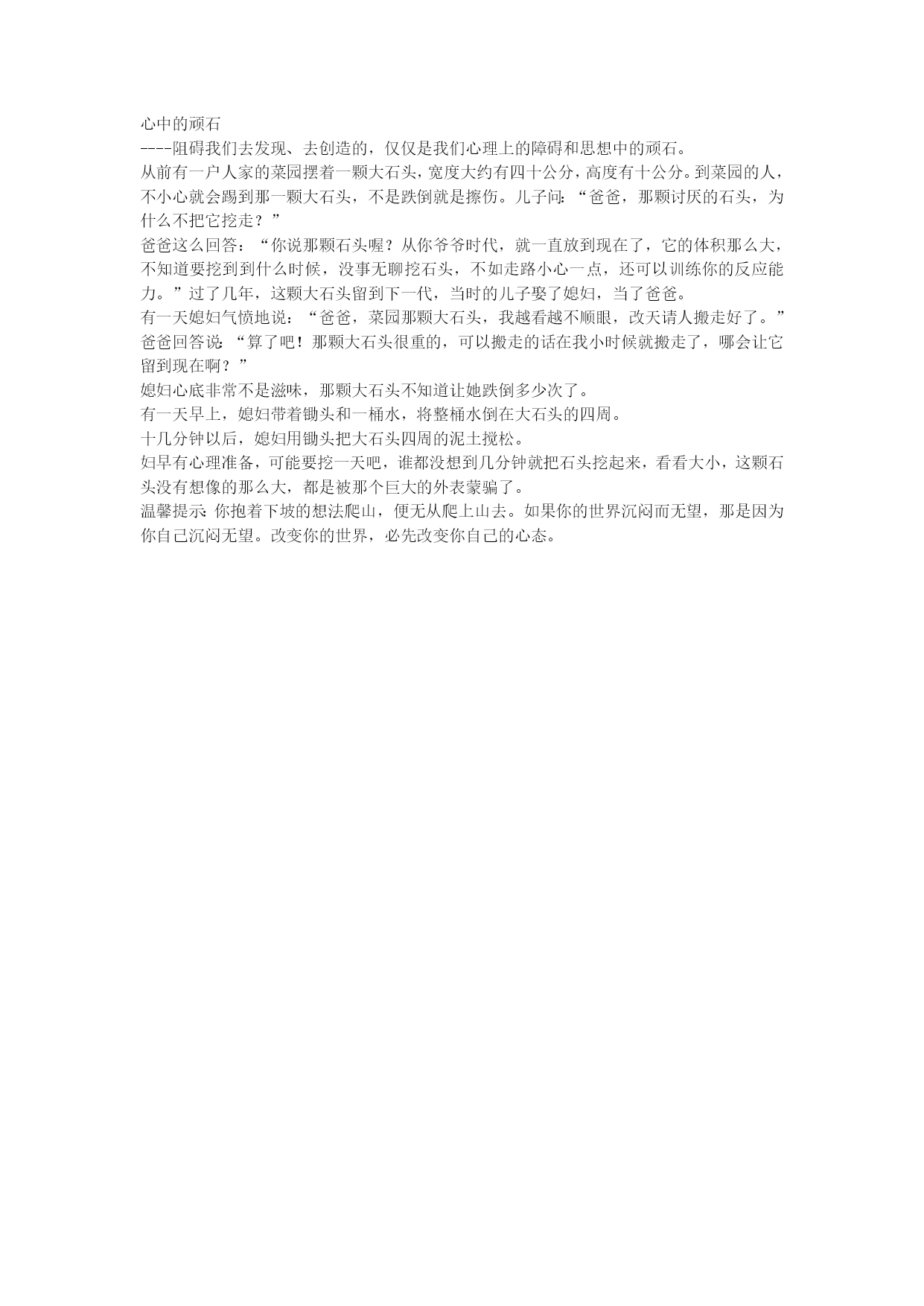 此资料由网络收集而来如有侵权请告知上传者立即删除。资料共分享我们负责传递知识。心中的顽石心中的顽石阻碍我们去发现、去创造的仅仅是我们心理上的障碍和思想中的顽石。从前有一户人家的菜园摆着一颗大石头宽度大约有四十公分高度有十公分。到菜园的人不小心就会踢到那一颗大石头不是跌倒就是擦伤。儿子问:“爸爸那颗讨厌的石头为什么不把它挖走?”爸爸这么回答:“你说那颗石头喔?从你爷爷时代就一直放到现在了它的体积那么大不知道要挖到到什么时候没事无聊挖石头不如走路小心一点还可以训练你的反应能力。”过了几年这颗大石头留到下一