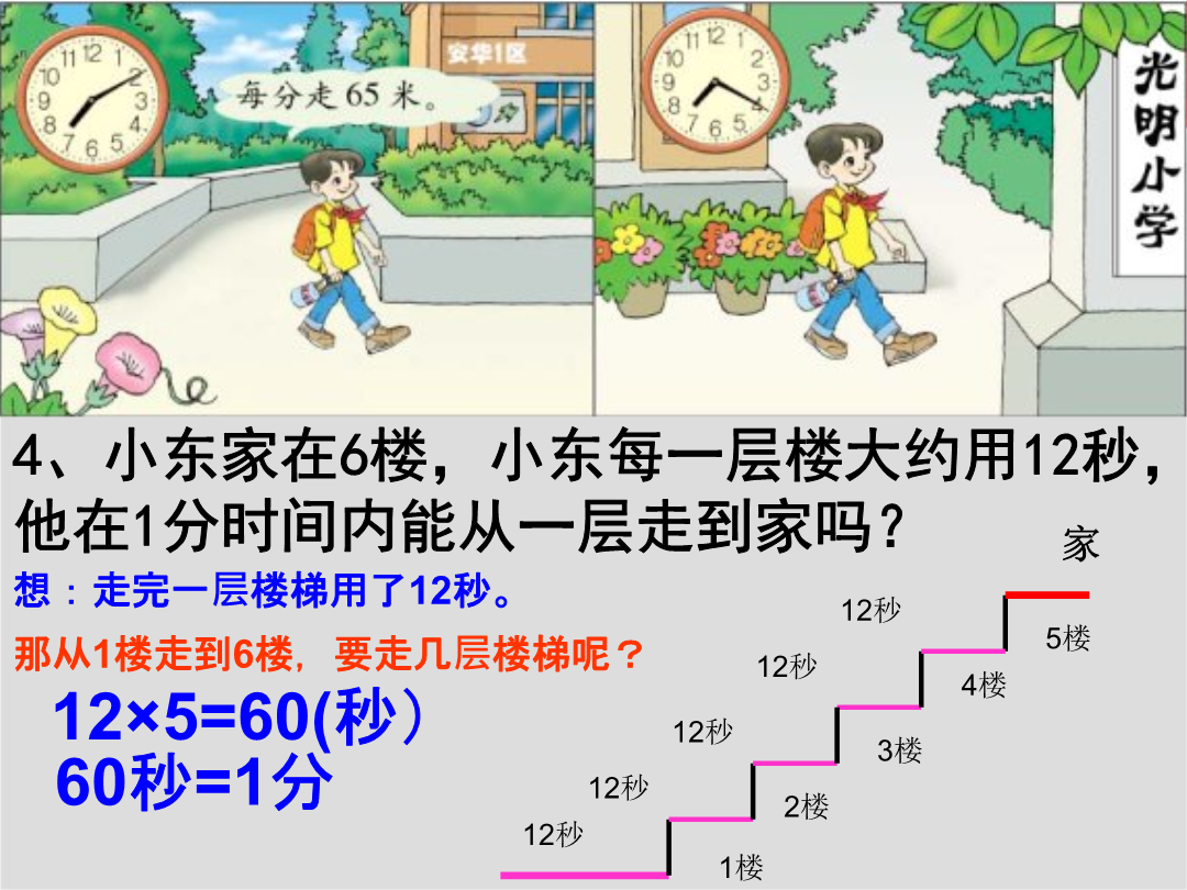 !1、小东家到学校大约有多少米?2、小东每天上学和放学至少走多少米?3、如果中午回家吃饭,小东每天上学、放学至少走多少米?4、小东家在6楼,小东每一层楼大约用12秒,他在1分时间内能从一层走到家吗?2、小东每天上学和放学至少走多少米?