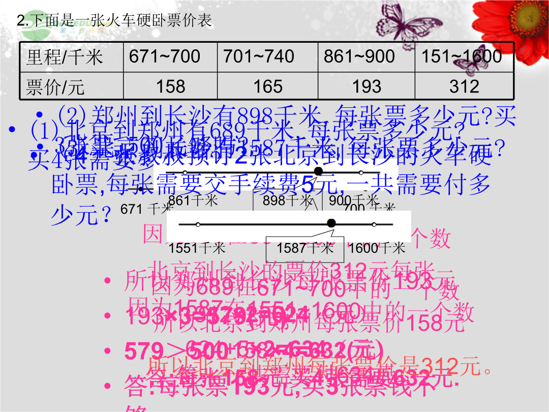 交通与数学1、小东家到学校大约有多少米?2、小东每天上学和放学至少走多少米?3、如果中午回家吃饭,小东每天上学、放学至少走多少米?4、小东家在6楼,小东每一层楼大约用12秒,他在1分时间内能从一层走到家吗?(1)北京到郑州有689千米,每张票多少元?买4张需要多少元?180米你知道吗再见