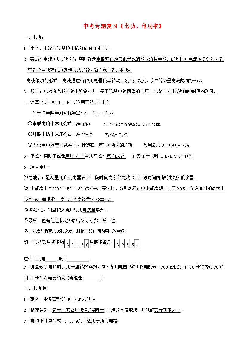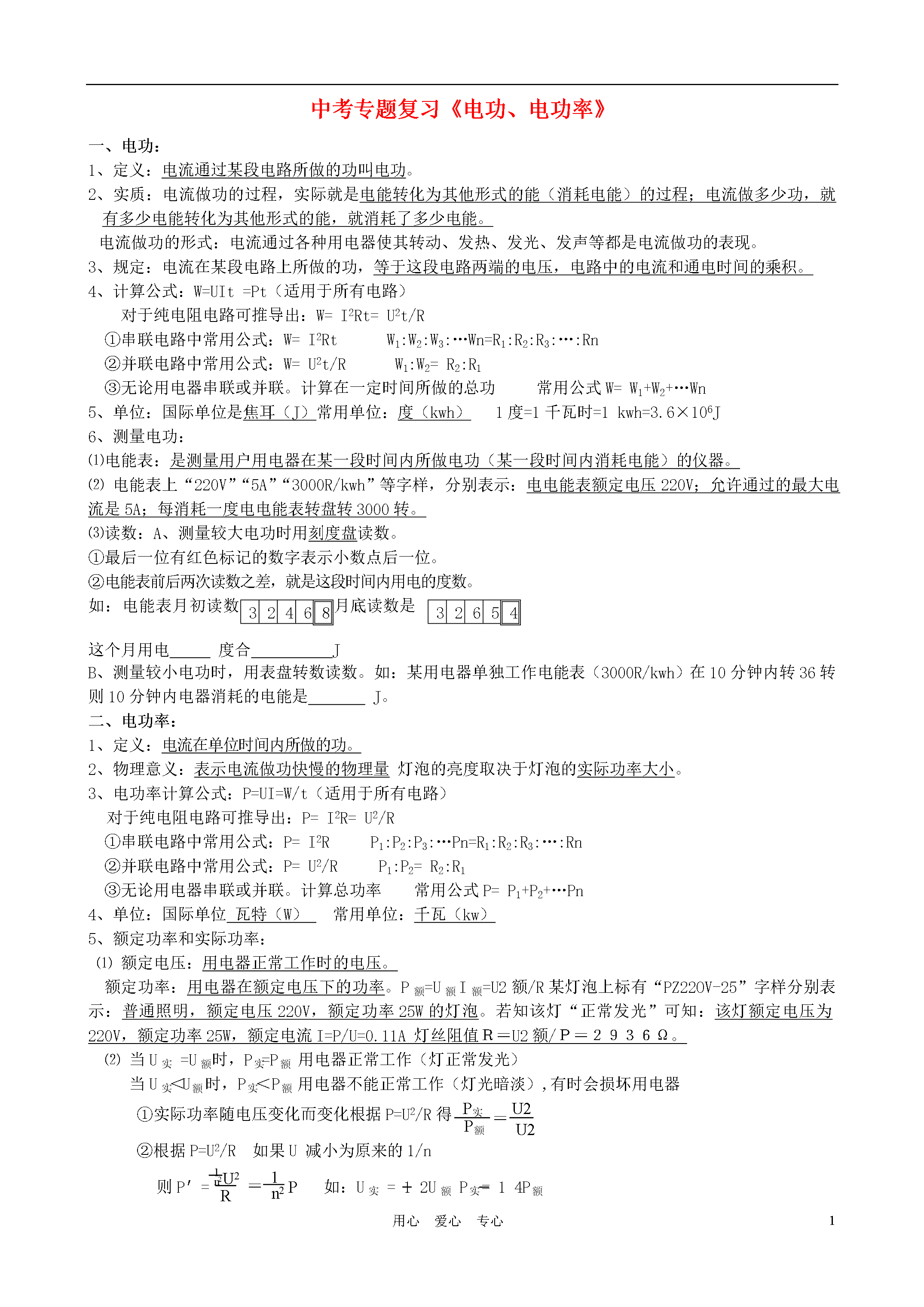 8用心爱心专心中考专题复习《电功、电功率》一、电功:1、定义:电流通过某段电路所做的功叫电功。2、实质:电流做功的过程,实际就是电能转化为其他形式的能(消耗电能)的过程;电流做多少功,就有多少电能转化为其他形式的能,就消耗了多少电能。电流做功的形式:电流通过各种用电器使其转动、发热、发光、发声等都是电流做功的表现。3、规定:电流在某段电路上所做的功,等于这段电路两端的电压,电路中的电流和通电时间的乘积。4、计算公式:W=UIt=Pt(适用于所有电路)对于纯电阻电路可推导出:W=I2Rt=U2t/R①串联电