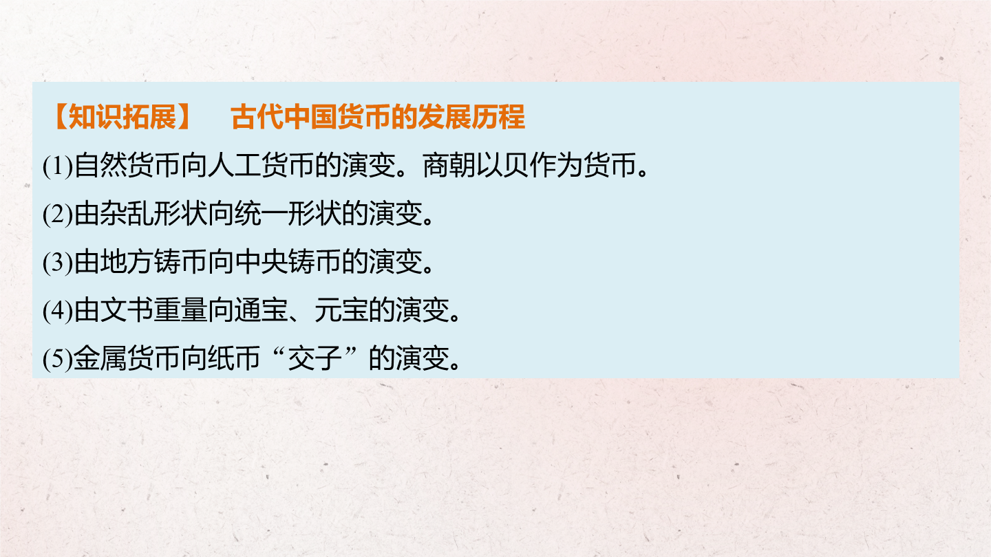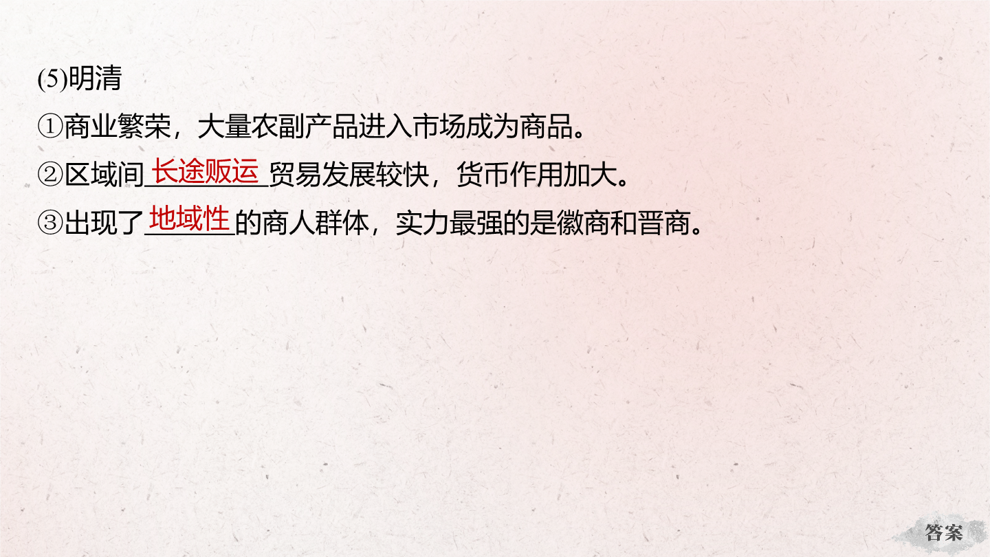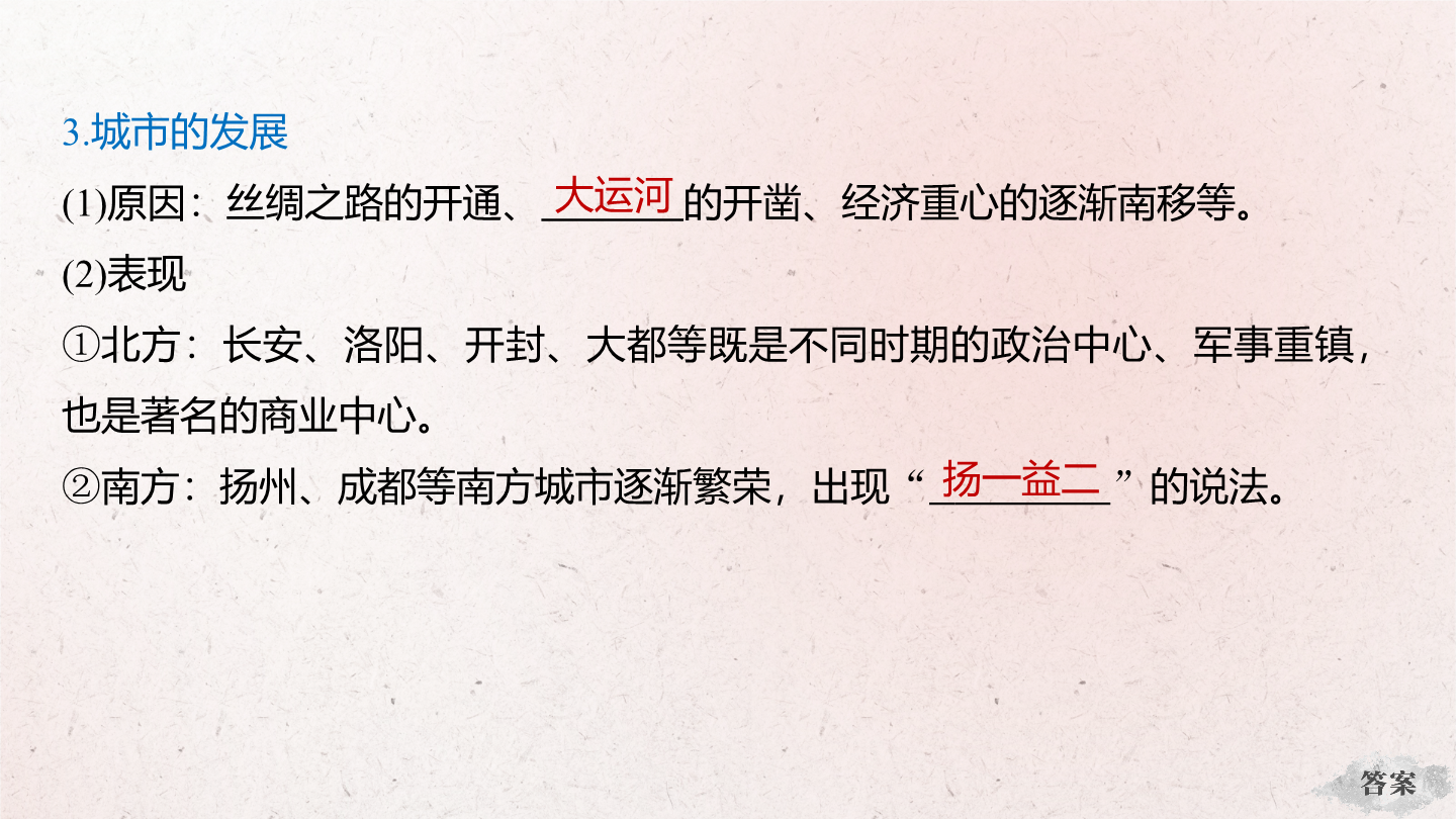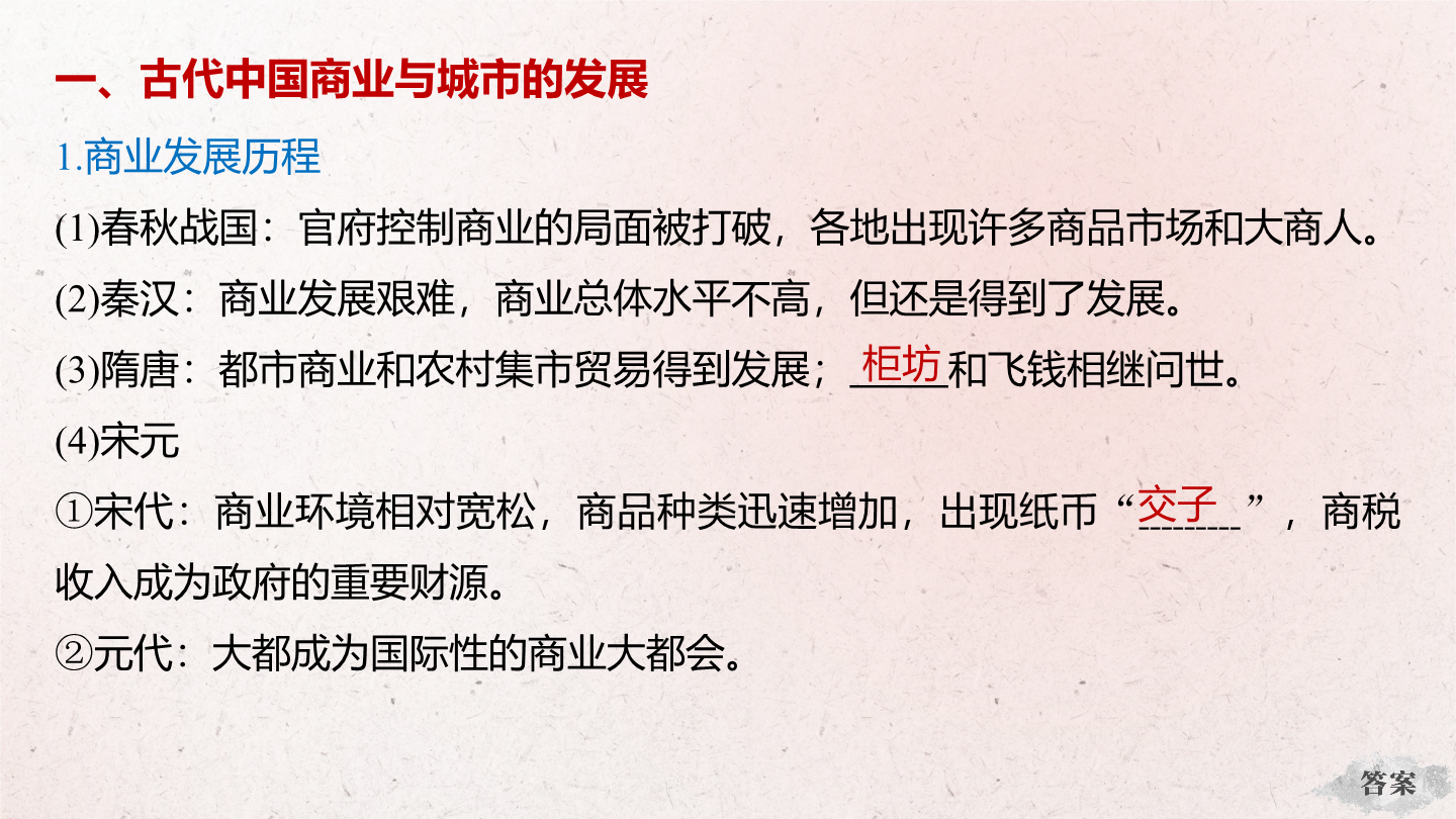 必修2第19讲命题时空坐标内容索引主干梳理断点弥补一、古代中国商业与城市的发展(5)明清①商业繁荣,大量农副产品进入市场成为商品。②区域间贸易发展较快,货币作用加大。③出现了的商人群体,实力最强的是徽商和晋商。【知识拓展】古代中国货币的发展历程(1)自然货币向人工货币的演变。商朝以贝作为货币。(2)由杂乱形状向统一形状的演变。(3)由地方铸币向中央铸币的演变。(4)由文书重量向通宝、元宝的演变。(5)金属货币向纸币“交子”的演变。2.市的变迁3.城市的发展(1)原因:丝绸之路的开通、的开