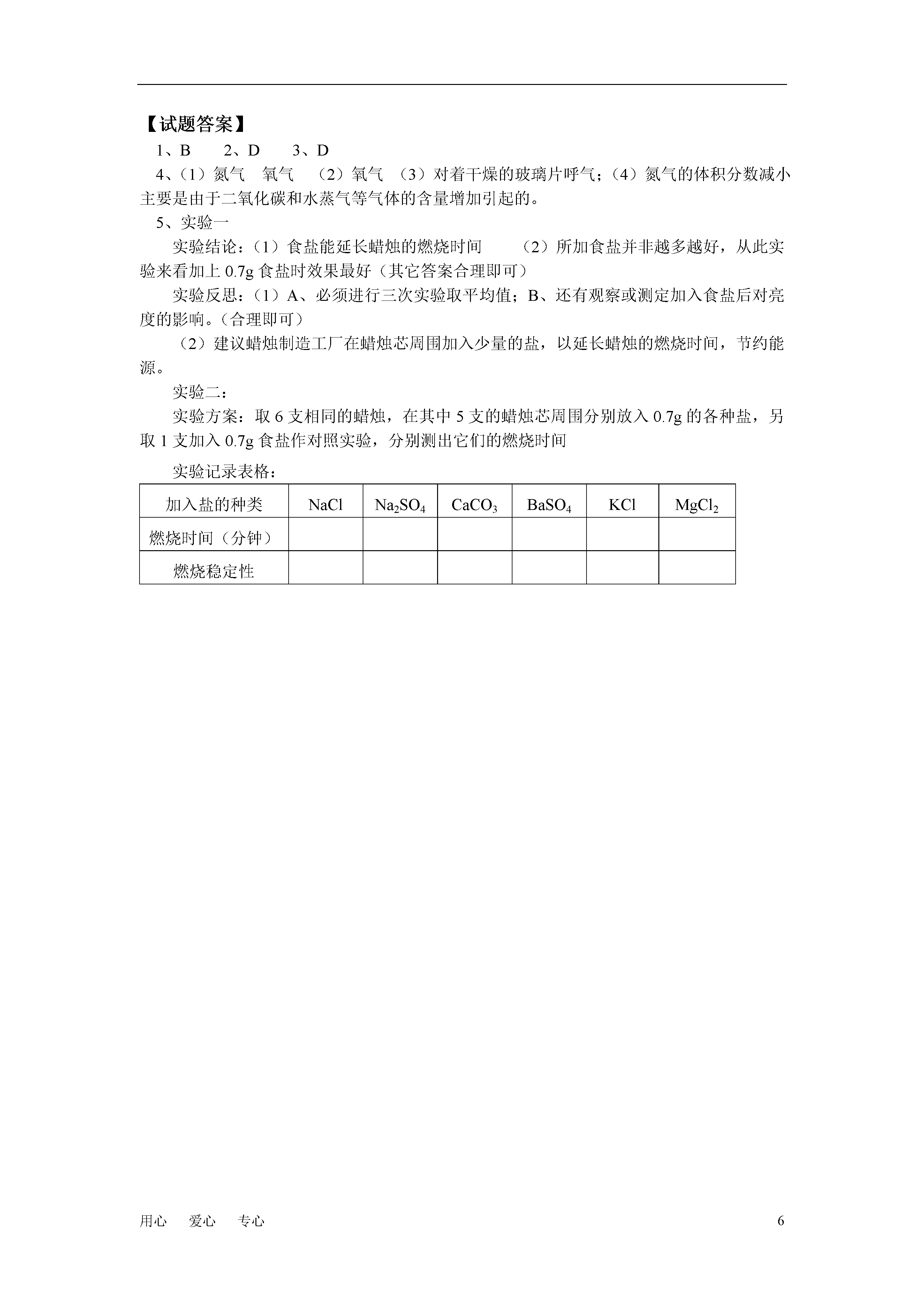 1爱心用心专心第二节化学之旅5分钟训练(预习类训练,可用于课前)1.用_________的方法学习化学,它提倡你亲自去发现和探索。_________是进行科学探究的重要途径,在“_________”中“_________”,体会化学的乐趣。答案:科学探究化学实验做实验学化学2.观察蜡烛燃烧提出问题,包括是什么、叫什么、怎么样等等,教师引导、归纳整理:(1)刚点燃时的现象:______________________________________________________。
