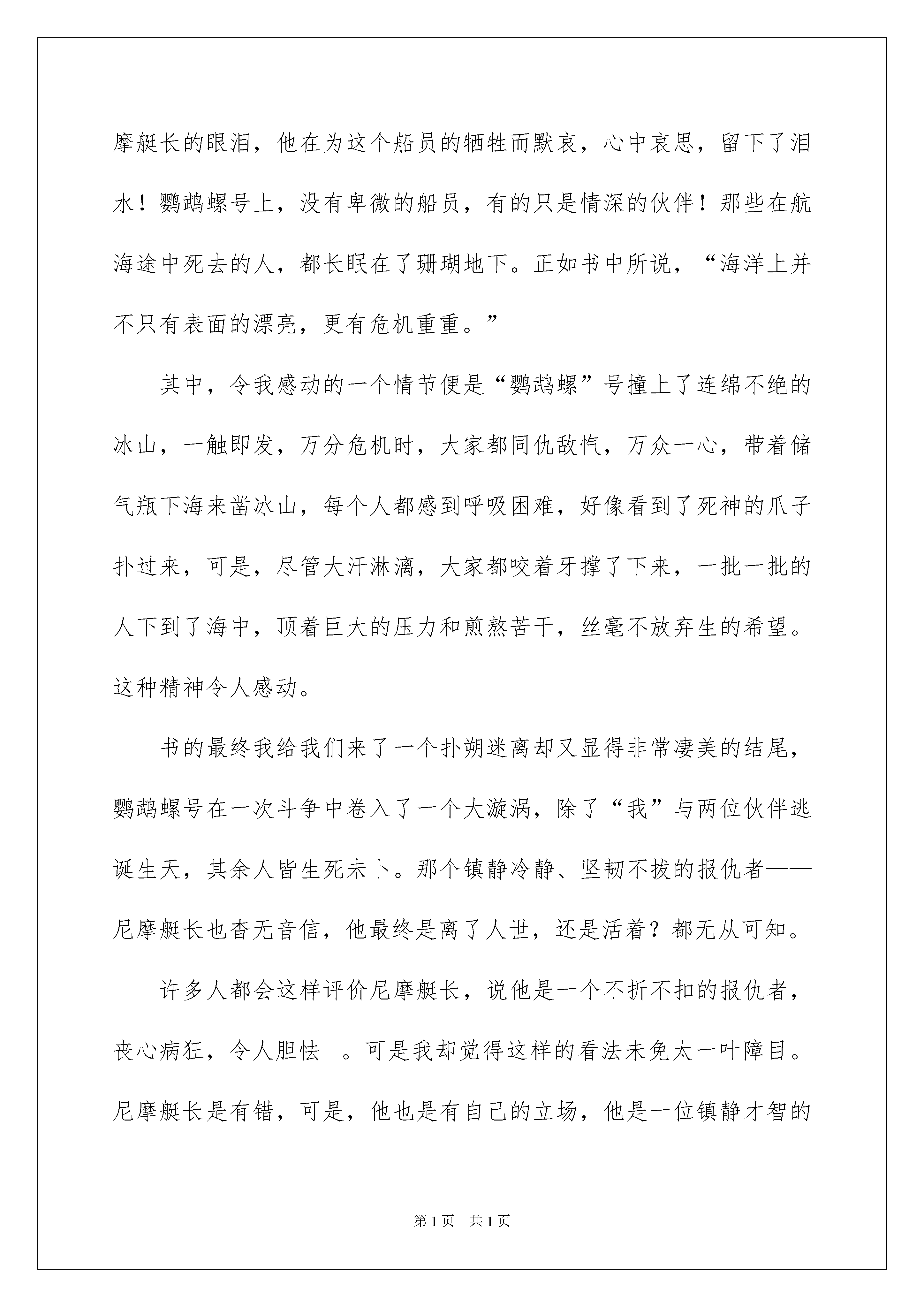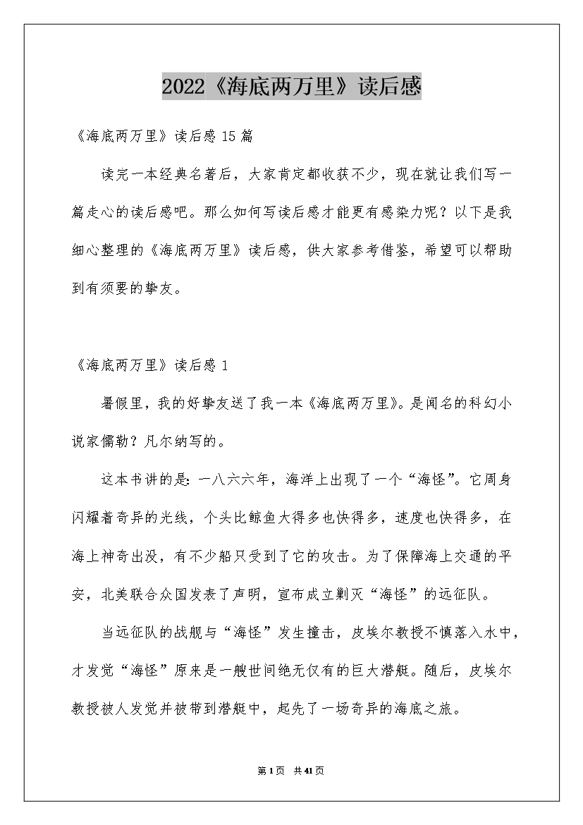 2022《海底两万里》读后感《海底两万里》读后感15篇读完一本经典名著后大家肯定都收获不少现在就让我们写一篇走心的读后感吧。那么如何写读后感才能更有感染力呢?以下是我细心整理的《海底两万里》读后感供大家参考借鉴希望可以帮助到有