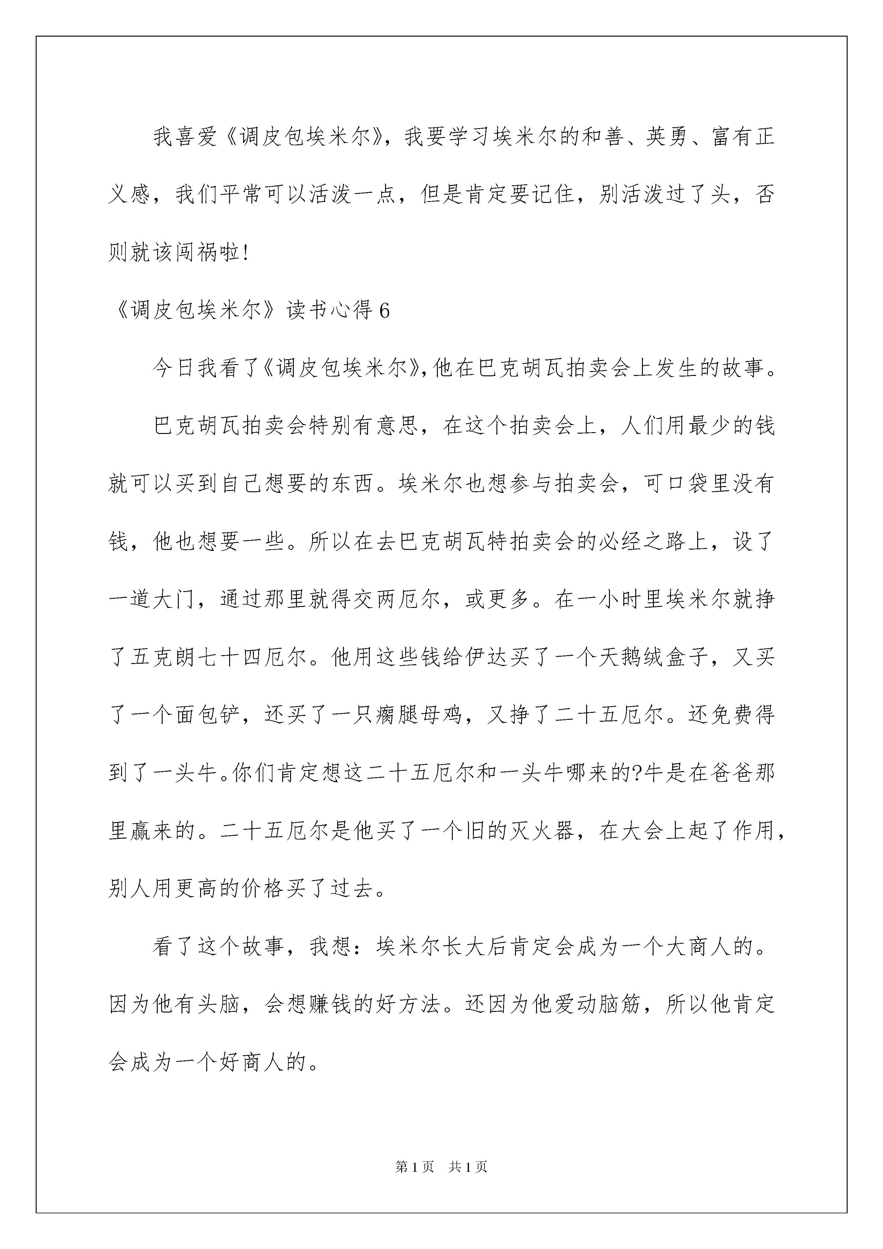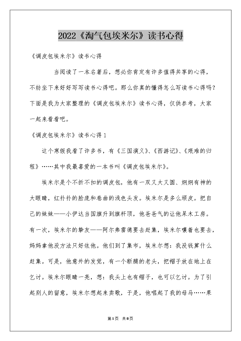 2022《淘气包埃米尔》读书心得《调皮包埃米尔》读书心得当阅读了一本名著后想必你肯定有许多值得共享的心得不妨坐下来好好写写读书心得吧。那么你真的懂得怎么写读书心得吗?下面是我为大家整理的《调皮包埃米尔》读书心得仅供参考大家一起来看看吧。《调皮包埃米尔》读书心得