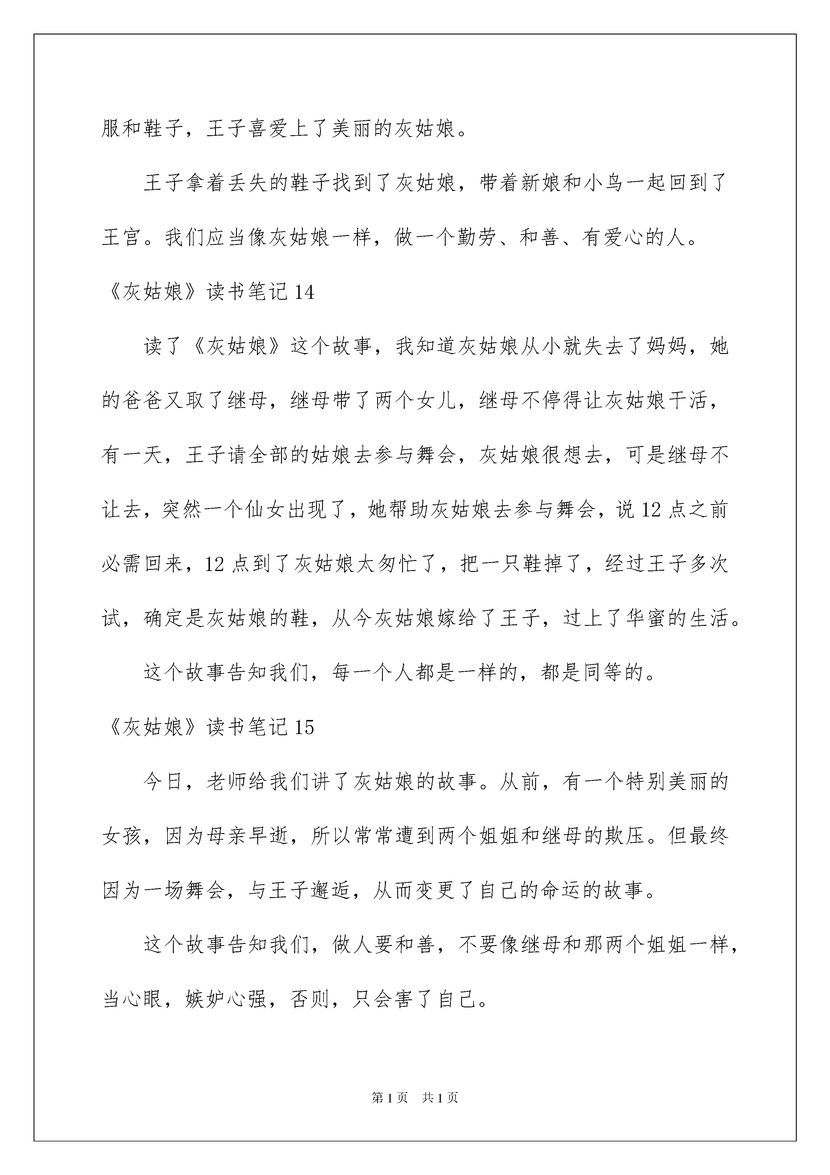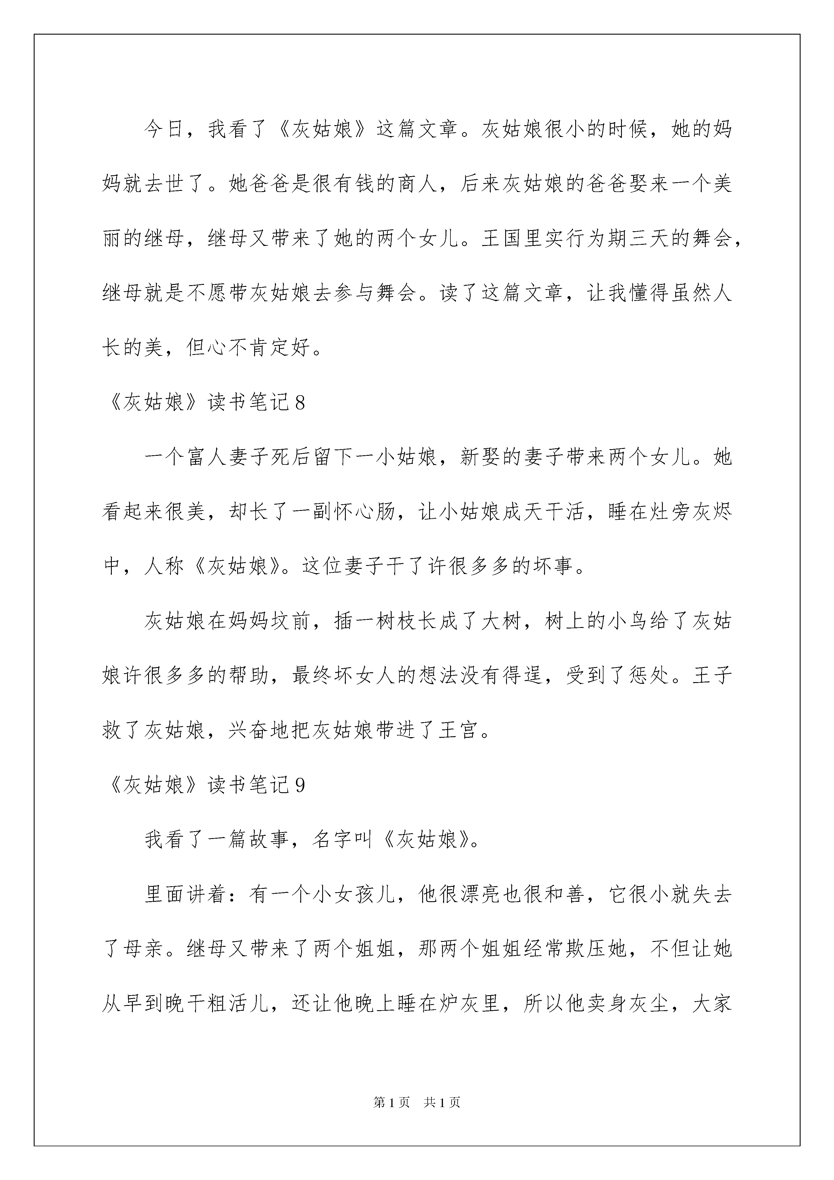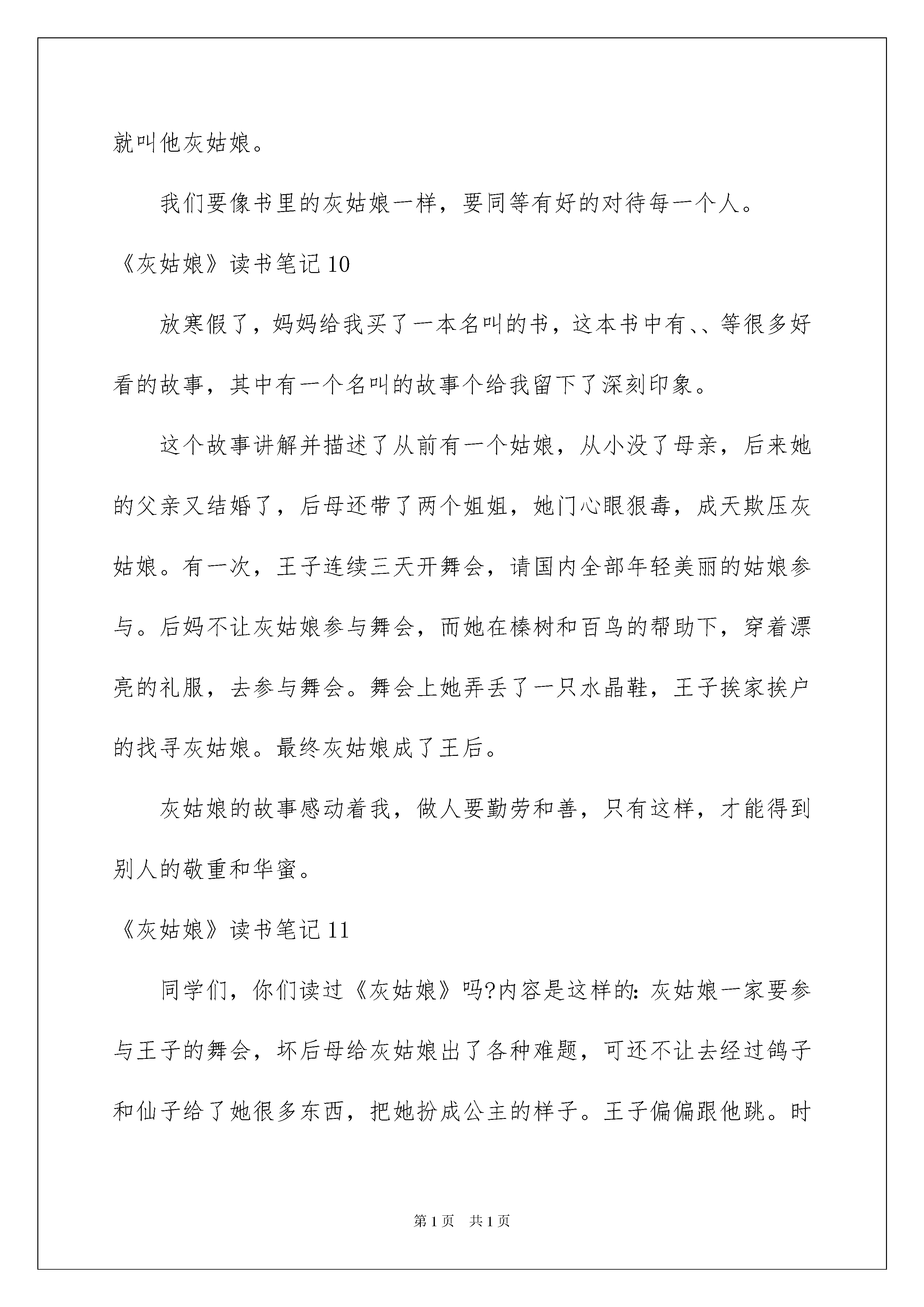 2022《灰姑娘》读书笔记《灰姑娘》读书笔记15篇当品尝完一本著作后,信任大家肯定领悟了不少东西,此时须要仔细思索读书笔记如何写了哦。究竟应如何写读书笔记呢?下面是我整理的《灰姑娘》读书笔记,欢迎阅读,希望大家能够喜爱。《灰姑娘》读书笔记1今日我读了一篇童话,名字叫《灰姑娘》。《灰姑娘》一文中主要讲解并描述了一个漂亮、和善的小姑娘,因为爱她的母亲去