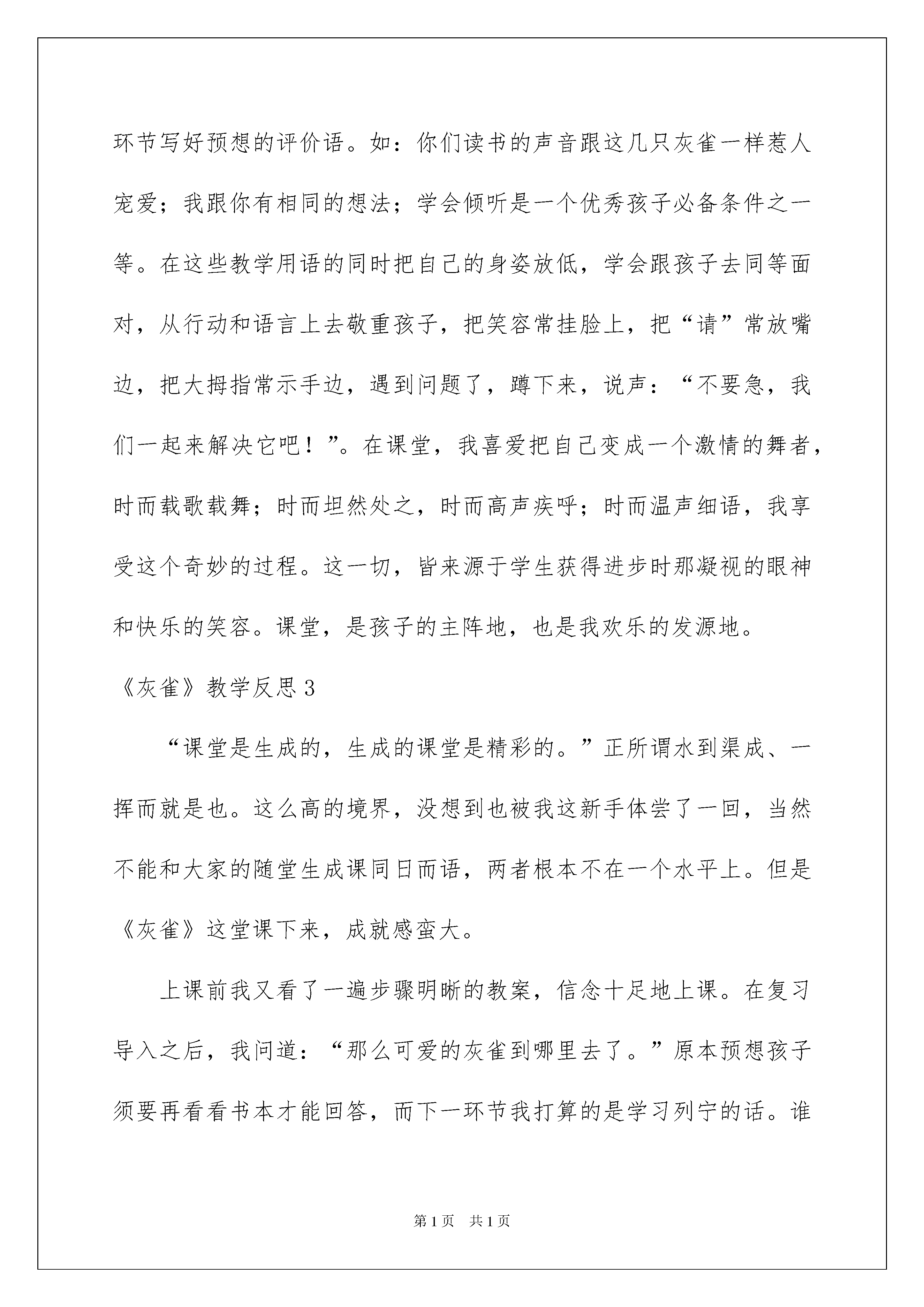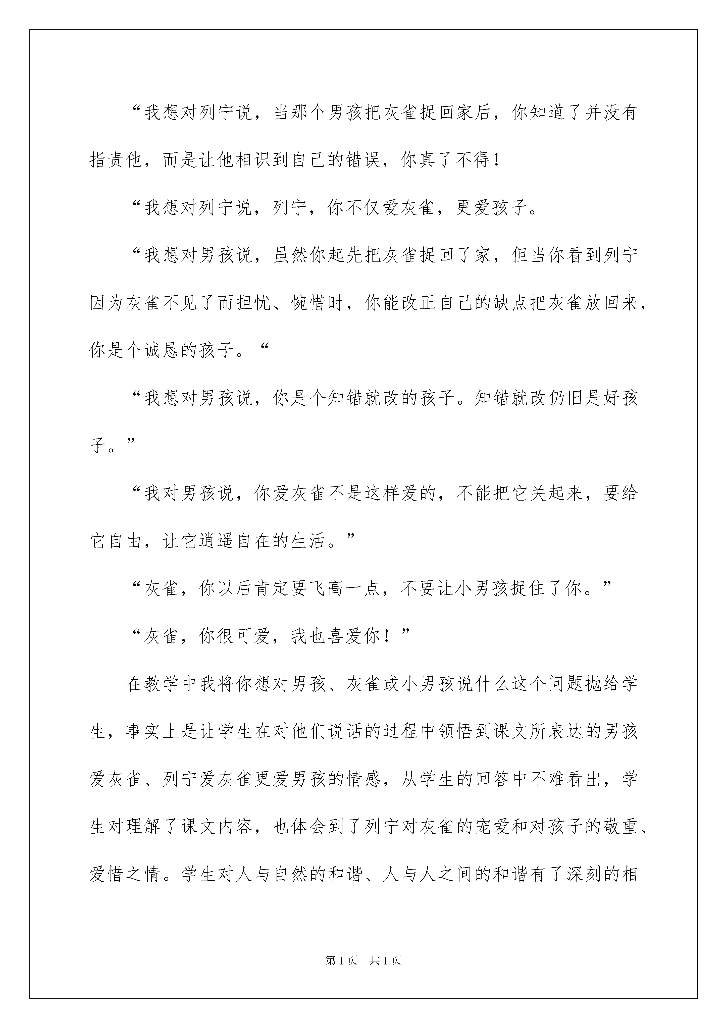 灰雀教学反思《灰雀》教学反思灰雀教学反思《灰雀》教学反思作为一名人民老师,我们需要很强的课堂教学能力,写教学反思可以快速提升我们的教学能力,那么教学反思应该怎么写才合适呢?以下是小编收集整理的灰雀教学反思《灰雀》教学反思,仅供参考,欢迎大家阅读。灰雀教学反思《灰雀》教学反思1教学《灰雀》一文时,我紧紧围绕“爱”一字展开,引导学生讨论了三种“爱”——列宁对灰雀的喜爱(这是最浅层次爱的体现)、小男孩对灰雀的喜爱、列宁对小男孩的爱。在体会这三种爱时,让学生区分列宁与小男孩对灰雀“爱”的不一样,并重点感悟列宁对小