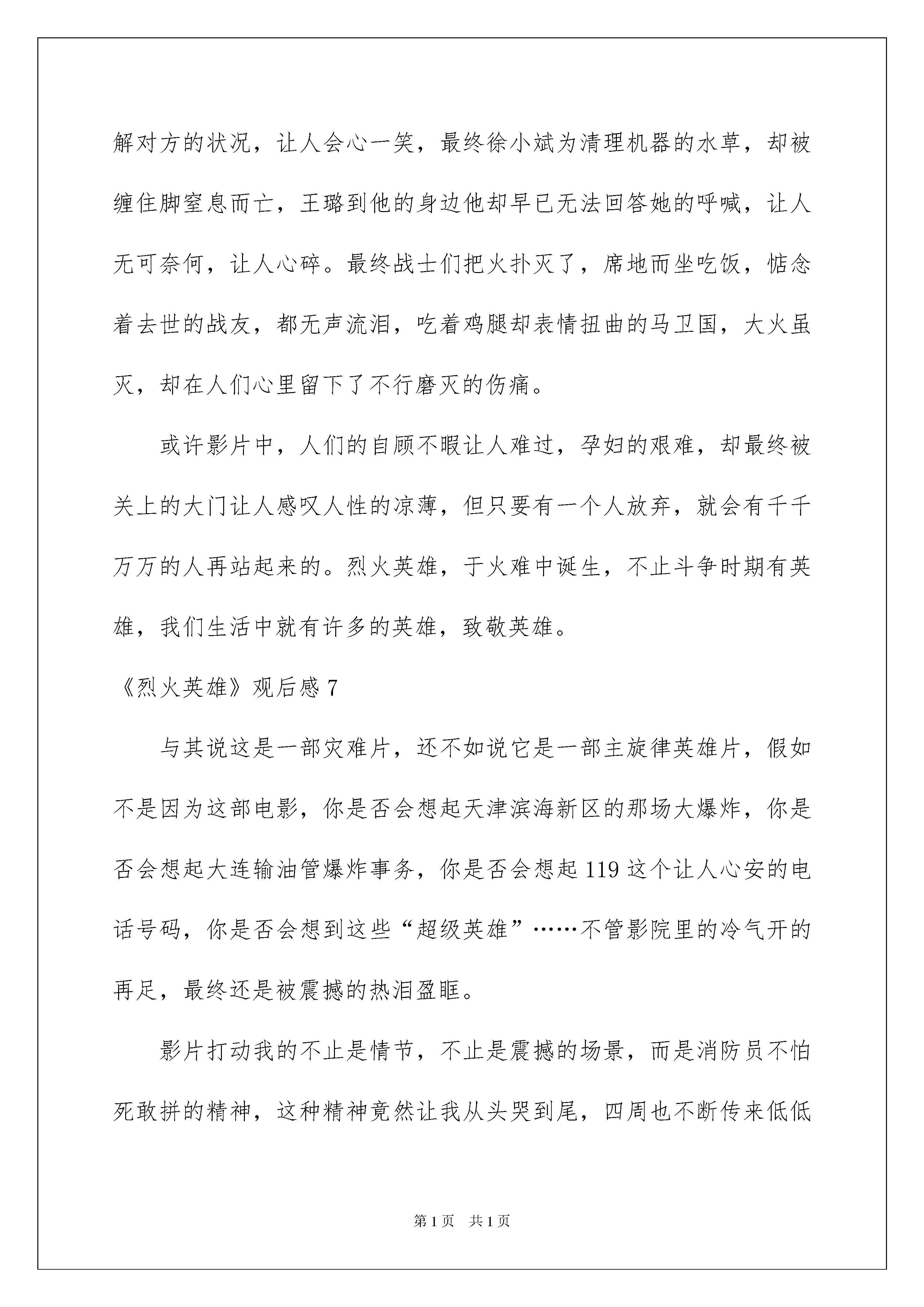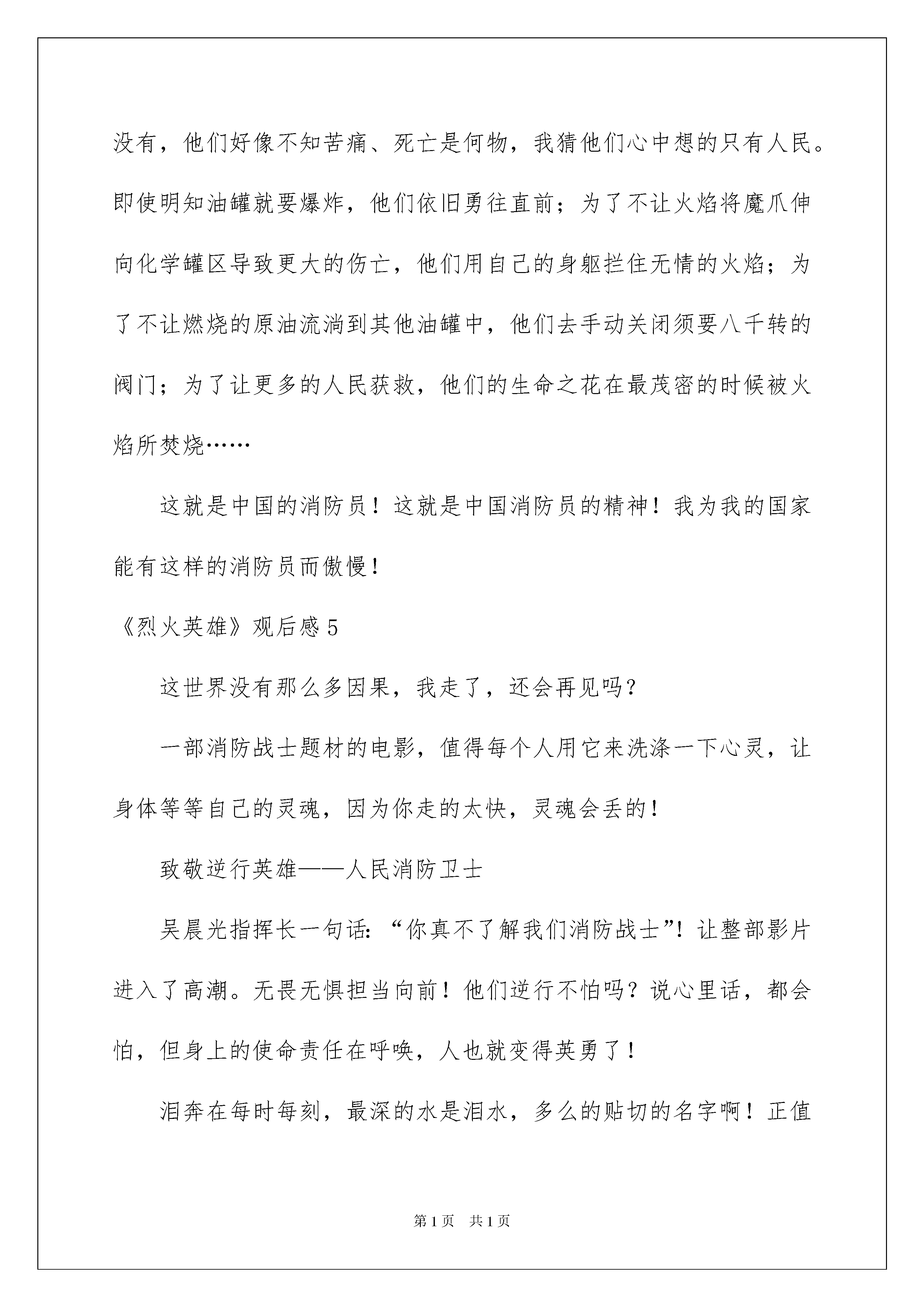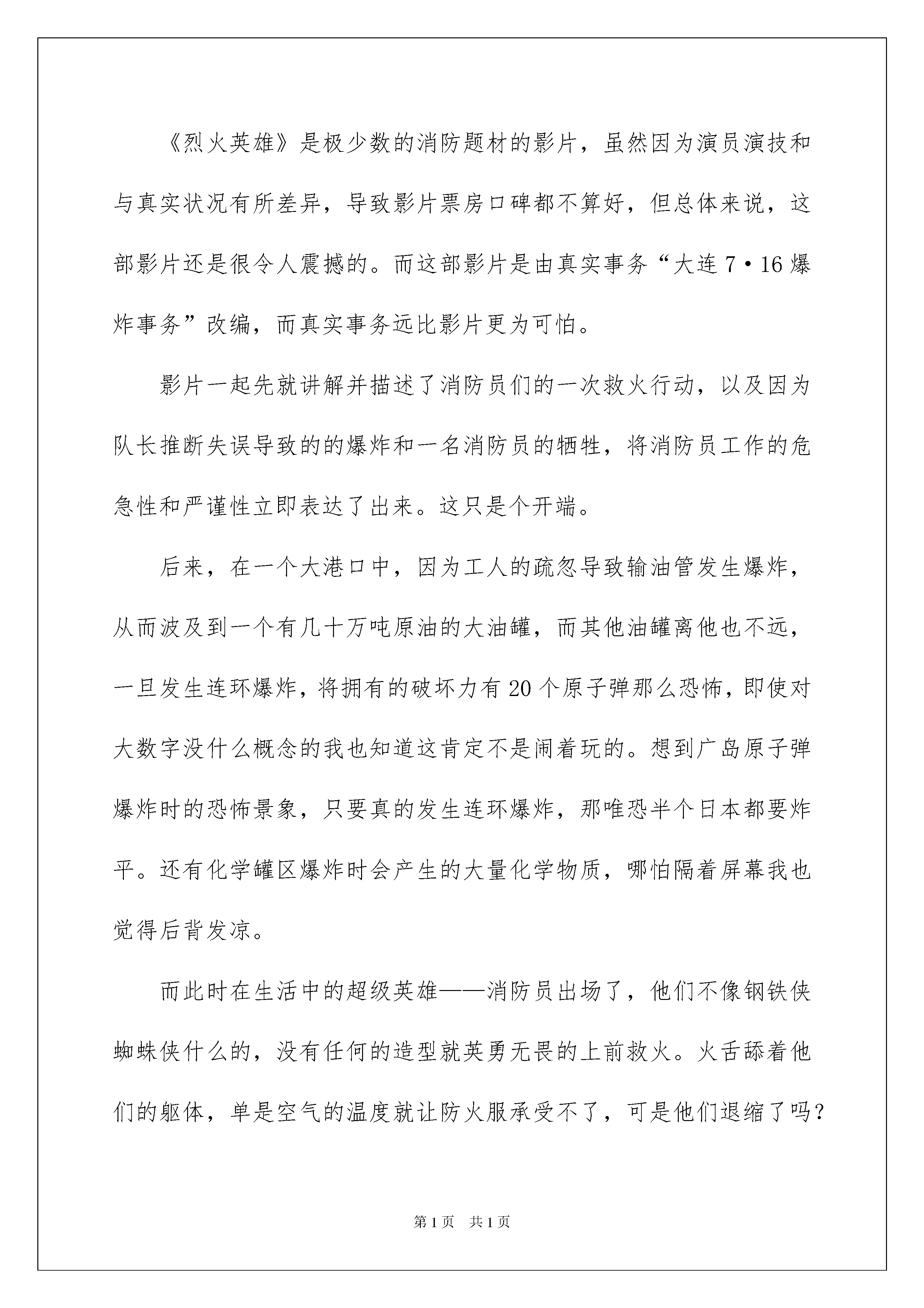 《烈火英雄》观后感《烈火英雄》观后感看完一部影视作品以后,相信大家有很多值得分享的东西吧,何不写一篇观后感记录下呢?可是观后感怎么写才合适呢?以下是小编整理的《烈火英雄》观后感,仅供参考,欢迎大家阅读。《烈火英雄》观后感1在看完《烈火英雄》这部电影之后,我知道了原来在我们背后还有许许多多的人在为我们日常生活中的疏忽“买单”。比如在电影的开头,一家火锅店发生了火灾,消防队队长江立伟奋力去救被困在火锅店三楼的小女孩,为了不让孩子吸入浓烟,江立伟毫不犹豫地摘下自己的面罩,将它戴在了小女孩脸上。浓烟滚滚的火海之中