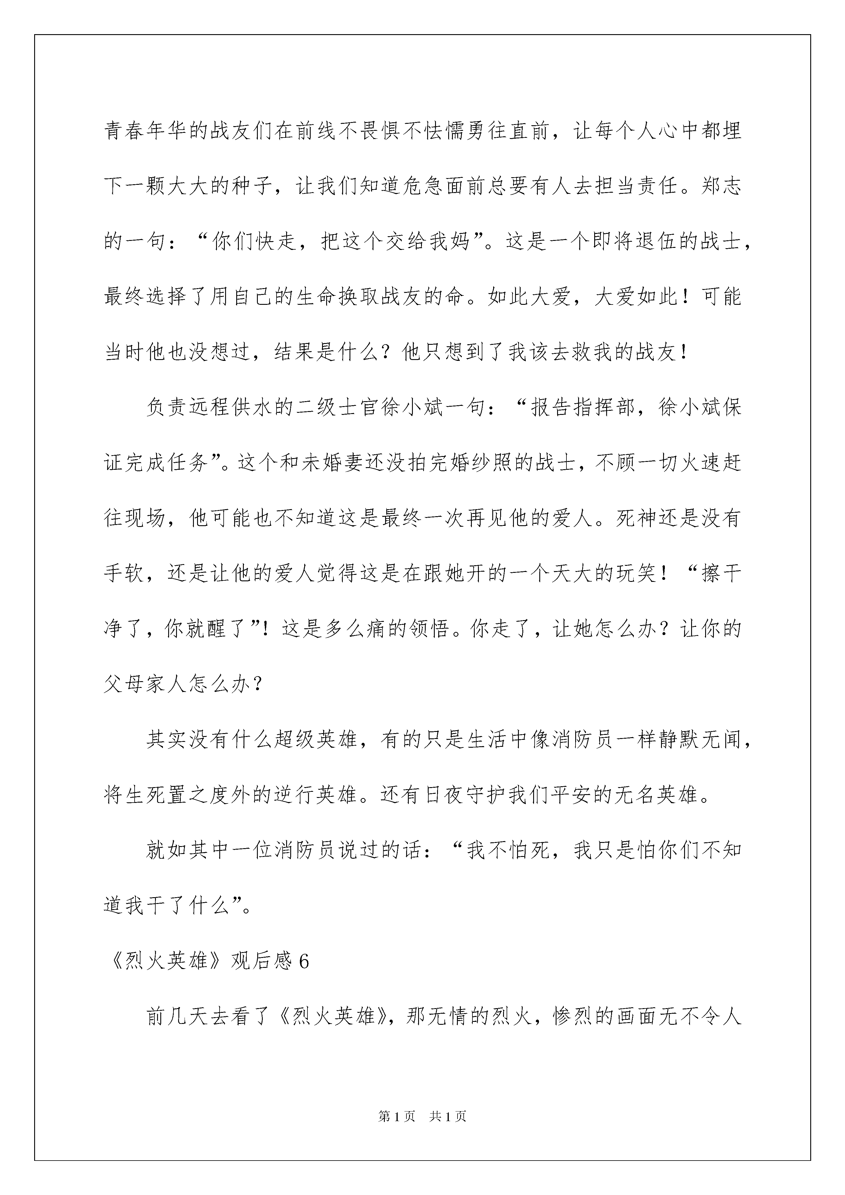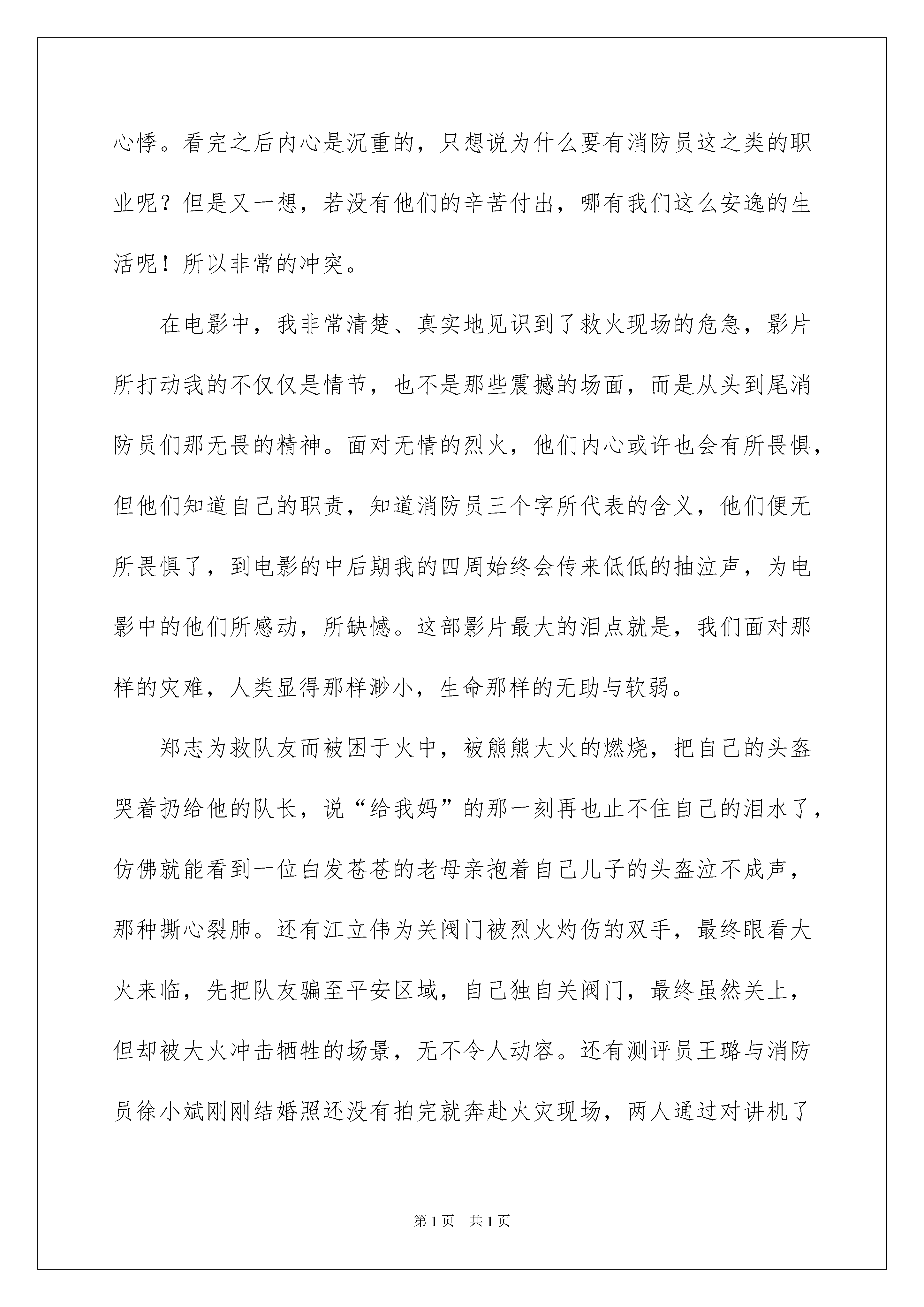烈火英雄观后感【荐】烈火英雄观后感看完某一作品后,想必你有不少可以分享的东西,为此就要认真思考观后感如何写了。千万不能认为观后感随便应付就可以,以下是小编为大家收集的烈火英雄观后感,欢迎阅读与收藏。烈火英雄观后感1《烈火英雄》作为首次全景聚焦消防员群体的电影、除了1:1呈现出大规模的火灾场面之外,还刻画了有血有肉的英雄形象和真实生动的情感故事,我们身边有很多消防员爸爸!他们是英雄,更是我们身边的普通人。看了这部电影我觉得要想将来更好地建设祖国就一定要确定一个远大的志向,树立和培养正确的理想观念,对祖国的未