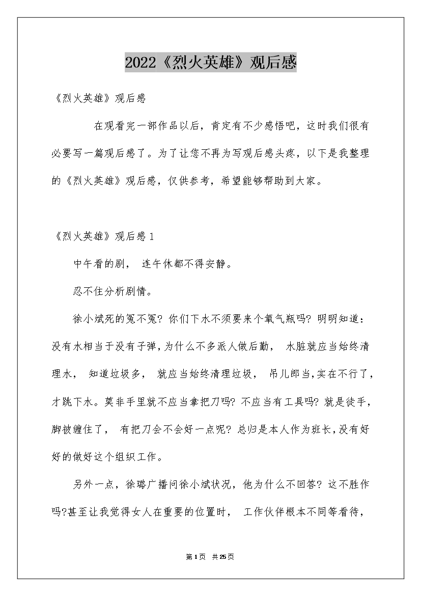 2022《烈火英雄》观后感《烈火英雄》观后感在观看完一部作品以后,肯定有不少感悟吧,这时我们很有必要写一篇观后感了。为了让您不再为写观后感头疼,以下是我整理的《烈火英雄》观后感,仅供参考,希望能够帮助到大家。《烈火英雄》观后感1中午看的剧,连午休都不得安静。忍不住分析剧情。徐小斌死的冤不冤?你们下水不须要来个氧气瓶吗?明明知道:没有水相当于没有子弹