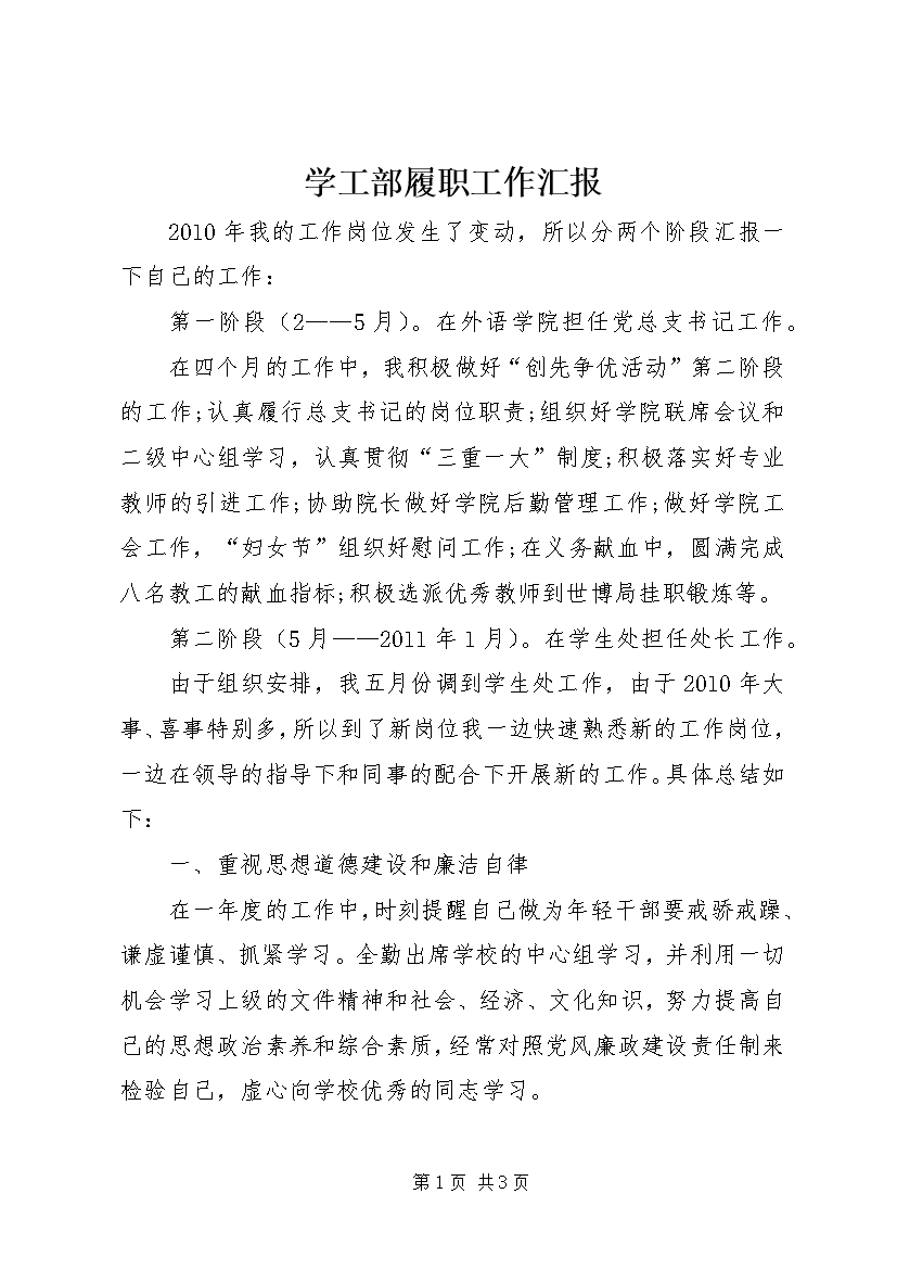 学工部履职工作汇报2010年我的工作岗位发生了变动所以分两个阶段汇报一下自己的工作:第一阶段(2——5月)。在外语学院担任党总支书记工作。在四个月的工作中我积极做好“创先争优活动”第二阶段的工作;认真履行总支书记的岗位职责;组织好学院联席会议和二级中心组学习认真贯彻“三重一大”制度;积极落实好专业教师的引进工作;协助院长做好学院后勤管理工作;做好学院工会工作“妇女节”组织好慰问工作;在义务献血中圆满完成八名教工的献血指标;积极选派优秀教师到世博局挂职锻炼等。