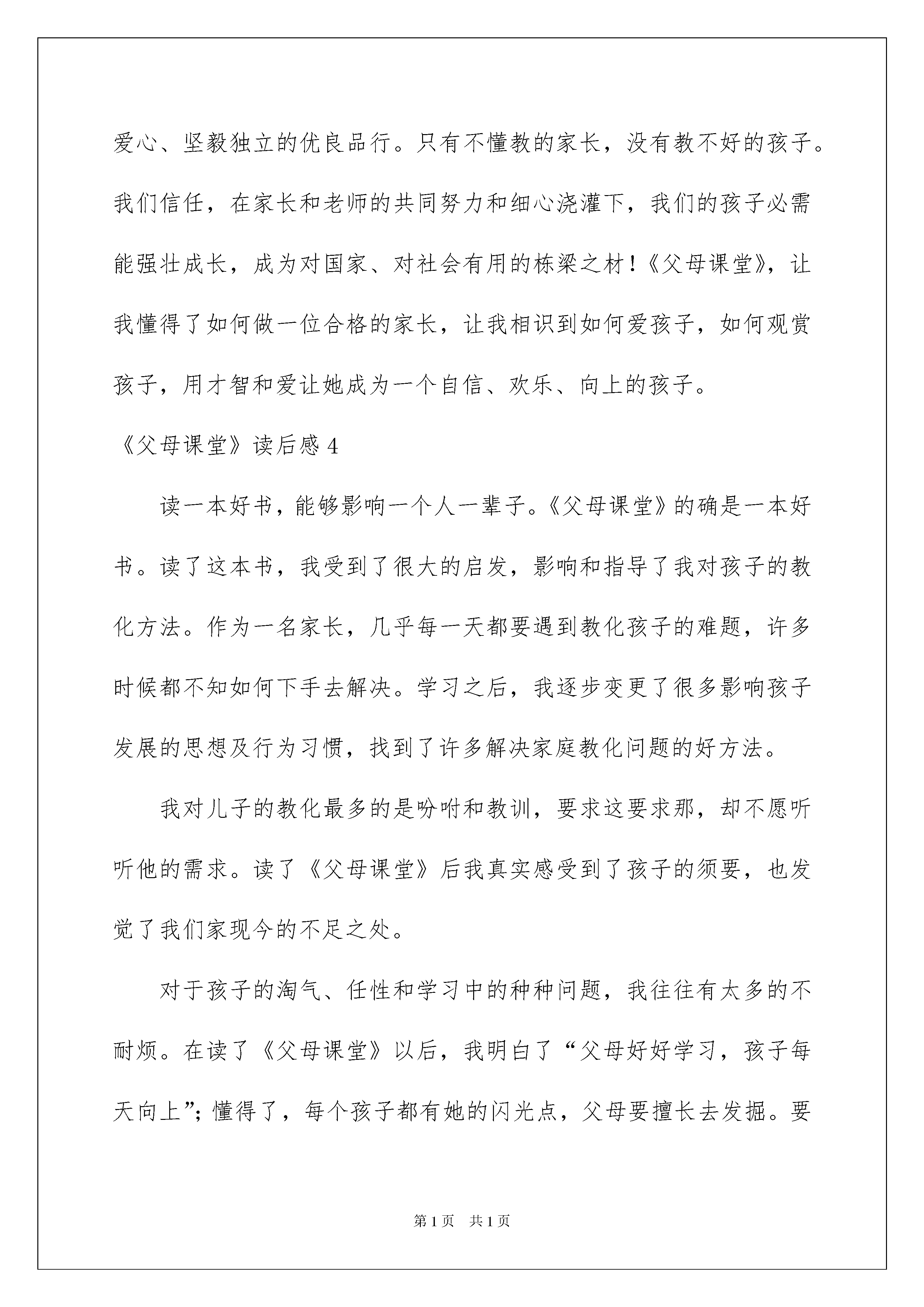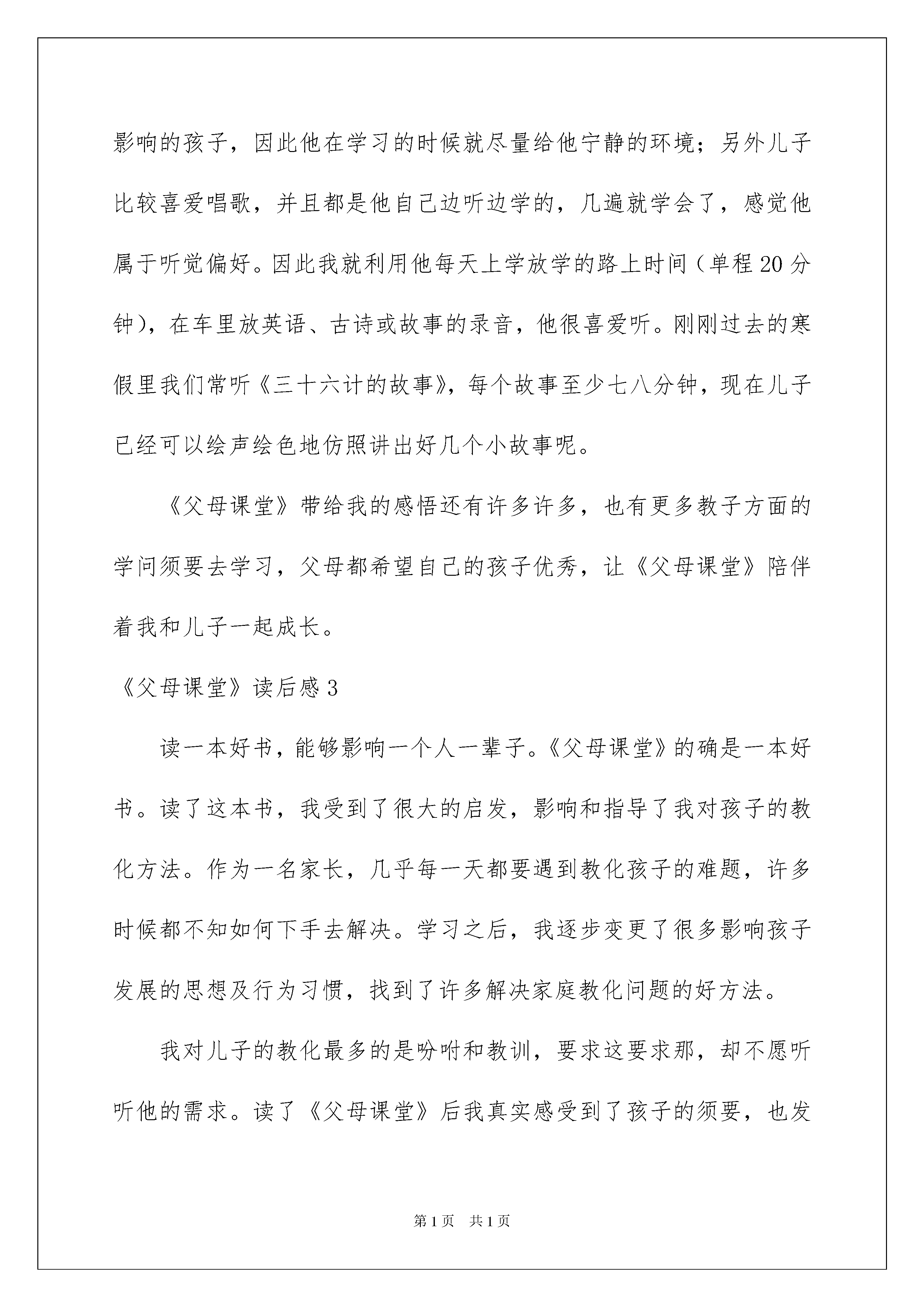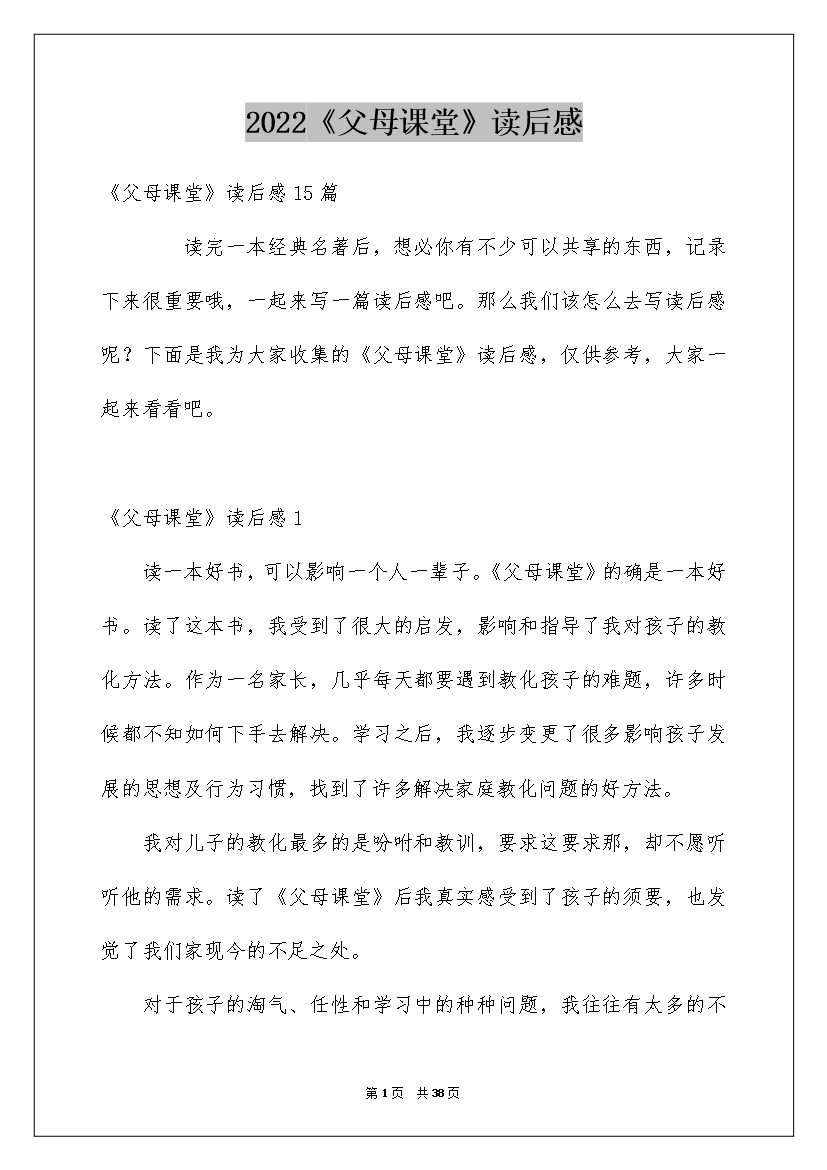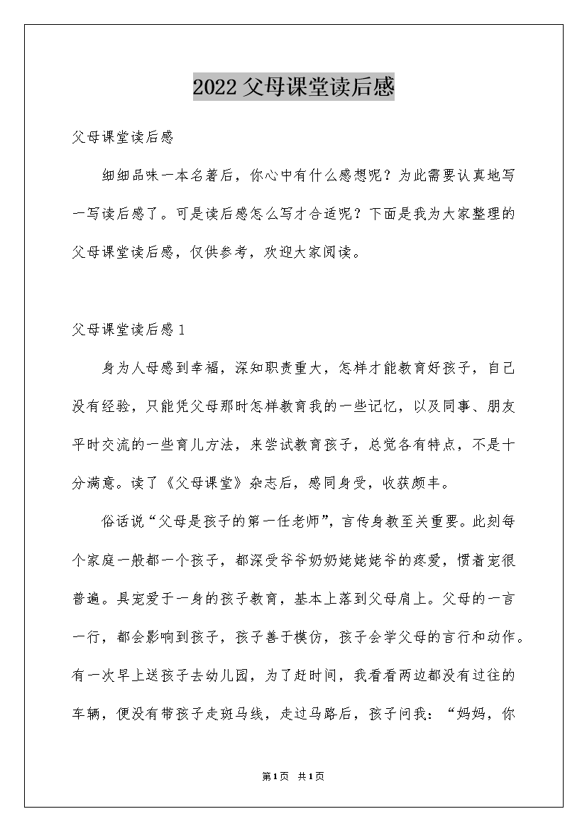2022《父母课堂》读后感《父母课堂》读后感15篇读完一本经典名著后,想必你有不少可以共享的东西,记录下来很重要哦,一起来写一篇读后感吧。那么我们该怎么去写读后感呢?下面是我为大家收集的《父母课堂》读后感,仅供参考,大家一起来看看吧。《父母课堂》读后感1读一本好书,可以影响一个人一辈子。《父母课堂》的确是一本好书。读了这本书,我受到了很大的启发,影响