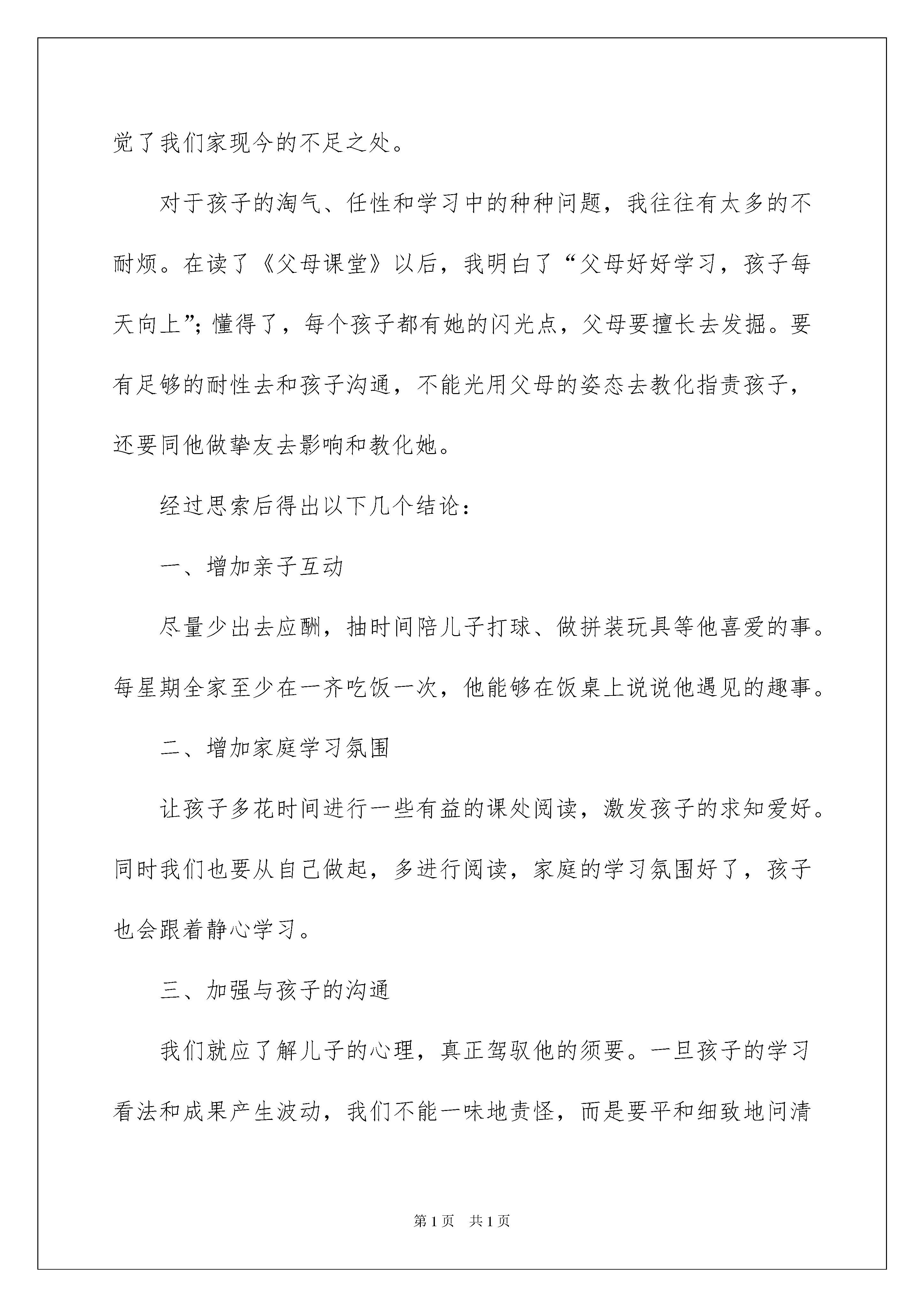 2022父母课堂读后感父母课堂读后感细细品味一本名著后,你心中有什么感想呢?为此需要认真地写一写读后感了。可是读后感怎么写才合适呢?下面是我为大家整理的父母课堂读后感,仅供参考,欢迎大家阅读。父母课堂读后感1身为人母感到幸福,深知职责重大,怎样才能教育好孩子,自己没有经验,只能凭父母那时怎样教育我的一些记忆,以及同事、朋友平时交流的一些育儿方法,来尝