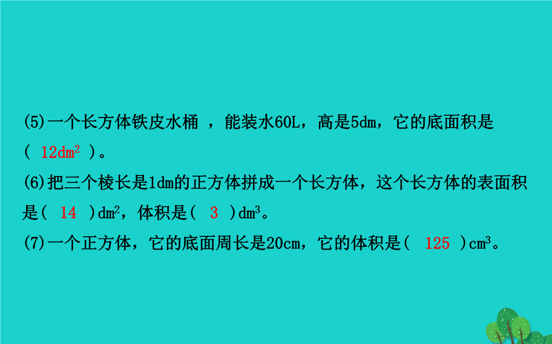 单元整合提升【单元1题通】融汇考点:长方体、正方体的体积、容积的计算方法及体积单位、容积单位之间的换算1.这个鱼缸的容积是多少?8×8×8=512(cm3)=512(mL)答:这个鱼缸的容积是512mL。2.鱼缸内水的体积是多少?8×8×6=384(cm3)答:鱼缸内水的体积是384cm3。3.珊瑚石的体积是多少?8×8×(7-6)=64(cm3)答:珊瑚石的体积是64cm3。1.我会填空。(23分)(1)一大瓶可乐有1.5()一台笔记本电脑的体积是10()一个汽车货柜箱的容积是40(