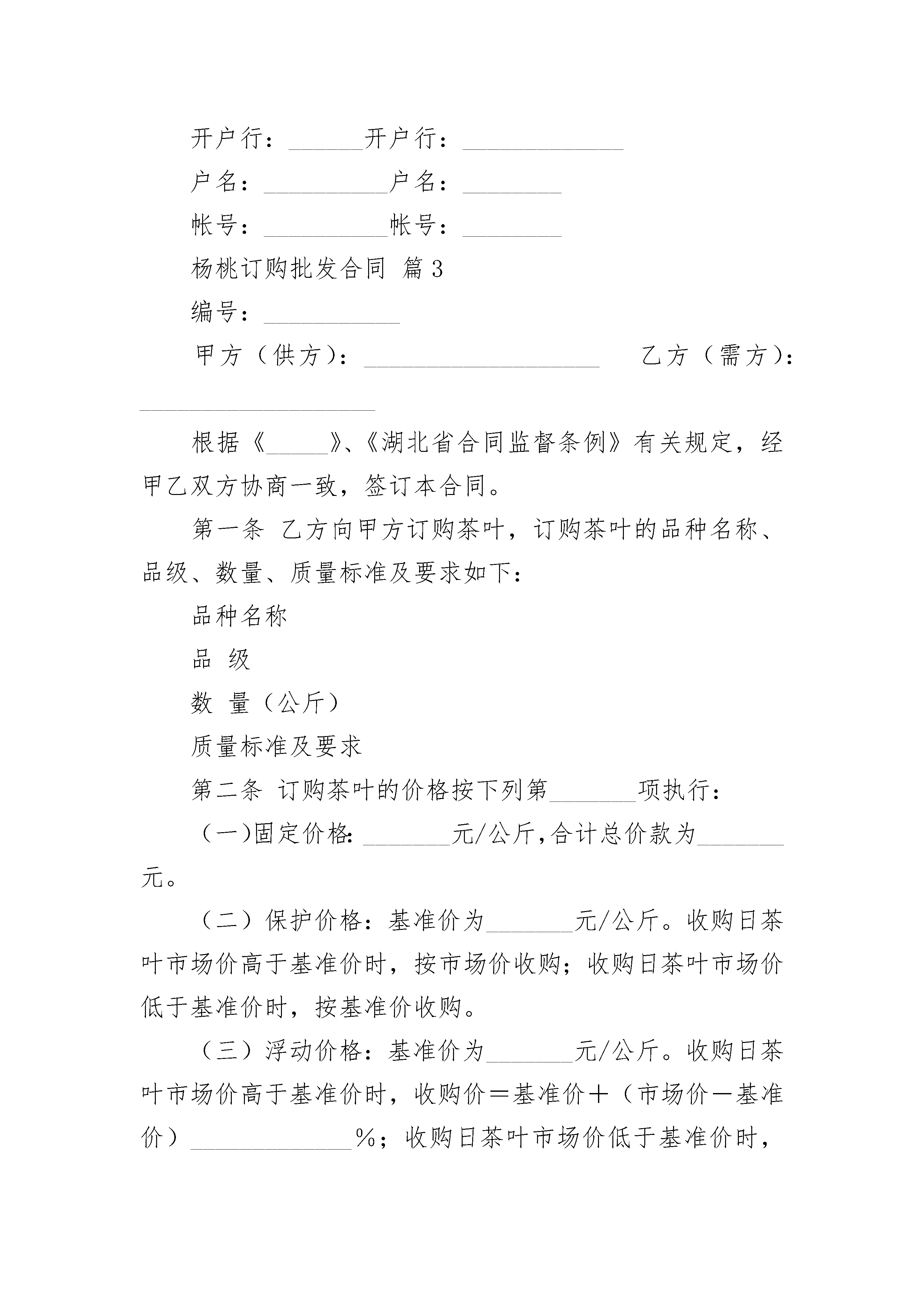 杨桃订购批发合同杨桃订购批发合同(通用3篇)杨桃订购批发合同篇1合同编号:_______________供货方(甲方):_____________购货方(乙方):_____________根据《中华人民共和国民法典》及有关法律法规的规定,双方在平等、自愿、公平、诚实信用的基础上,就杨桃有关事项达成如下协议:一、产品预订:产品名称_____________单位______________单价_____________数量________________金额_________________定金_____