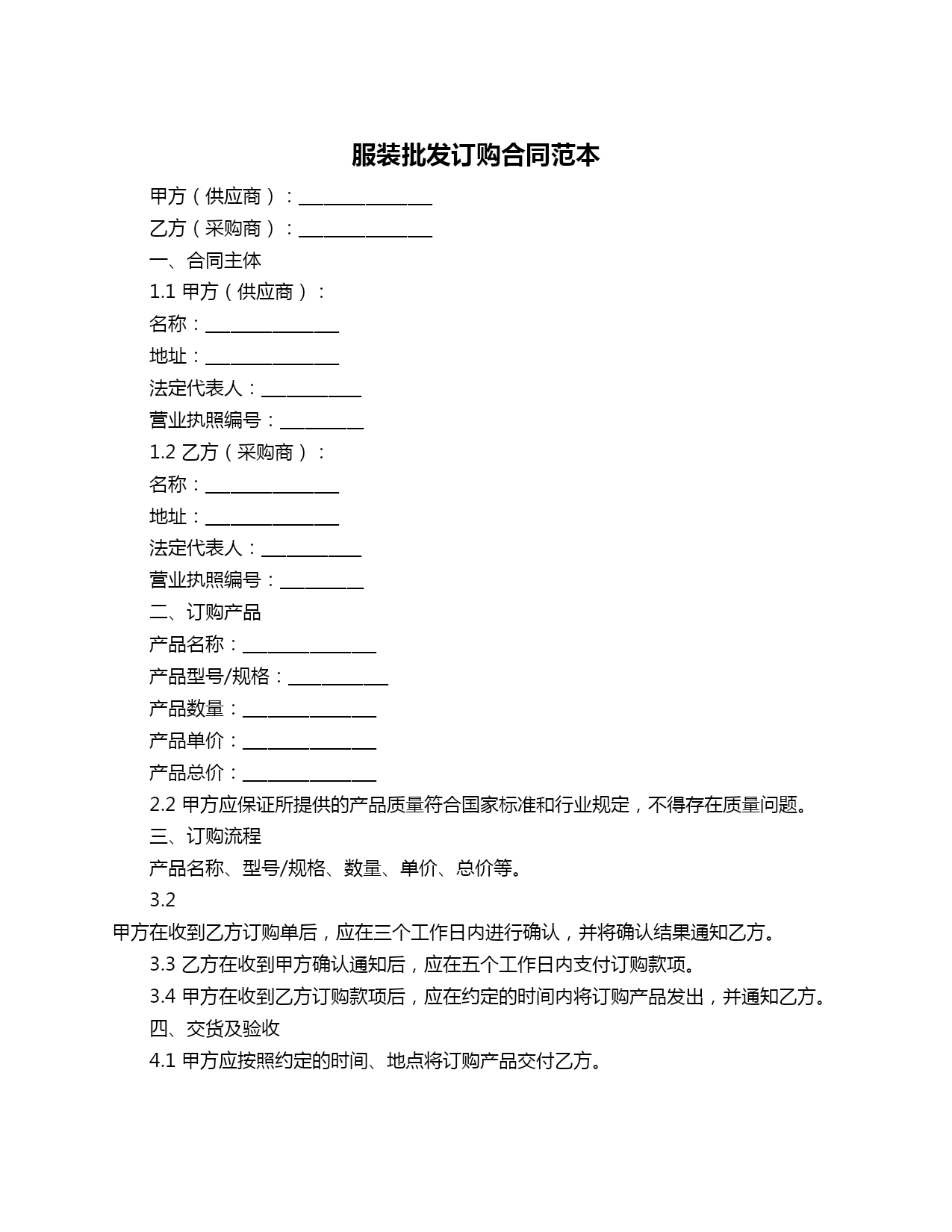 服装批发订购合同范本甲方(供应商):________________乙方(采购商):________________一、合同主体1.1甲方(供应商):名称:________________地址:________________法定代表人:____________营业执照编号:__________1.2乙方(采购商):名称:________________地址:________________法定代表人:____________营业执照编号:__________二、订购产品产品名称:____________