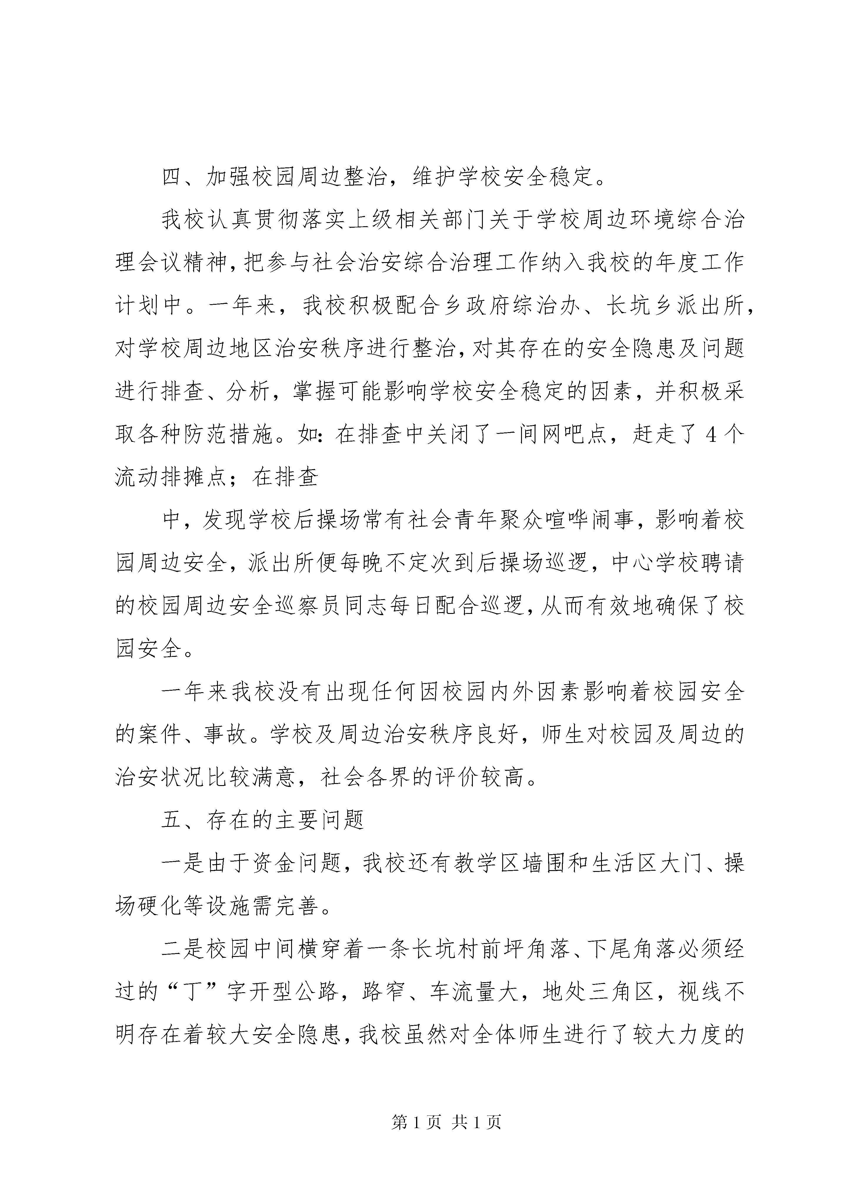 第PAGE\*Arabic\*MERGEFORMAT7页共NUMPAGES\*MERGEFORMAT7页学校创建平安校园工作汇报材料学校创建“平安校园”工作汇报20年11月21日创建“平安校园”,是建设“平安”、“平安”战略的一项重要组成部分,是我校实践“三个代表”重要思想,确保学校安全稳定的一项重要工作,也是维护广大师生切身利益,不断推进学校课程改革、发展的必然要求。一年来,我校认真依据文件的要求,认真落实校园安全管理的各项措施,以学校为主体,以服务师生为宗旨,紧密结合教育改革、发展和稳定的