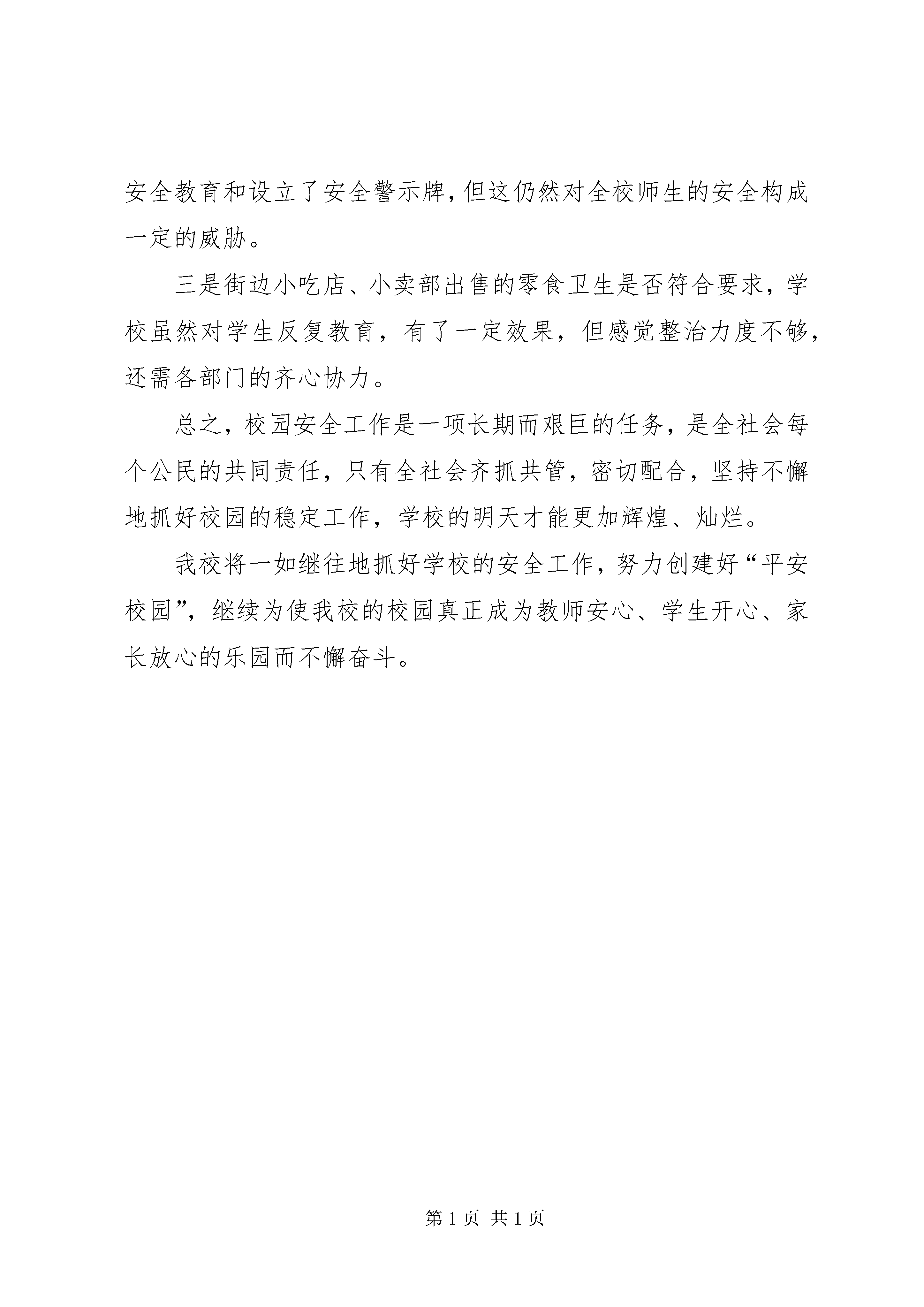 第PAGE\*Arabic\*MERGEFORMAT7页共NUMPAGES\*MERGEFORMAT7页学校平安校园创建工作汇报材料学校创建“平安校园”工作汇报20年11月21日创建“平安校园”,是建设“平安”、“平安”战略的一项重要组成部分,是我校实践“三个代表”重要思想,确保学校安全稳定的一项重要工作,也是维护广大师生切身利益,不断推进学校课程改革、发展的必然要求。一年来,我校认真依据文件的要求,认真落实校园安全管理的各项措施,以学校为主体,以服务师生为宗旨,紧密结合教育改革、发展和稳定的