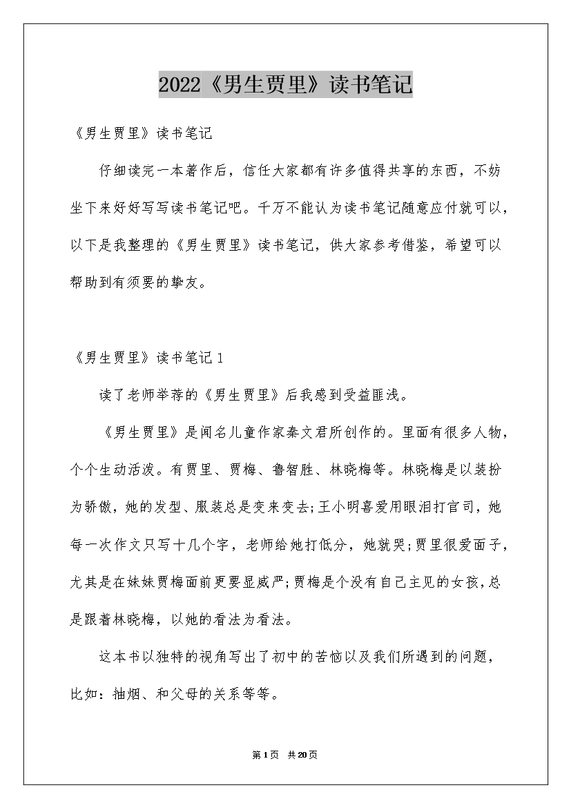 2022《男生贾里》读书笔记《男生贾里》读书笔记仔细读完一本著作后信任大家都有许多值得共享的东西不妨坐下来好好写写读书笔记吧。千万不能认为读书笔记随意应付就可以以下是我整理的《男生贾里》读书笔记供大家参考借鉴希望可以帮助到有须