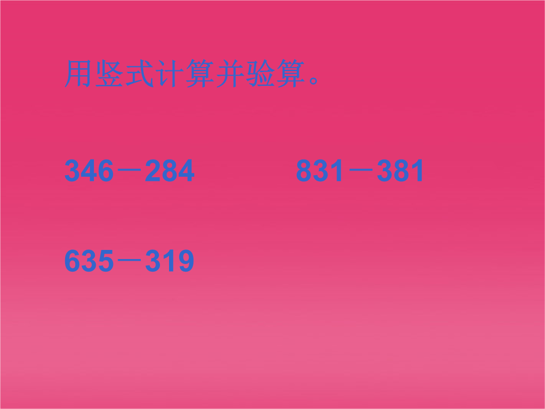 北师大版二年级数学下册学习目标:1.使同学们能够熟练正确地计算三位数减法的算式。2.能结合具体情况提出问题,并能运用所学知识解决一些简单的实际问题。口算用200、300、500这三个数写出两个加法算式和两个减法算式。讨论:找回32元钱对不对?用竖式计算并验算。猜一猜小红验算的是哪一道减法题。讨论:300-76填表