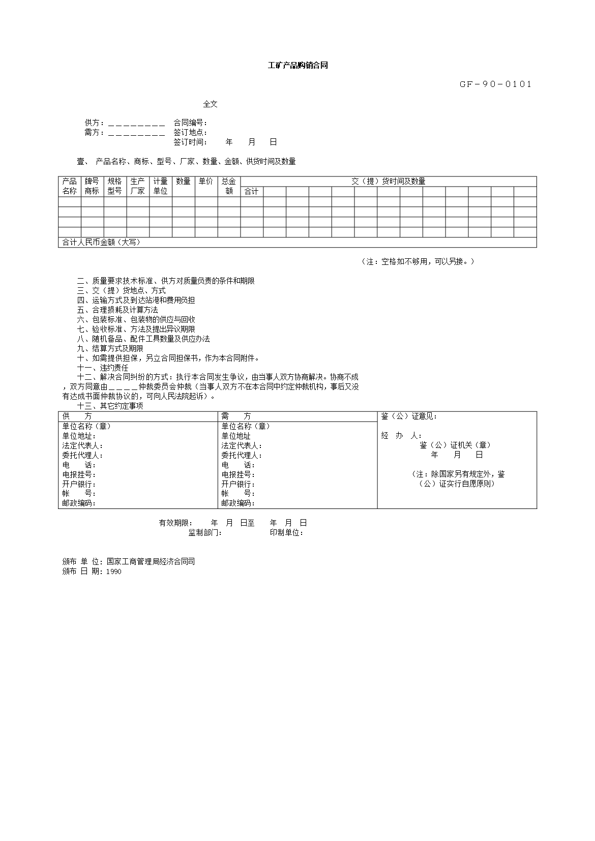 工矿产品购销合同GF-90-0101全文供方:________合同编号:需方:________签订地点:签订时间:年月日产品名称、商标、型号、厂家、数量、金额、供货时间及数量产品名称牌号商标规格型号生产厂家计量单位数量单价总金额交(提)货时间及数量合计合计人