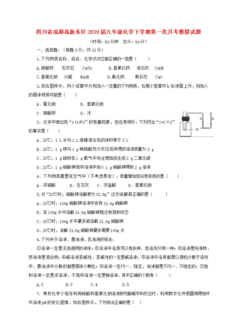 四川省成都高新东区2019届九年级化学下学期第一次月考模拟试题(时间:50分钟总分:60分)一、选择题:(每题3分共21分)1.下列物质名称、俗名、化学式对应都正确的一组是()A.碳酸钙石灰石CaCO3B.氢氧化钙消石灰CaOHC.氢氧化钠火碱NaOHD.氧化钙熟石灰CaO2.如右图所示向小试管中分别加入一定量的下列物质右侧U型管中b处液面上升则加入的固体物质可能是()A.氯化钠