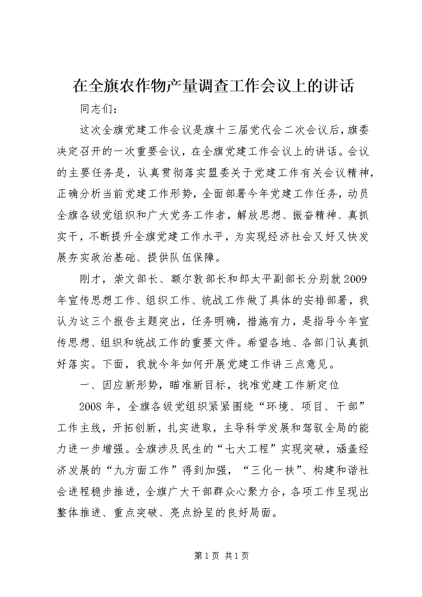在全旗农作物产量调查工作会议上的讲话同志们:这次全旗党建工作会议是旗十三届党代会二次会议后,旗委决定召开的一次重要会议,在全旗党建工作会议上的讲话。会议的主要任务是,认真贯彻落实盟委关于党建工作有关会议精神,正确分析当前党建工作形势,全面部署今年党建工作任务,动员全旗各级党组织和广大党务工作者,解放思想、振奋精神、真抓实干,不断提升全旗党建工作水平,为实现经济社会又好又快发展夯实政治基础、提供队伍保障。刚才,崇文部长、额尔敦部长和郎太平副部长分别就2009年宣传思想工作、组织工作