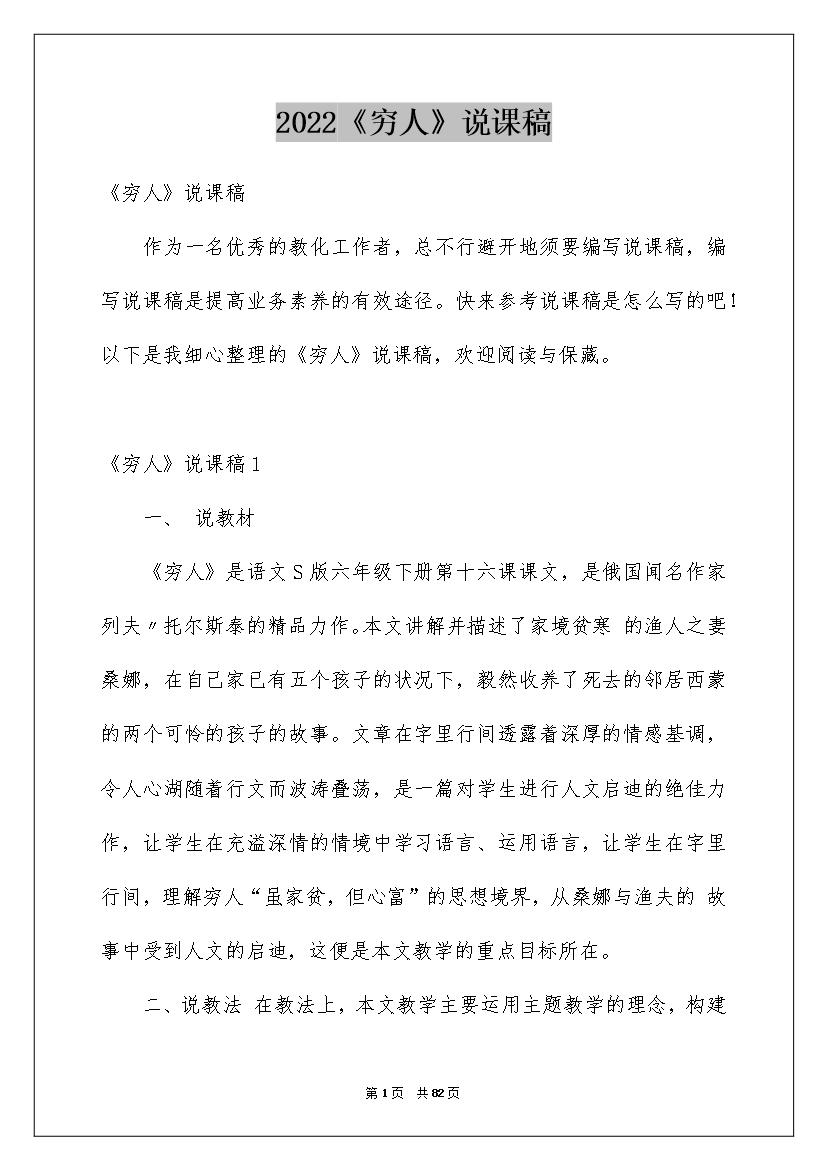 2022《穷人》说课稿《穷人》说课稿作为一名优秀的教化工作者总不行避开地须要编写说课稿编写说课稿是提高业务素养的有效途径。快来参考说课稿是怎么写的吧!以下是我细心整理的《穷人》说课稿欢迎阅读与保藏。《穷人》说课稿1一、说