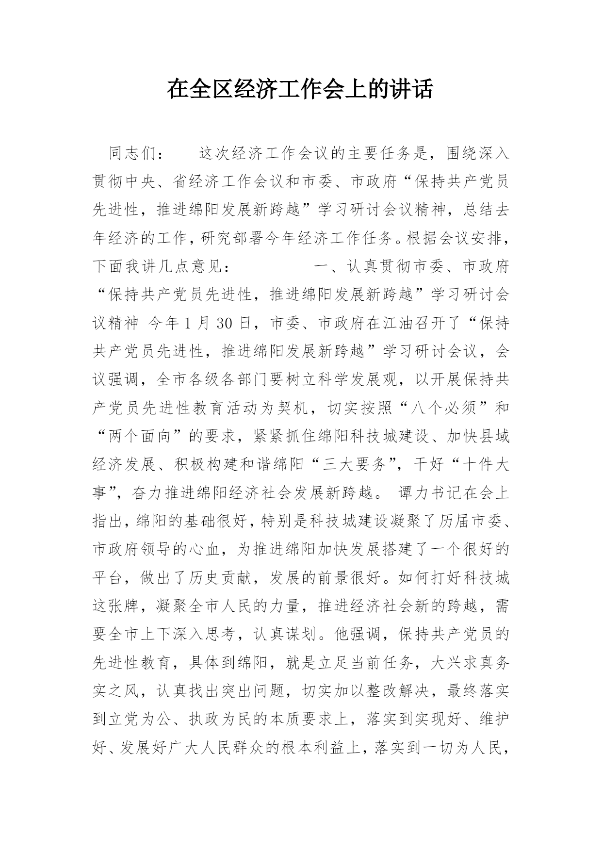 在全区经济工作会上的讲话同志们:这次经济工作会议的主要任务是,围绕深入贯彻中央、省经济工作会议和市委、市政府“保持共产党员先进性,推进绵阳发展新跨越”学习研讨会议精神,总结去年经济的工作,研究部署今年经济工作任务。根据会议安排,下面我讲几点意见:一、认真贯彻市委、市政府“保持共产党员先进性,推进绵阳发展新跨越”学习研讨会议精神今年1月30日,市委、市政府在江油召开了“保持共产党员先进性,推进绵阳发展新跨越”学习研讨会议,会议强调,全市各级各部门要树立科学发展观,以开展保持共产党员先进性教育活动为契机,切实