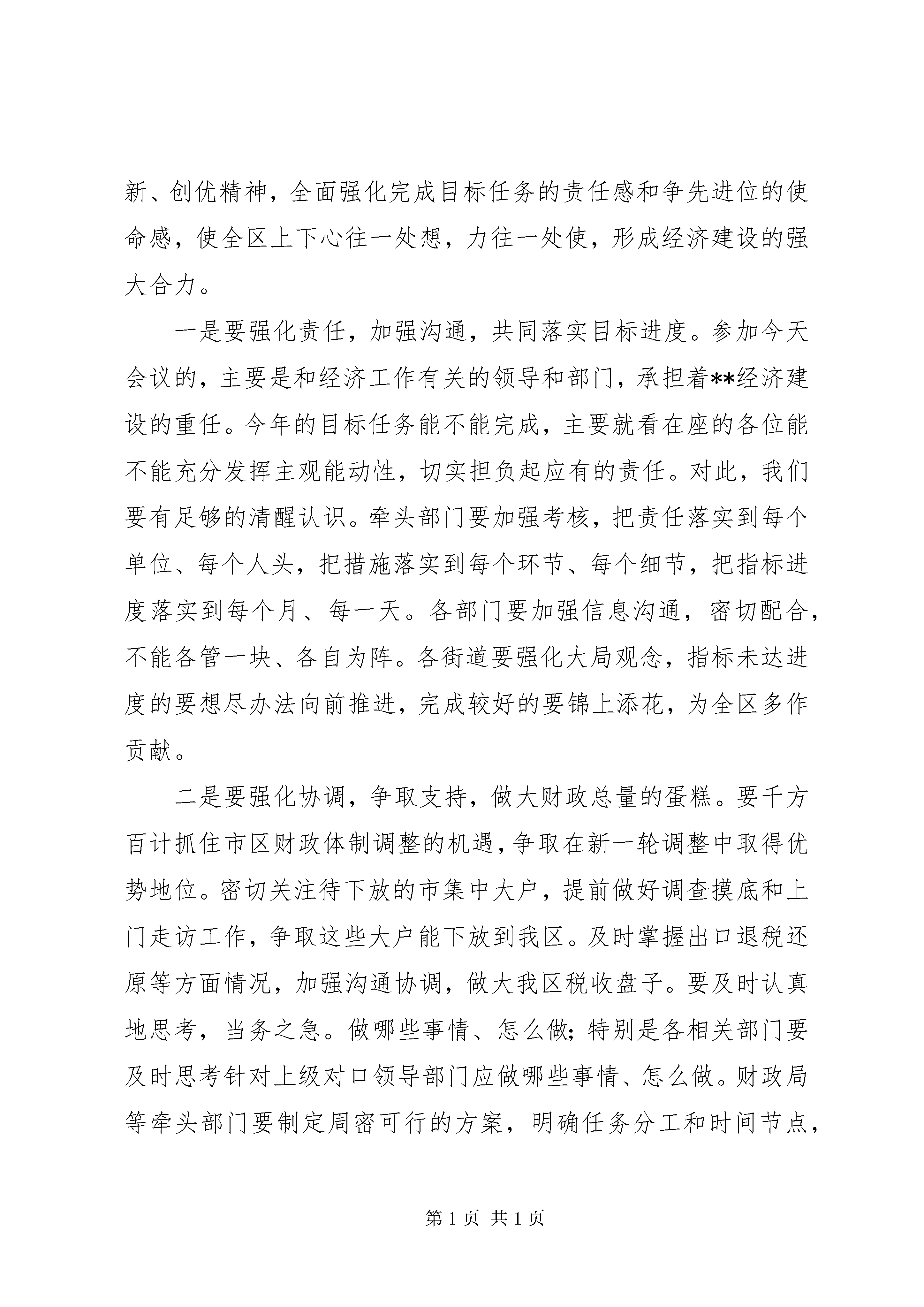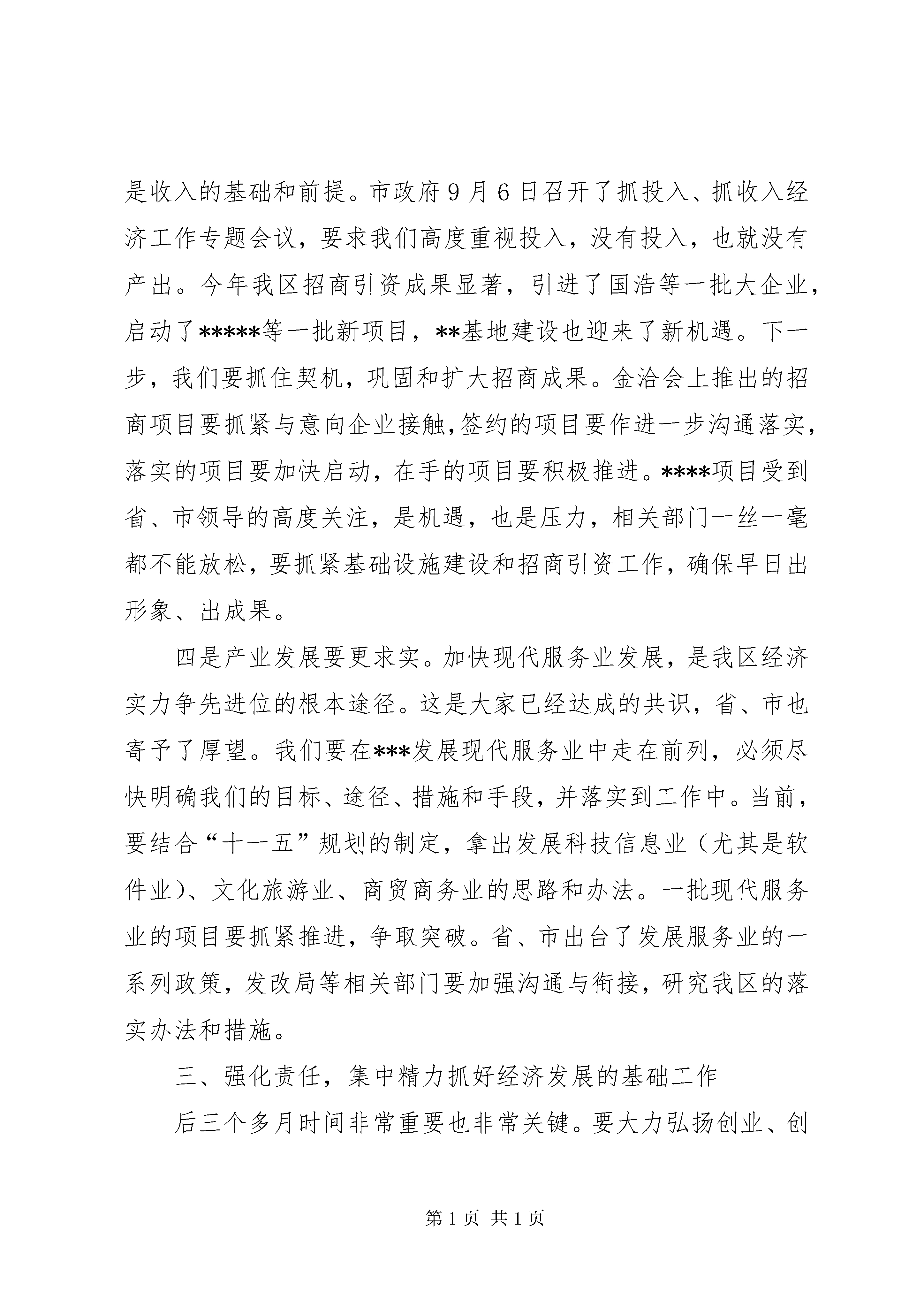 在全区经济工作会议上的讲话在全区经济工作会议上的讲话同志们:今天,区政府召开全区经济工作会议,主要是分析研究当前经济工作形势,动员部署今后三个多月经济工作,确保全年各项经济指标任务的完成。在**会即将召开、全区各项任务非常繁重的情况下召开经济工作专题会议,说明区政府对这个会议非常重视,我们面临的经济工作任务非常紧迫。刚才,***全面总结了全区1-8月份经济工作,对后4个月经济工作做了具体安排,我完全同意,请大家认真贯彻落实;5家单位作了很好的表态发言,也请大家学习借鉴。今年以来全
