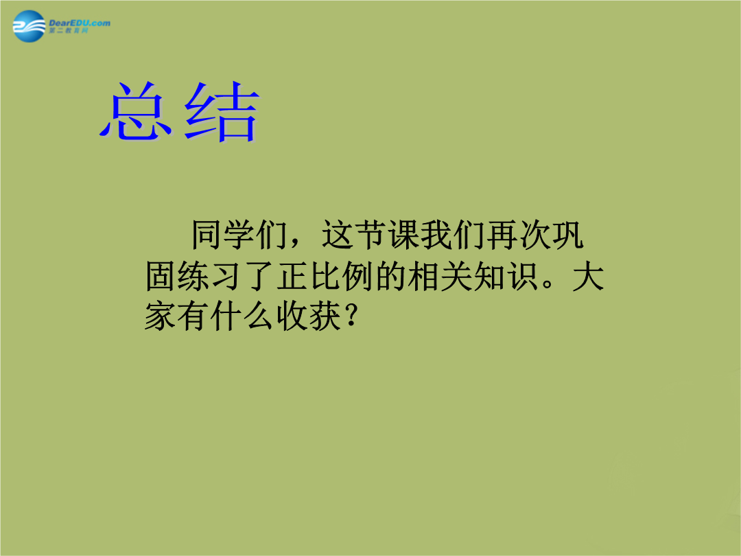 正比例教学目标一辆汽车行驶的速度为90千米/时,汽车行驶的时间和路程如下。把下表填写完整。1想一想:正方形的周长与边长成正比例吗?面积与边长呢?为什么?应用知识,解决问题判定方法:1、判定两个量是否成正比例,主要看它们的()是否一定。2、苹果的单价一定,苹果的数量和总价。()和()是相关联的量。所以()和()是成正比例的量。2.已知a和b成正比例,完成下表。请大家回顾一下,通过这节课的学习,你有什么收获?你还有什么疑问吗?