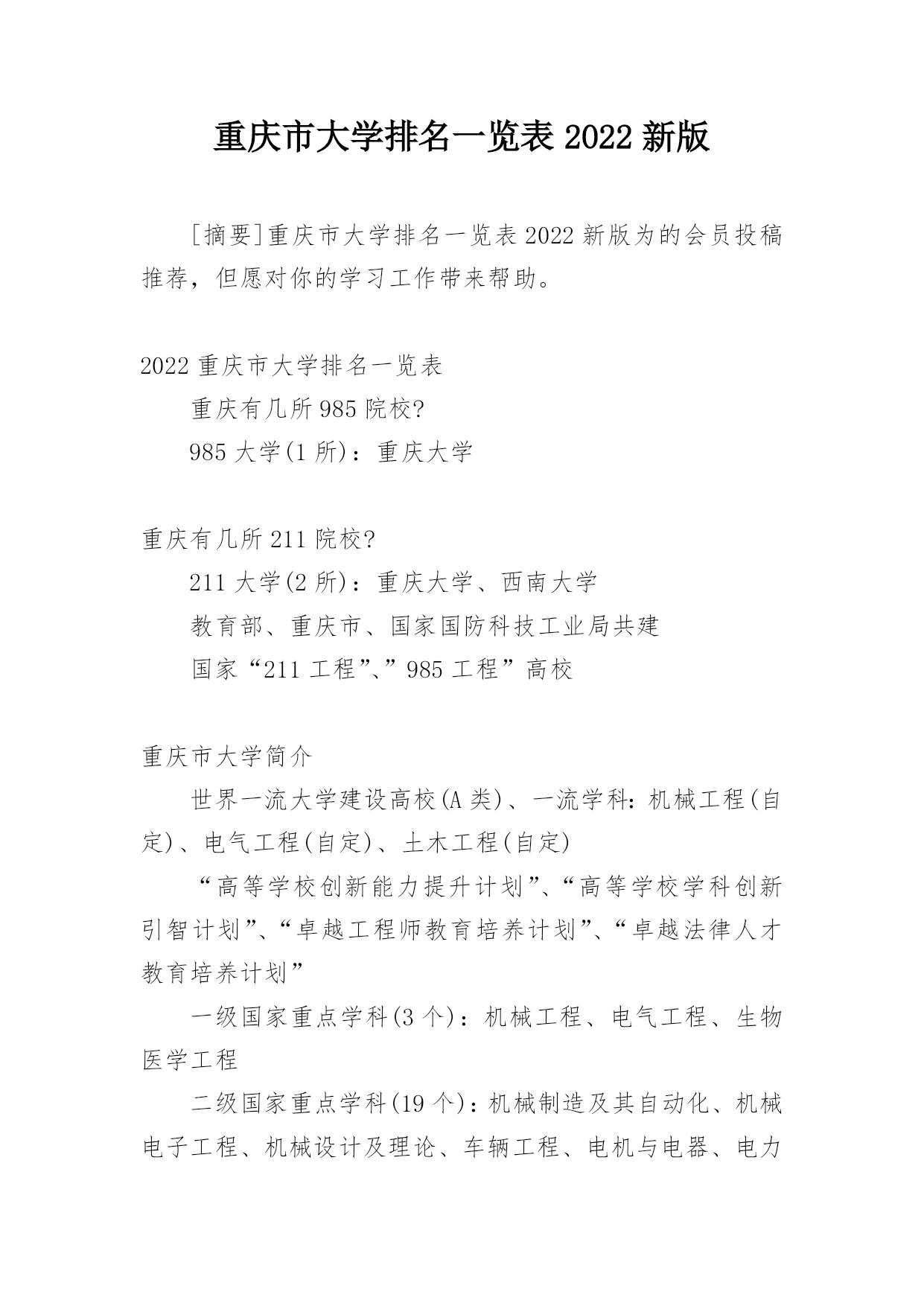 重庆市大学排名一览表2022新版[摘要]重庆市大学排名一览表2022新版为的会员投稿推荐,但愿对你的学习工作带来帮助。2022重庆市大学排名一览表重庆有几所985院校?985大学(1所):重庆大学重庆有几所211院校?211大学(2所):重庆大学、西南大学教育部、重庆市、国家国防科技工业局共建国家“211工程”、”985工程”高校重庆市大学简介世界一流大学建设高校(A类)、一流学科:机械工程(自定)、电气工程(自定)、土木工程(自定)“高等学校创新能力提升计划”、“高等学校学科创新引智计划”、“卓越工程师