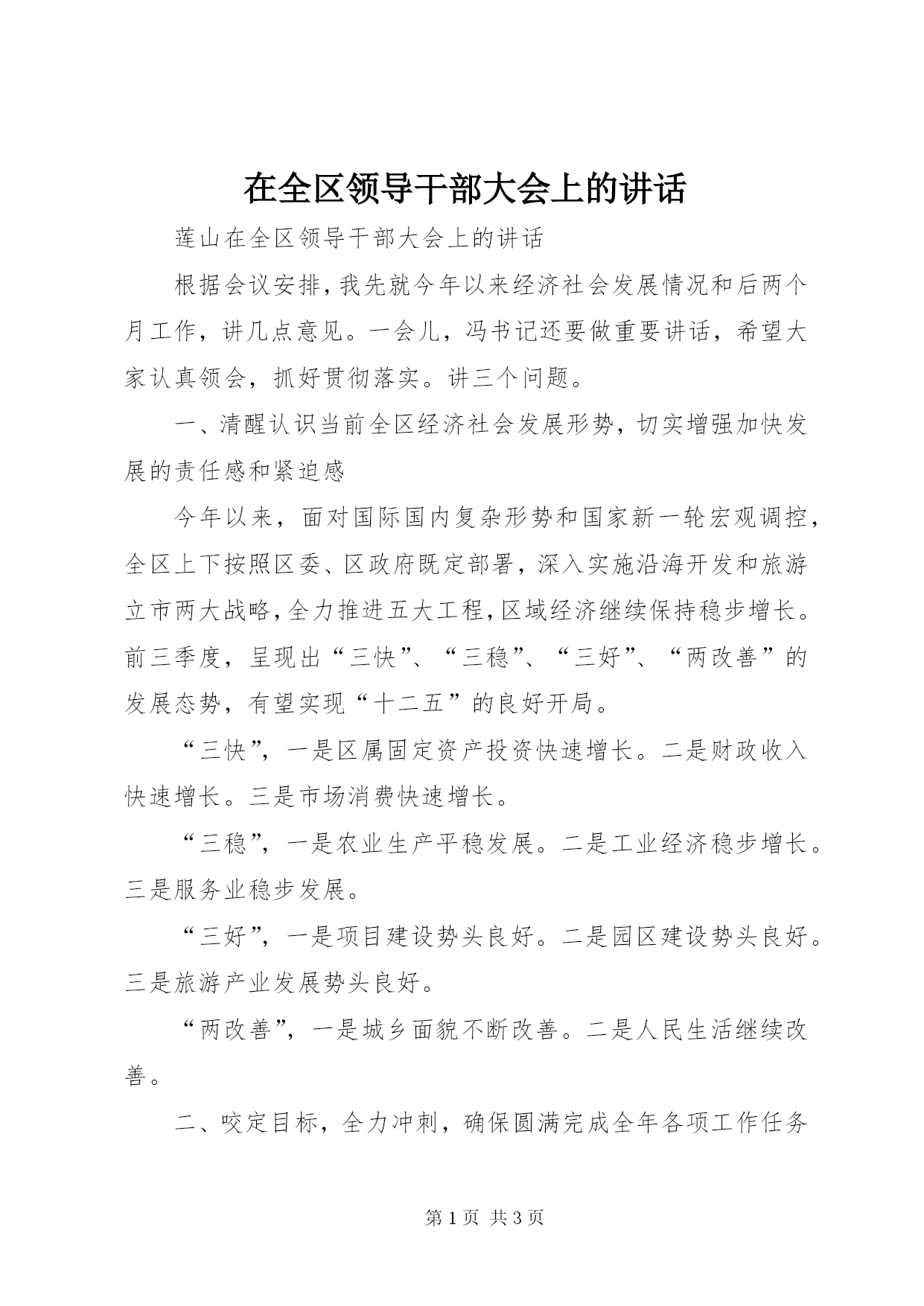 第PAGE\*Arabic\*MERGEFORMAT3页共NUMPAGES\*MERGEFORMAT3页在全区领导干部大会上的讲话莲山在全区领导干部大会上的讲话根据会议安排,我先就今年以来经济社会发展情况和后两个月工作,讲几点意见。一会儿,冯书记还要做重要讲话,希望大家认真领会,抓好贯彻落实。讲三个问题。一、清醒认识当前全区经济社会发展形势,切实增强加快发展的责任感和紧迫感今年以来,面对国际国内复杂形势和国家新一轮宏观调控,全区上下按照区委、区政府既定部署,深入实施沿海开发和旅游立市两大战略,