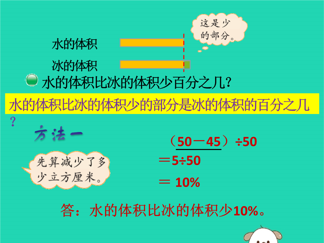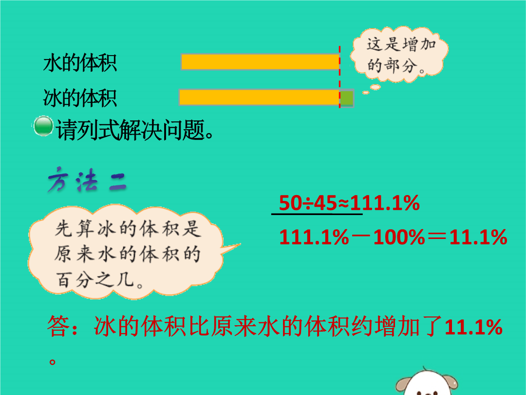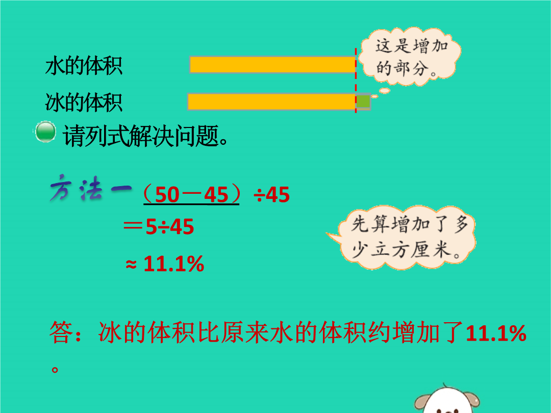 复习准备学习新知冰的体积比原来水的体积约增加了的百分之几?水的体积(50-45)÷4550÷45≈111.1%水的体积水的体积随堂练习教材第1题。1.增加或减少百分之几的问题,可以利用以前学过的分数的知识来解决。(1)今年的粮食产量比去年增加了10%,是把()看成单位“1”。✕基础巩固提升培优思维创新