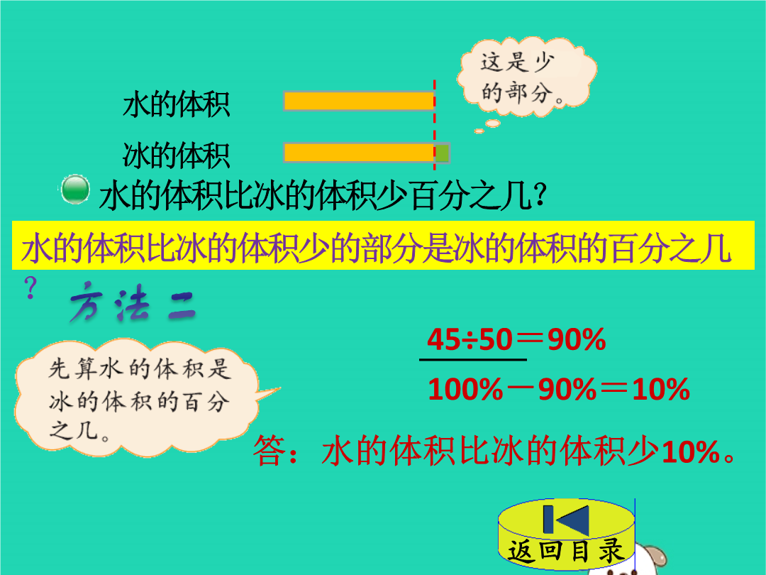 复习准备学习新知冰的体积比原来水的体积约增加了的百分之几?水的体积(50-45)÷4550÷45≈111.1%水的体积水的体积随堂练习教材第1题。1.增加或减少百分之几的问题,可以利用以前学过的分数的知识来解决。(1)今年的粮食产量比去年增加了10%,是把()看成单位“1”。✕基础巩固提升培优思维创新返回目录
