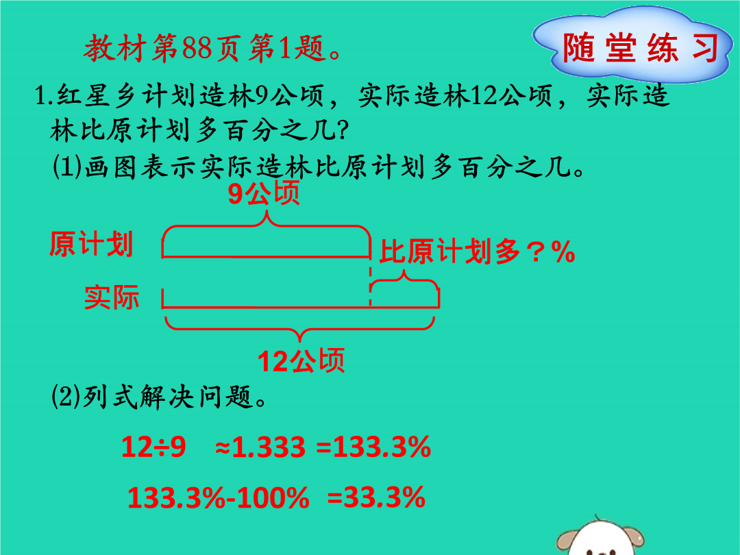 第4课时求一个数比另一个数多或少百分之几中国植树节定于每年的3月12日,是中国为激发人们爱林、造林的热情,促进国土绿化,保护人类赖以生存的生态环境,通过立法确定的节日。在该日,全国各地政府、机关、学校、公司会响应造林的号召,集中举行植树节仪式,从事植树活动。我们原计划造林12公顷,实际造林14公顷。这样的数量关系和分数乘除法问题的数量关系类似。这里是求比原计划多造林的面积是原计划的百分之几。方法一:方法二:2.这个月用电比上个月节约了百分之几?节约了百分之几=节约的用水量÷原来每月的用水量增加了百分之几=