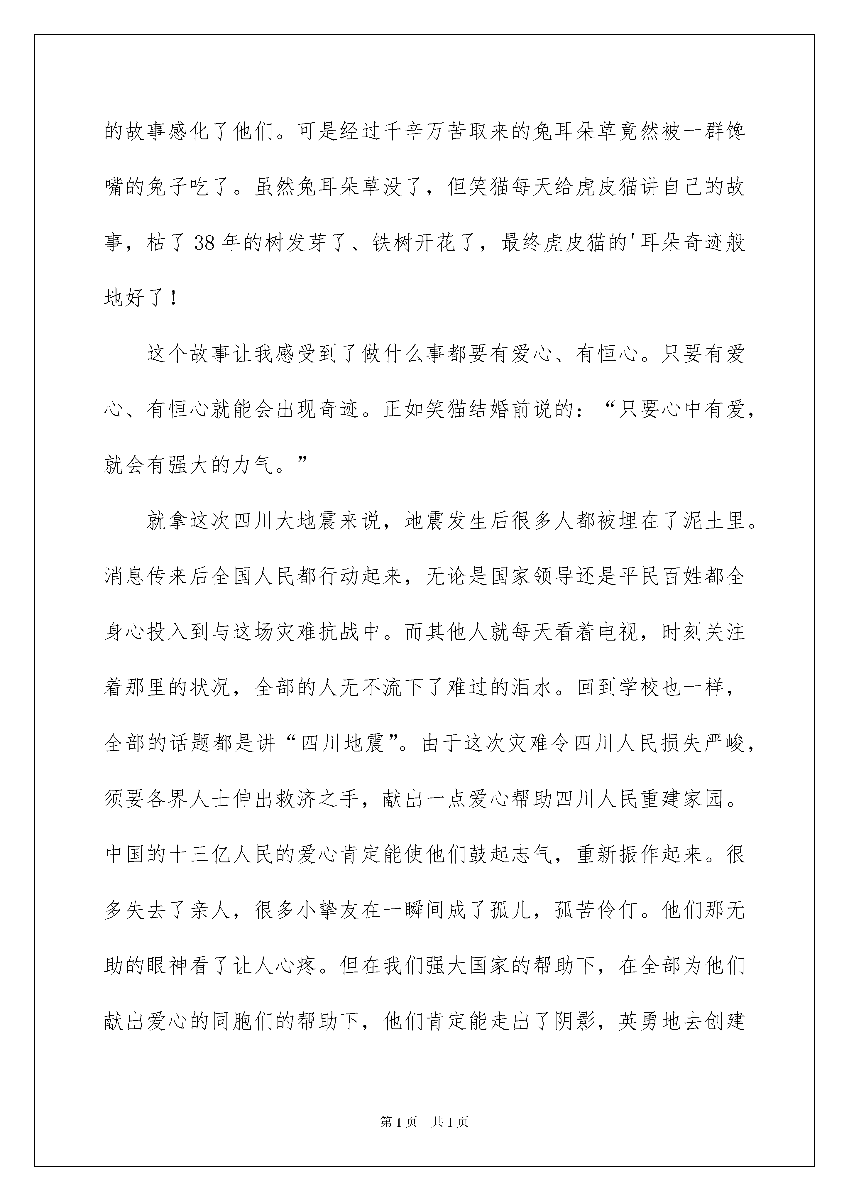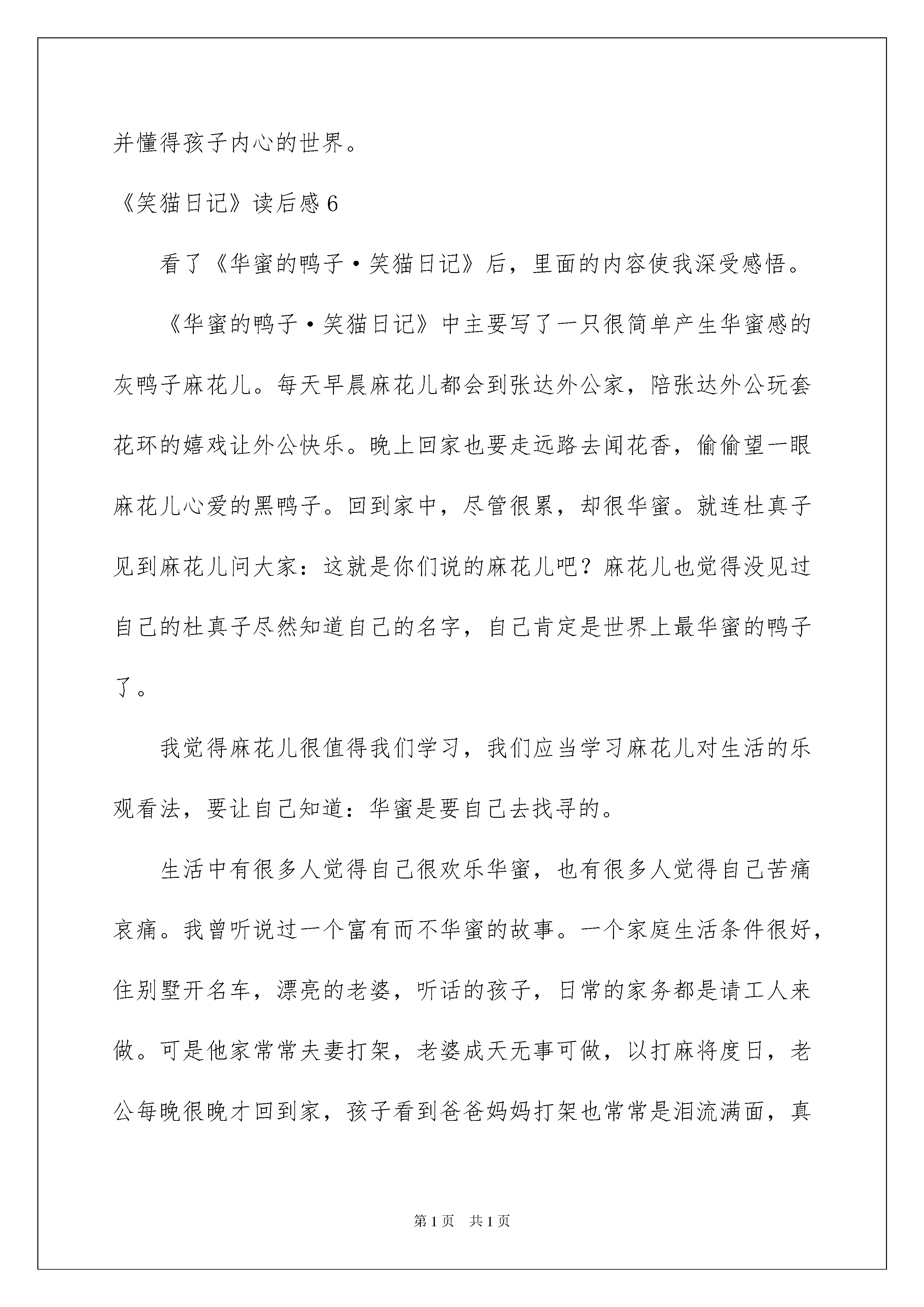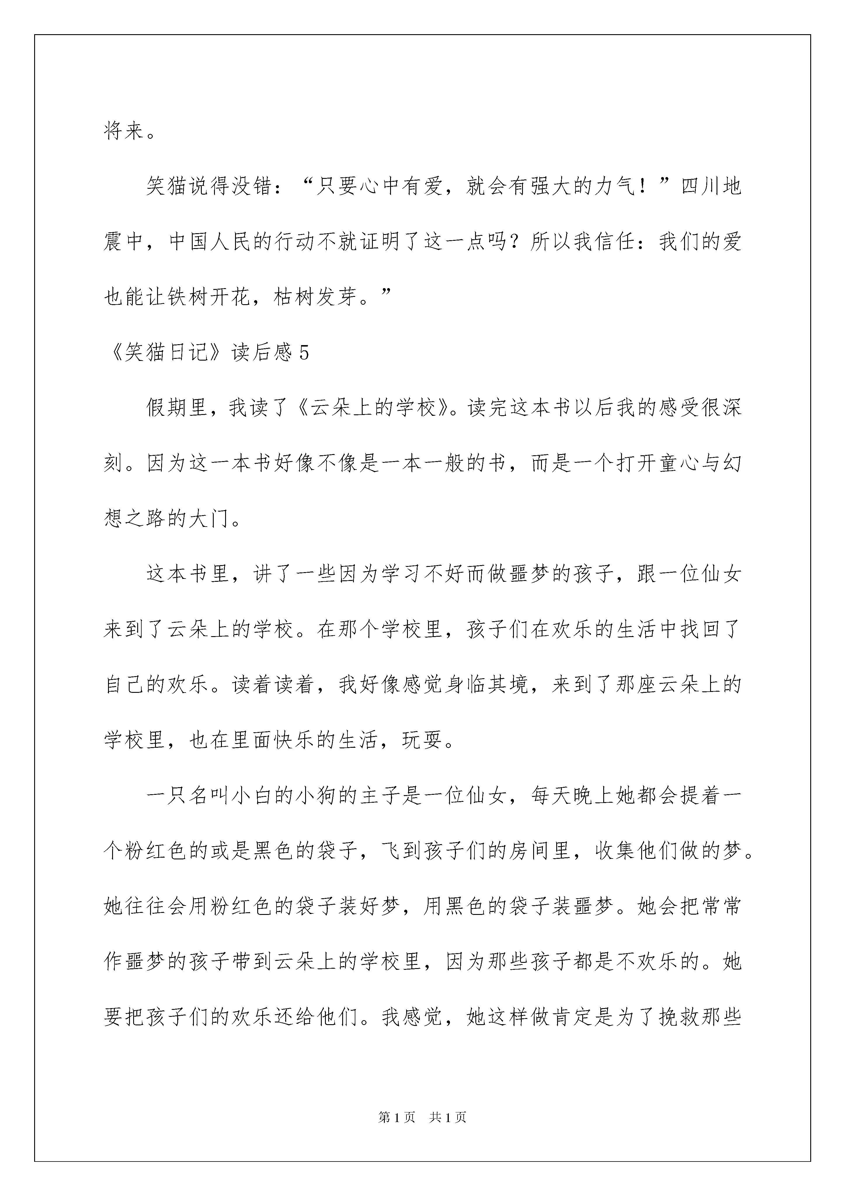 2022《笑猫日记》读后感《笑猫日记》读后感汇编10篇读完一本书以后,大家心中肯定是萌生了不少心得,是时候抽出时间写写读后感了。那么我们该怎么去写读后感呢?以下是我为大家收集的《笑猫日记》读后感,欢迎阅读,希望大家能够喜爱。《笑猫日记》读后感1今日,我阅读的这本书是笑猫日记,我看的这本书是说一只会小的猫:笑猫,在找寻它?心爱的猫:虎皮猫的一个故事。