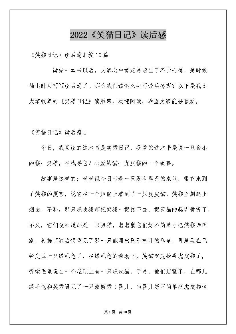 2022笑猫日记读后感笑猫日记读后感15篇一天最终结束了想必有许多难忘的瞬间吧想必是时候写一篇日记了。如何把日记做到重点突出呢?以下是我细心整理的笑猫日记读后感仅供参考欢迎大家阅读。笑猫日记读后感1《笑猫日记——保姆狗的阴