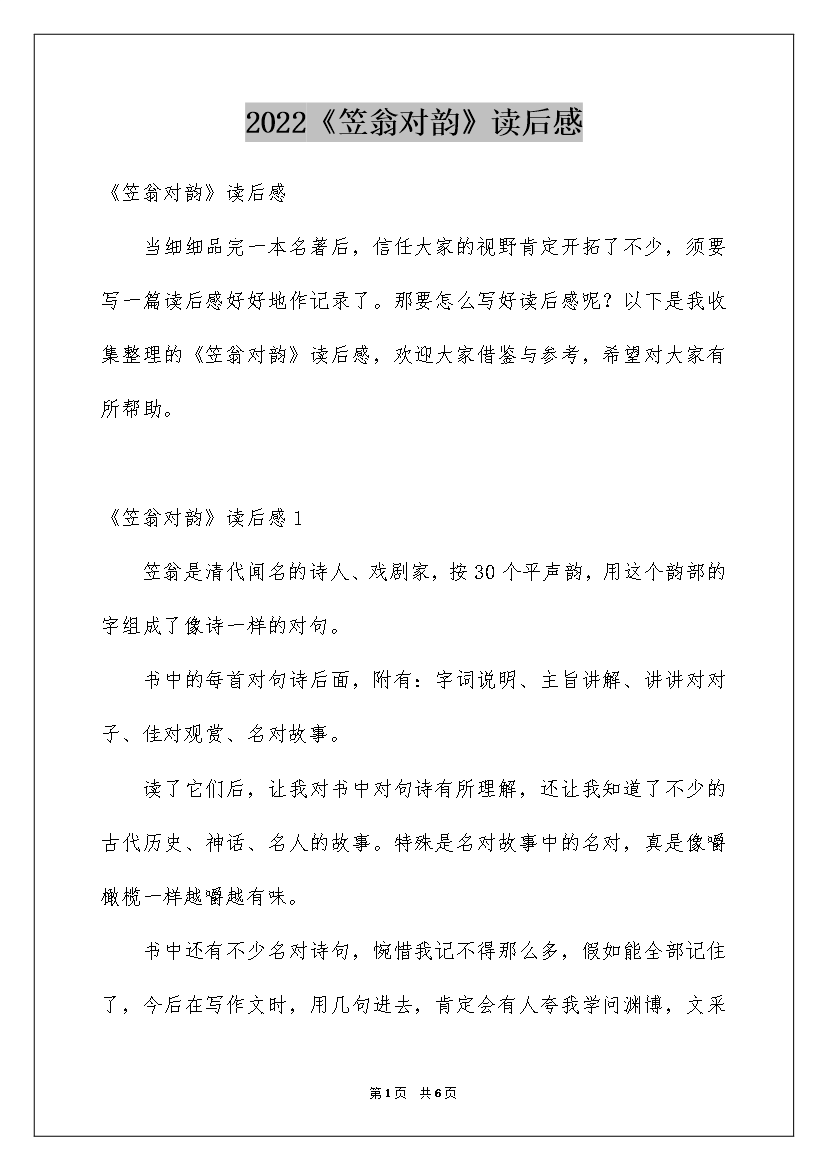 2022《笠翁对韵》读后感《笠翁对韵》读后感当细细品完一本名著后,信任大家的视野肯定开拓了不少,须要写一篇读后感好好地作记录了。那要怎么写好读后感呢?以下是我收集整理的《笠翁对韵》读后感,欢迎大家借鉴与参考,希望对大家有所帮助。《笠翁对韵》读后感1笠翁是清代闻名的诗人、戏剧家,按30个平声韵,用这个韵部的字组成了像诗一样的对句。书中的每首对句诗后面,