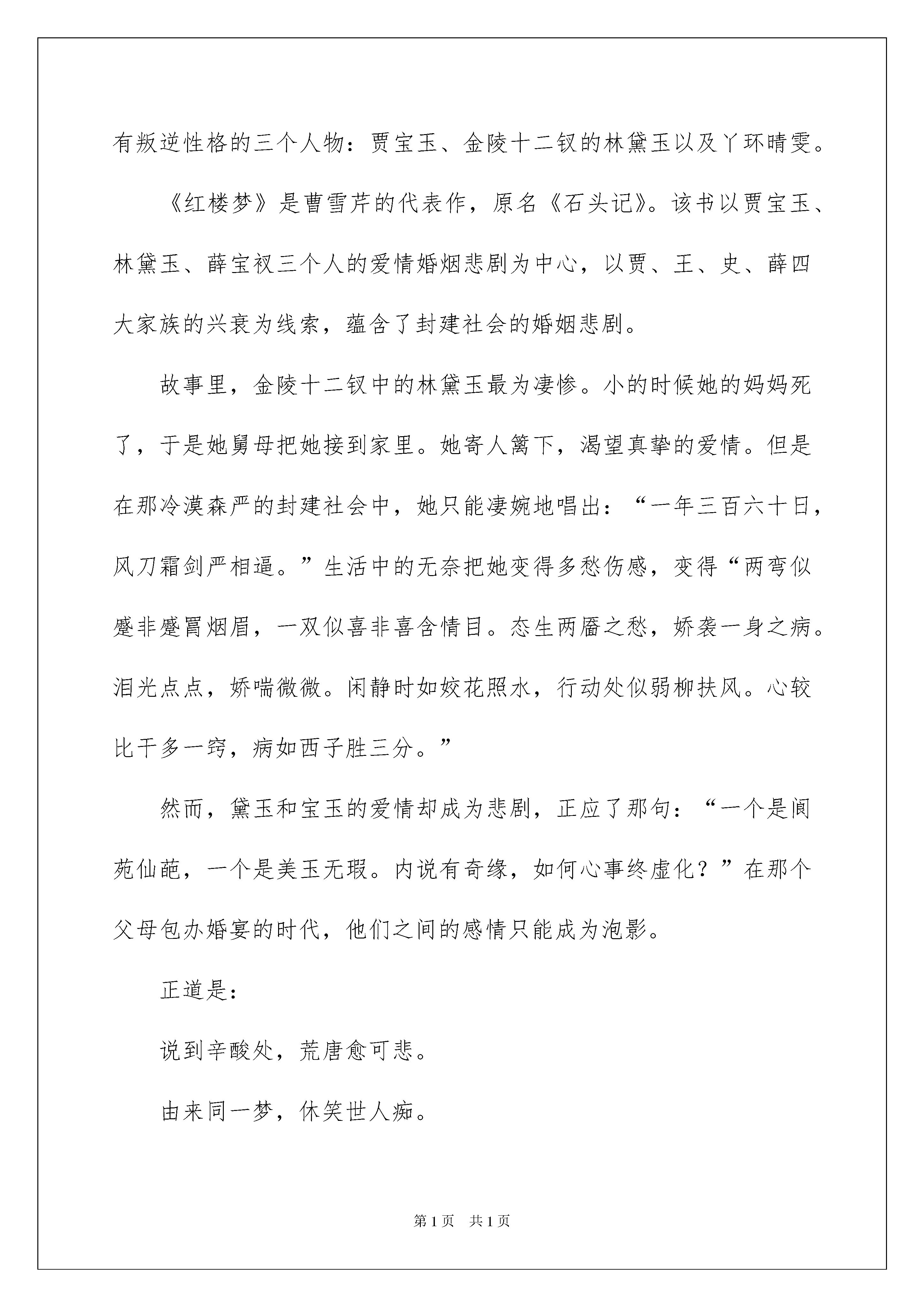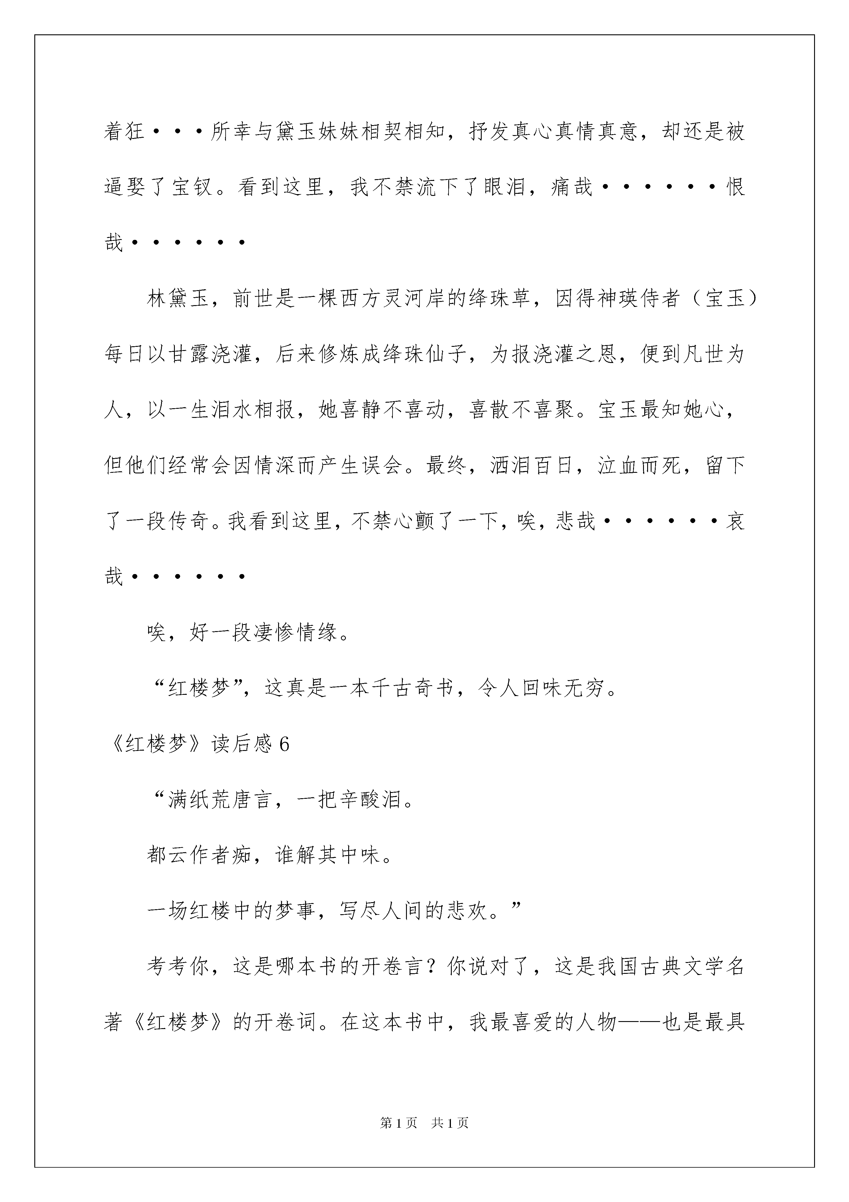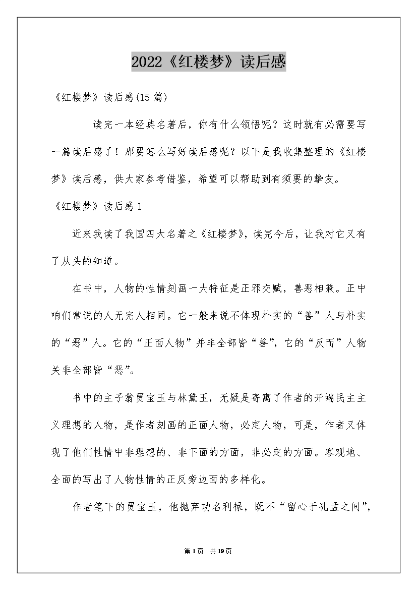 2022红楼梦读后感红楼梦读后感(15篇)当细致品读一部作品后信任大家肯定领悟了不少东西现在就让我们写一篇走心的读后感吧。那么你真的会写读后感吗?下面是我为大家收集的红楼梦读后感希望能够帮助到大家。红楼梦读后感1