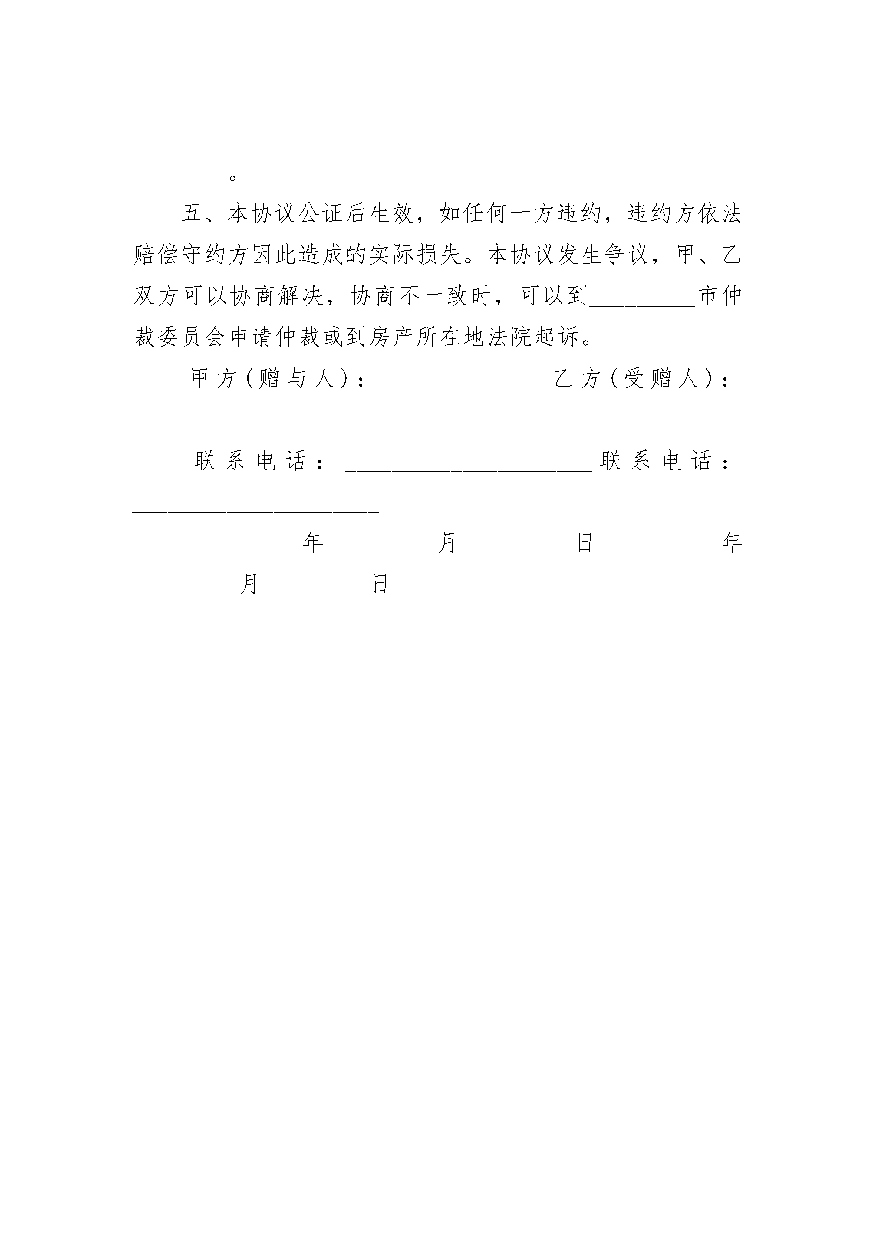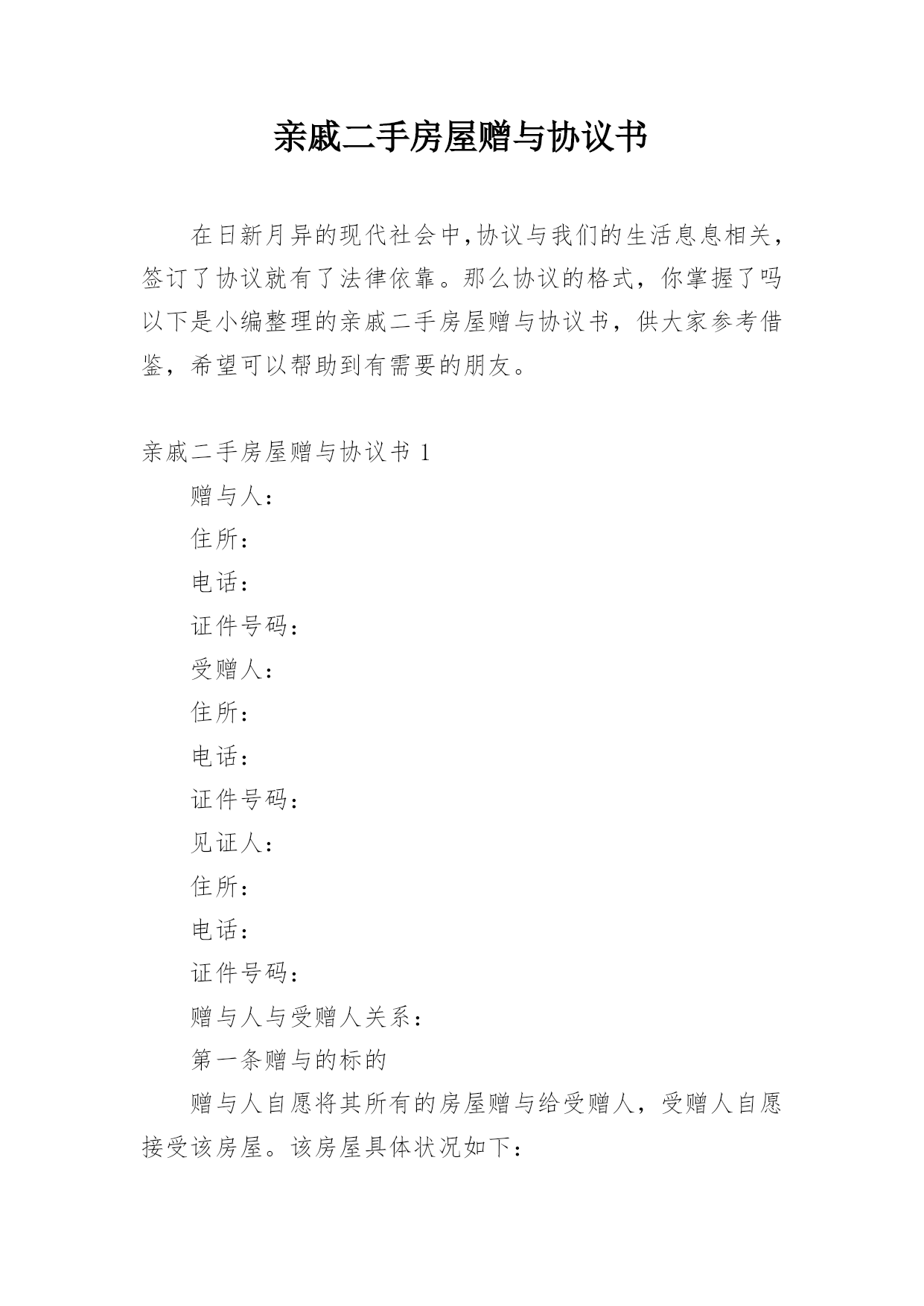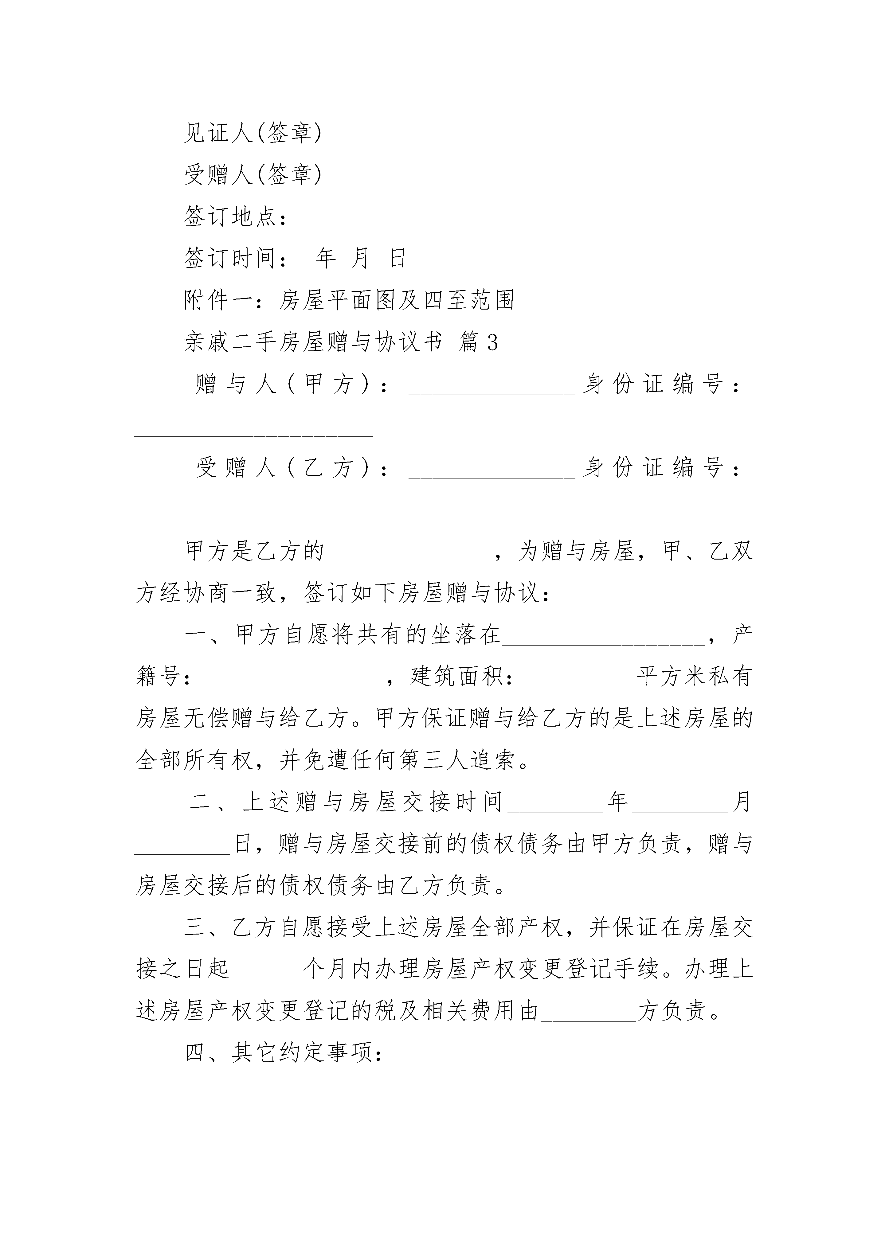亲戚二手房屋赠与协议书亲戚二手房屋赠与协议书(通用3篇)亲戚二手房屋赠与协议书篇1甲方(赠与人):证件号码:住所:联系方式:乙方(受赠人):证件号码:住所:联系方式:共有人:证件号码:住所:联系方式:甲乙双方系关系,甲方自愿将共同所有的不动产房产赠与乙方。按照《中华人民共和国民法典》等有关法律规定,双方自愿达成赠与房产协议如下:一、甲方自愿将其坐落于,建筑面积平方米,产权证号的房屋一套赠与给乙方,乙方自愿接受该房屋。二、甲、乙双方确认,虽然房屋所有权证未作记载,但依法对该房屋享有共有权的权利人均已同意