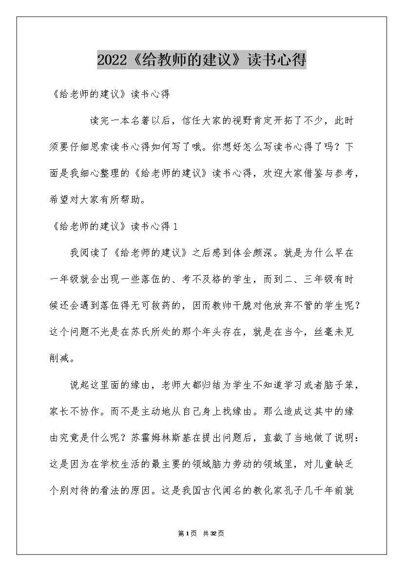 2022《给教师的建议》读书心得《给老师的建议》读书心得读完一本名著以后,信任大家的视野肯定开拓了不少,此时须要仔细思索读书心得如何写了哦。你想好怎么写读书心得了吗?下面是我细心整理的《给老师的建议》读书心得,欢迎大家借鉴与参考,希望对大家有所帮助。《给老师的建议》读书心得1我阅读了《给老师的建议》之后感到体会颇深。就是为什么早在一年级就会出现一些落