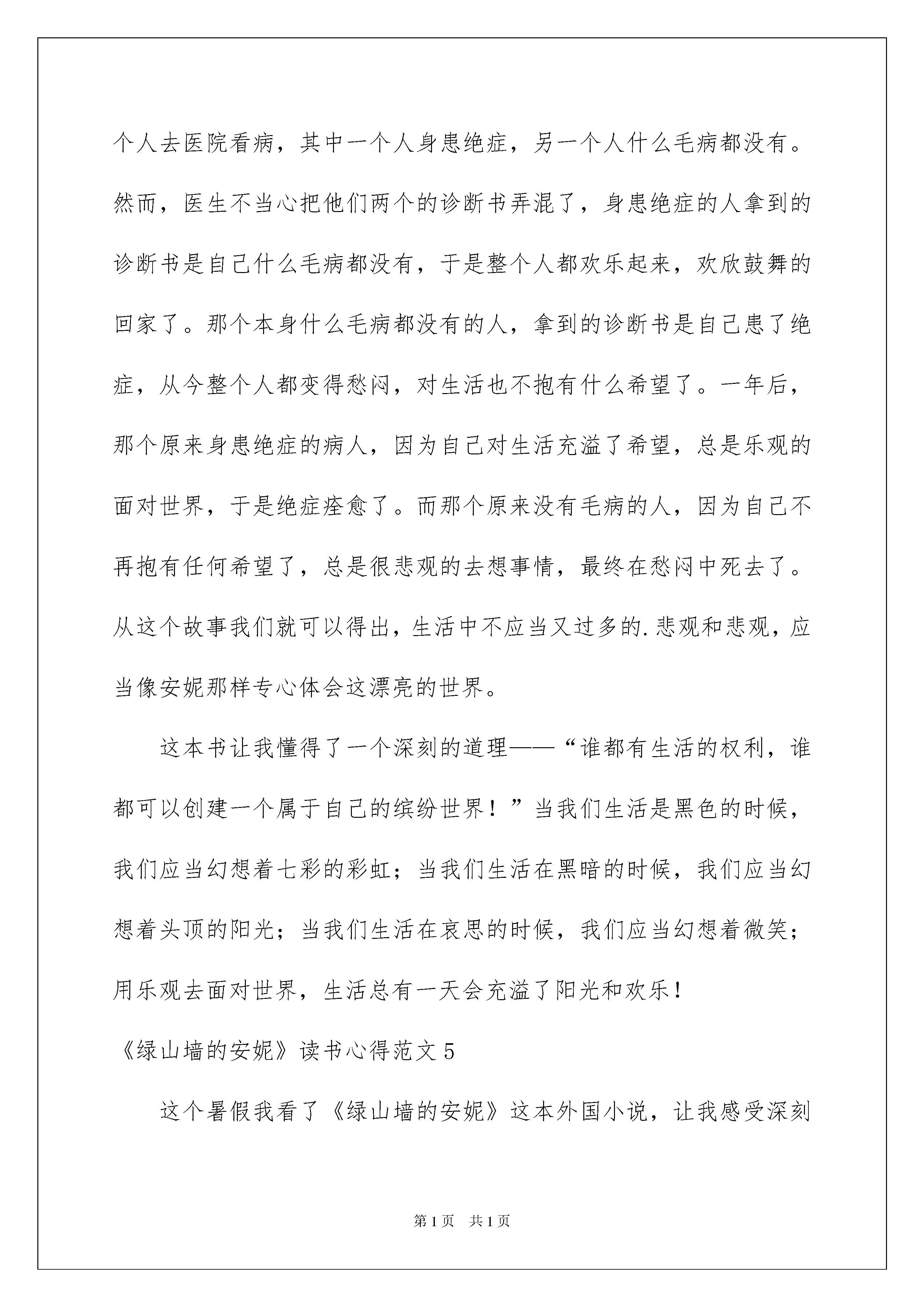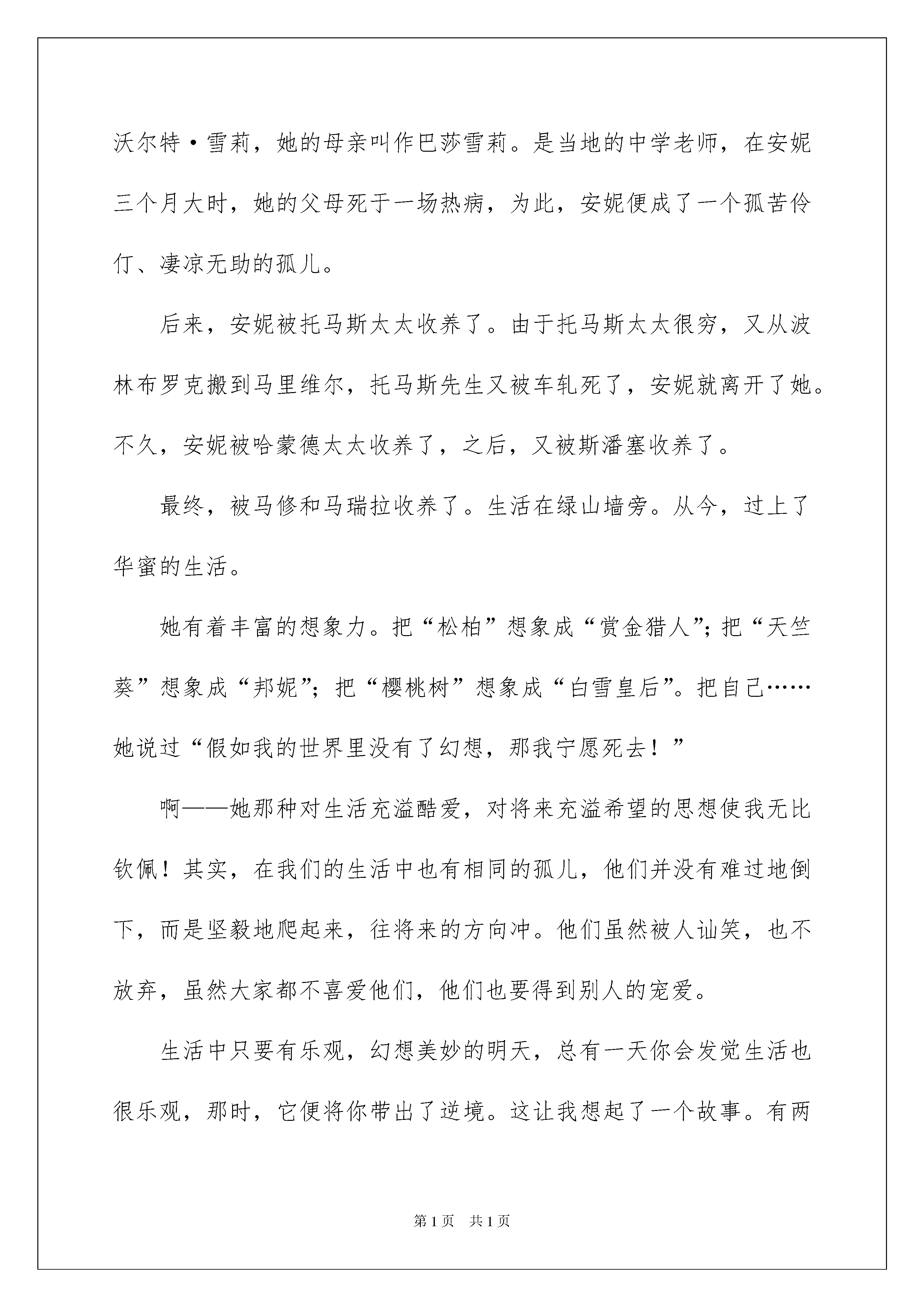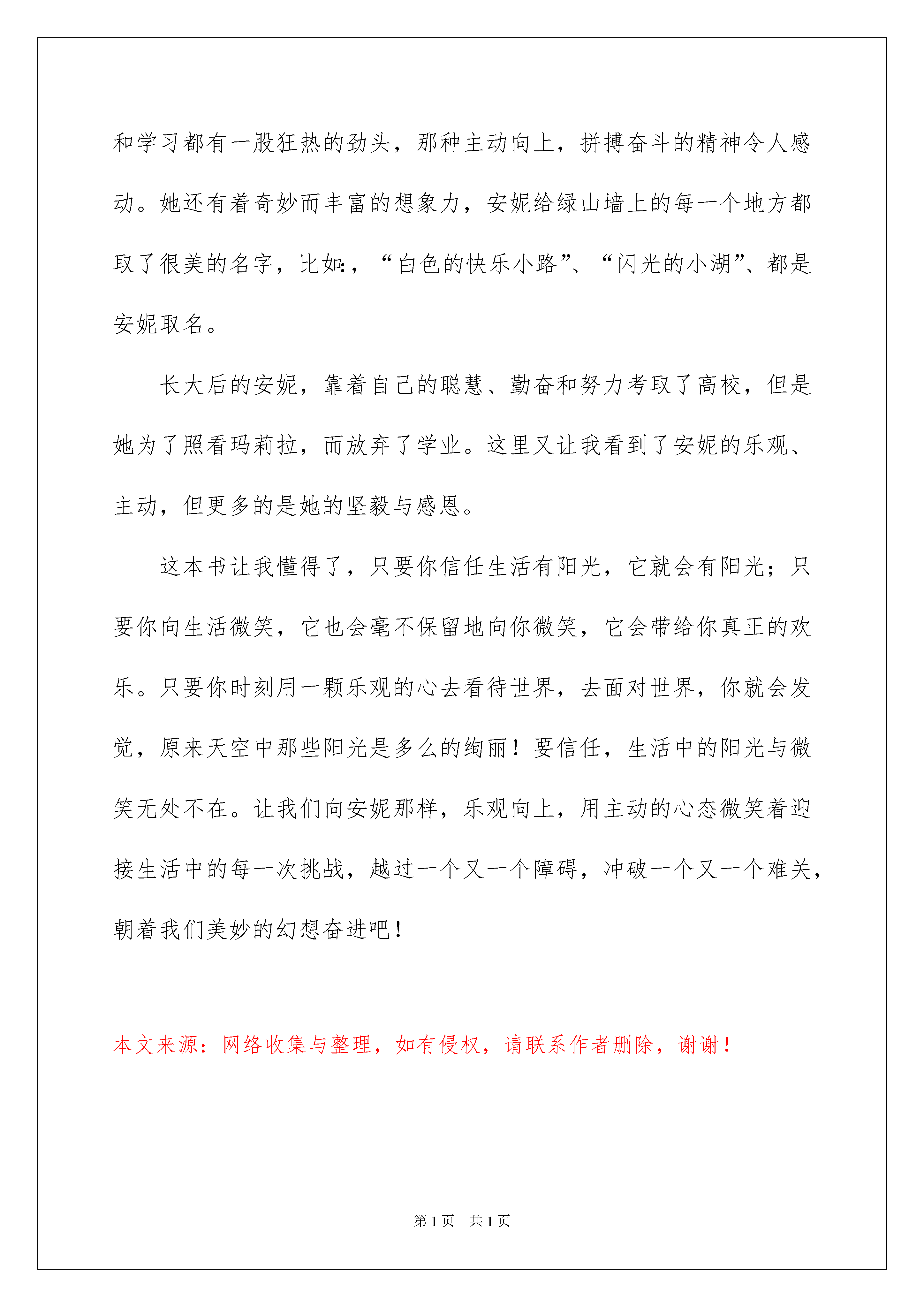 绿山墙的安妮读书心得绿山墙的安妮读书心得汇编15篇当我们有一些感想时,应该马上记录下来,写一篇心得体会,这样可以帮助我们总结以往思想、工作和学习。相信许多人会觉得心得体会很难写吧,以下是小编精心整理的绿山墙的安妮读书心得,仅供参考,欢迎大家阅读。绿山墙的安妮读书心得1暑假里,我读了一本很厚的书:安妮在很小的时候父母就双亡了,只留下了孤单可怜的安妮。她一直住在孤儿院里。她长得极其平凡:一双毫无生气的小眼睛;瘦得不能再瘦的小身子不堪一击;令她最不满意的是一头红色的头发,不过她最喜欢自己那只微微上翘的鼻子。自从